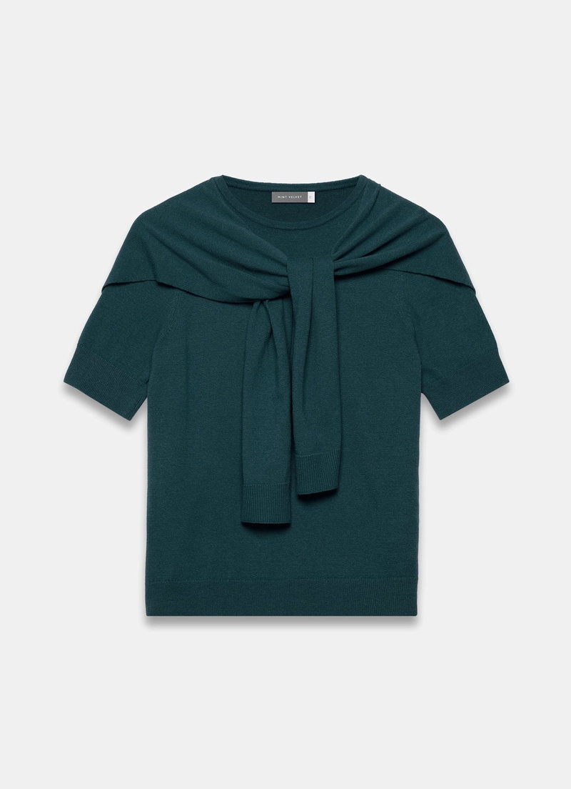Teal tone top with a crew neckline, short sleeves and layered non-detachable scarf detail.