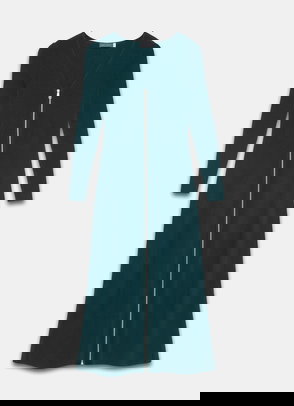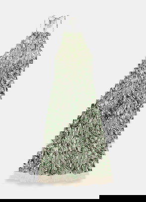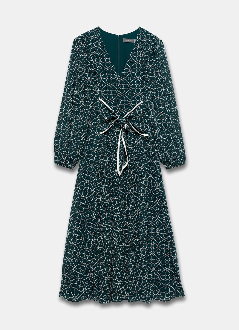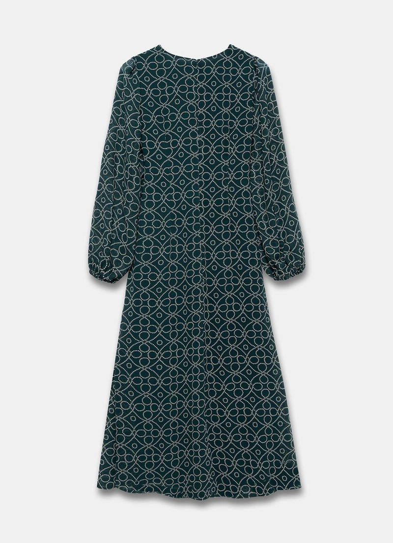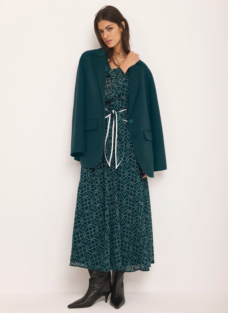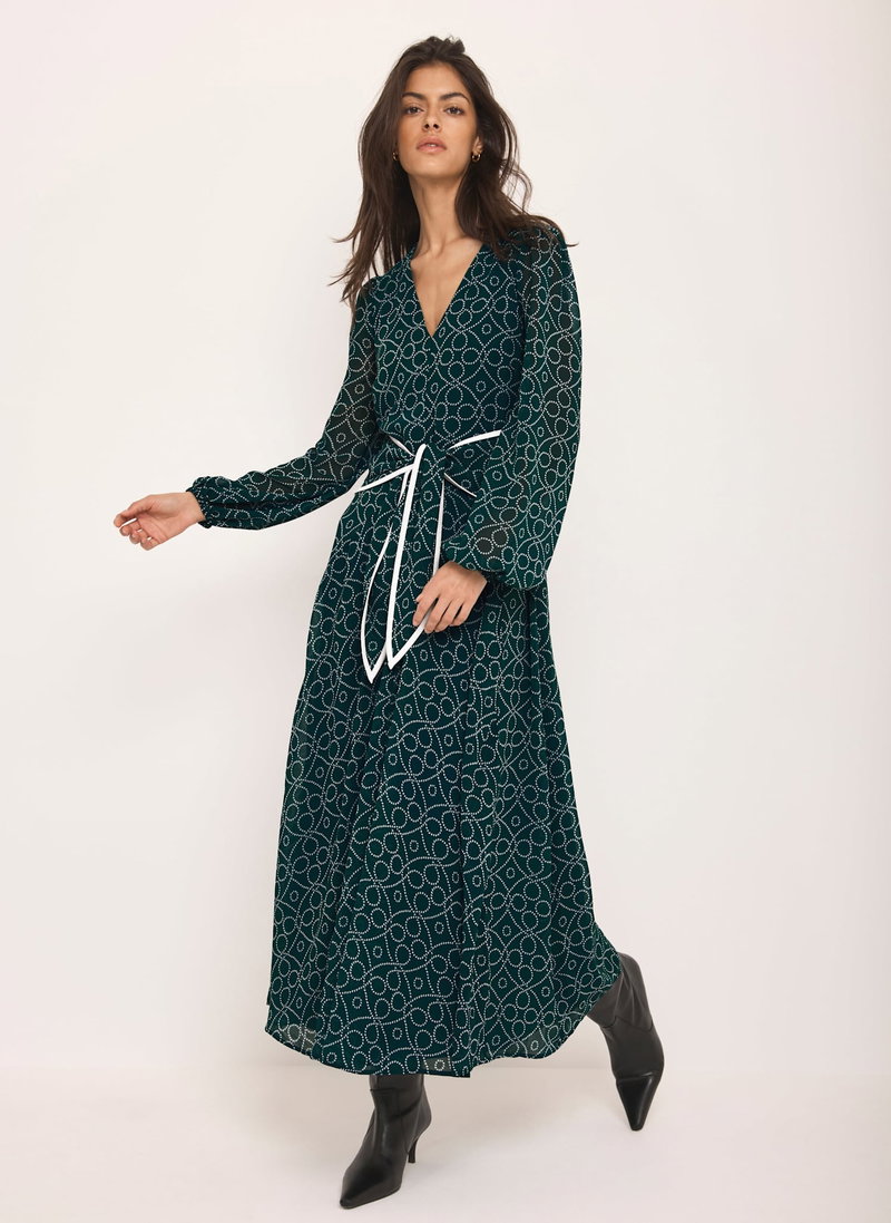Teal printed dress in a maxi silhouette featuring a V-neckline, long sleeves, elasticated cuffs, tie waist with a zip fastening through the back.