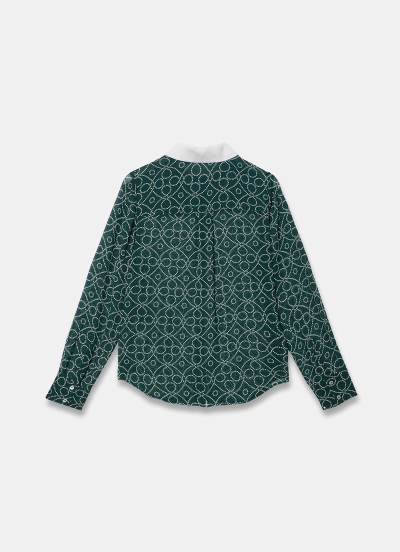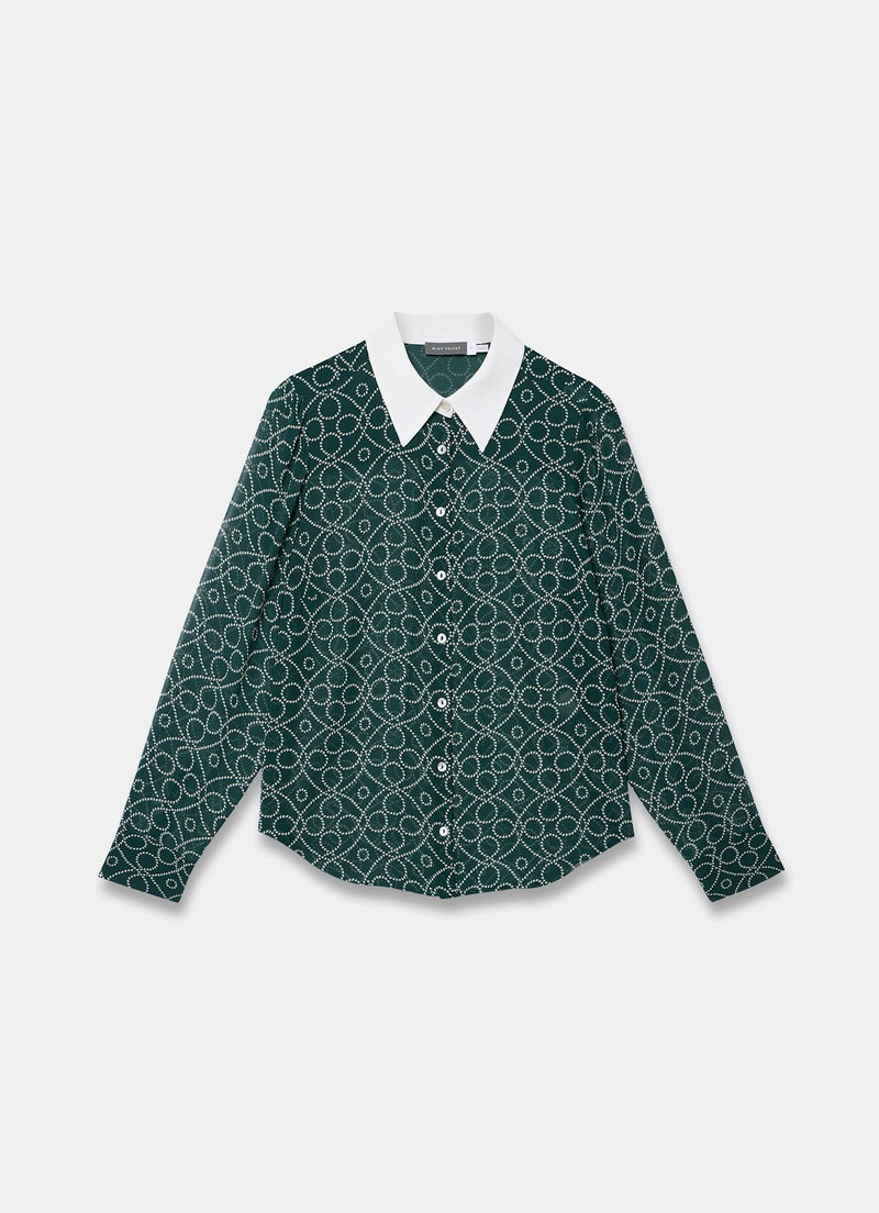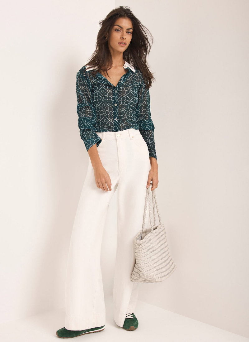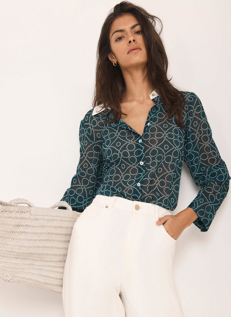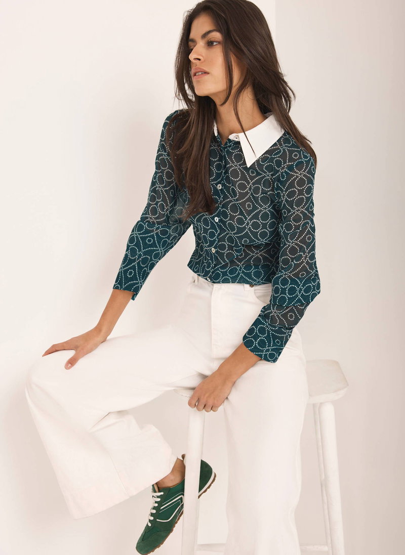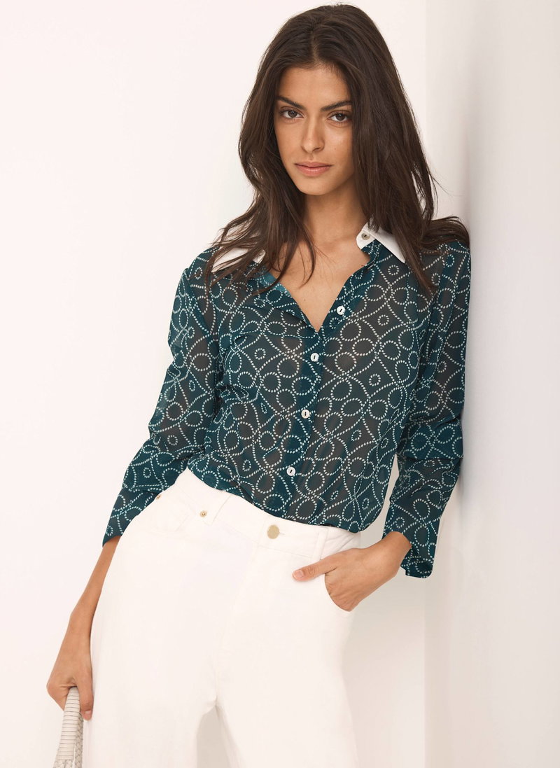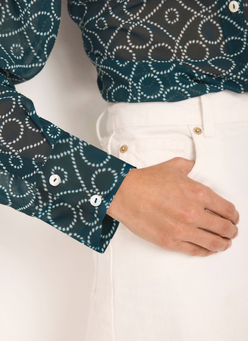 Teal printed sheer shirt featuring a contrast classic collar, long sleeves, buttoned cuffs, scooped hemline with a button fastening through the front.