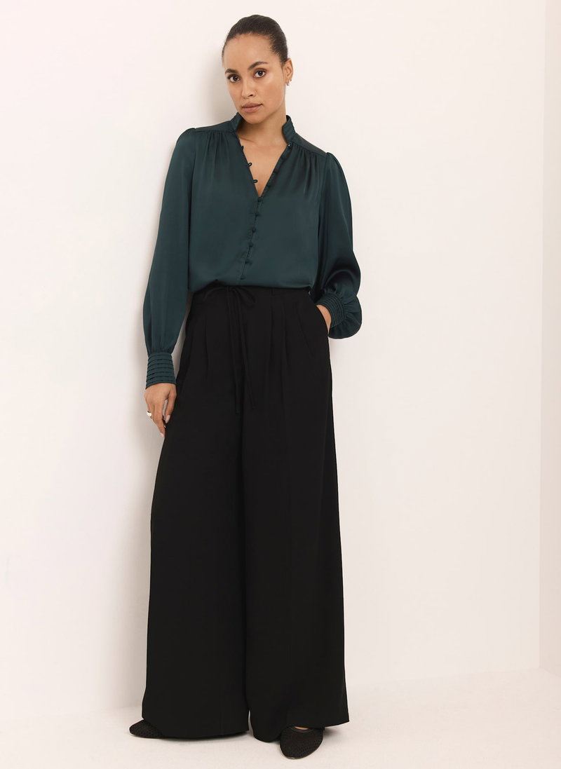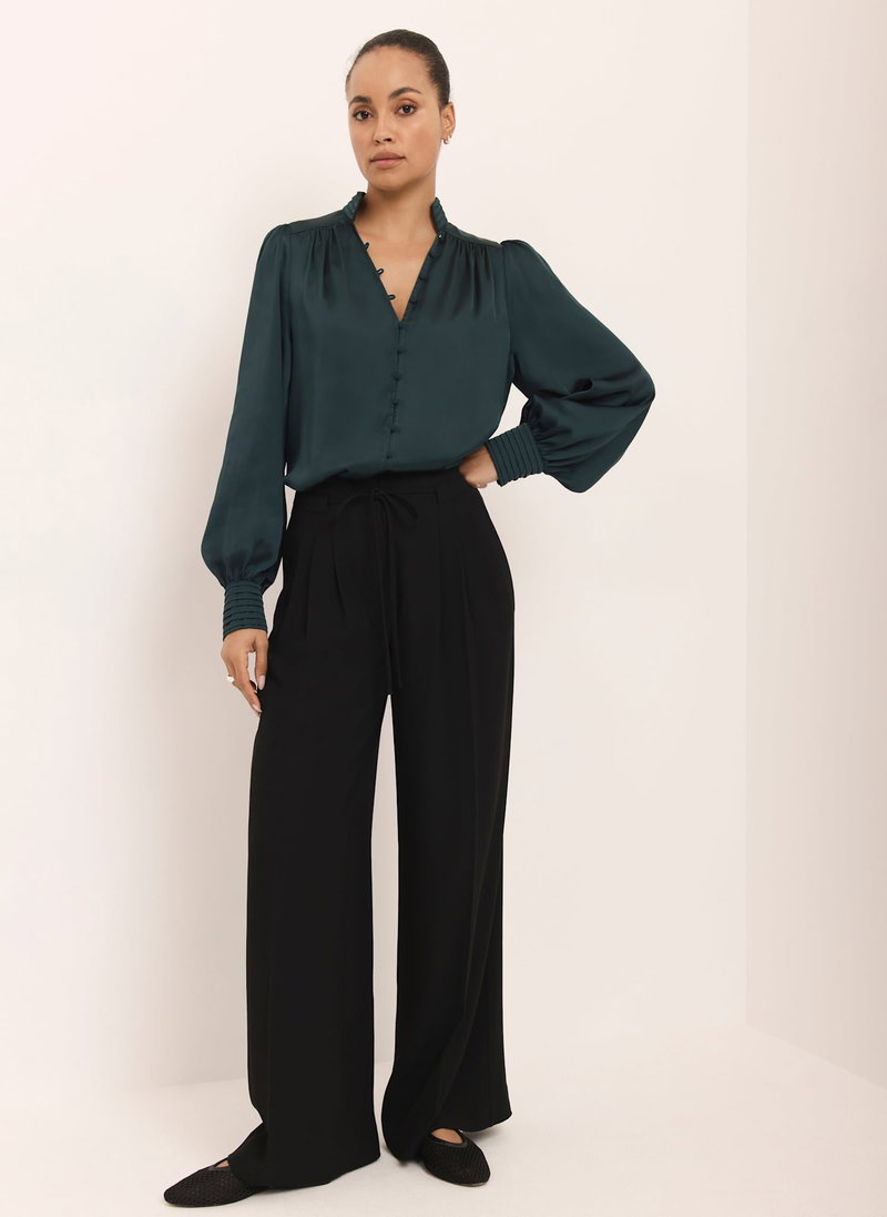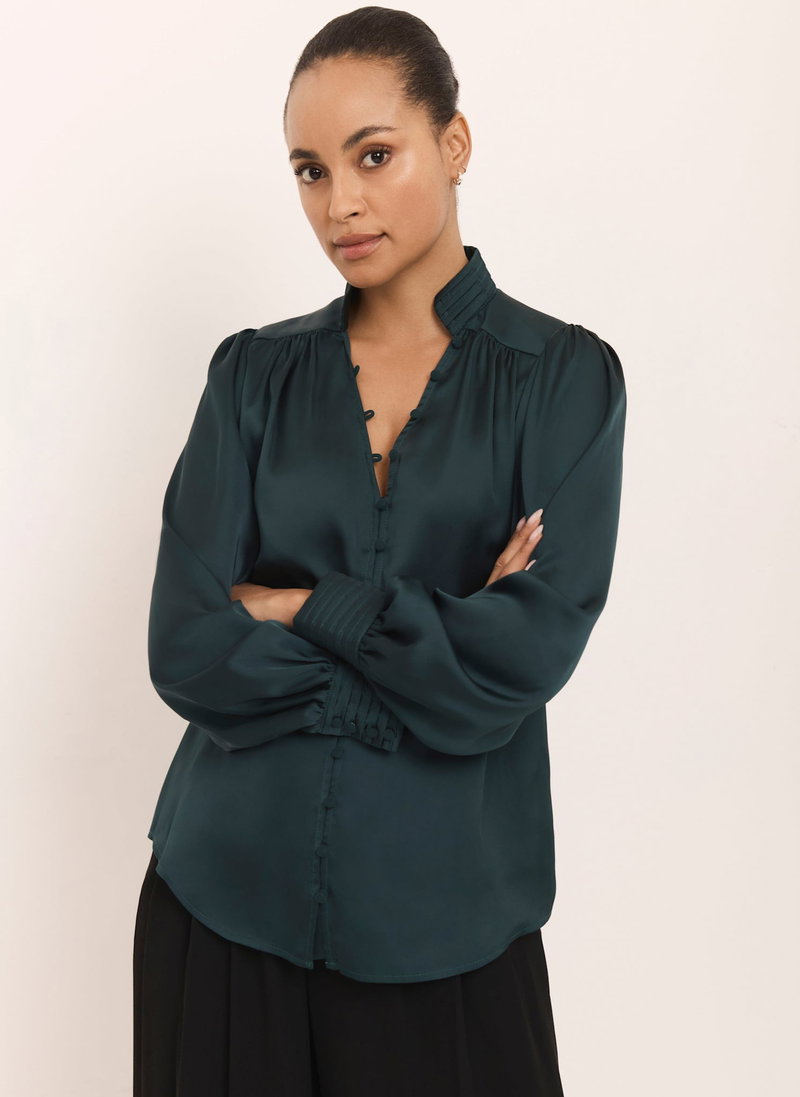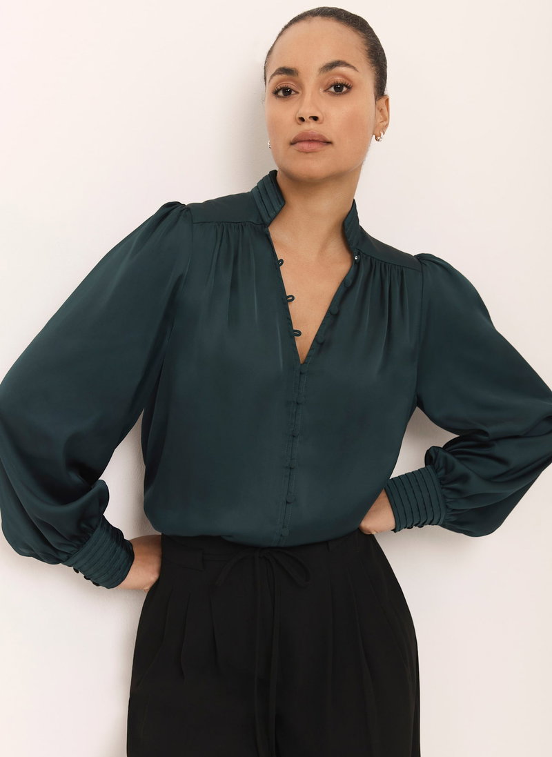 Teal blouse featuring a V-neckline, pin-tuck trim, long sleeves, buttoned cuffs, curved hemline with a button fastening through the front.