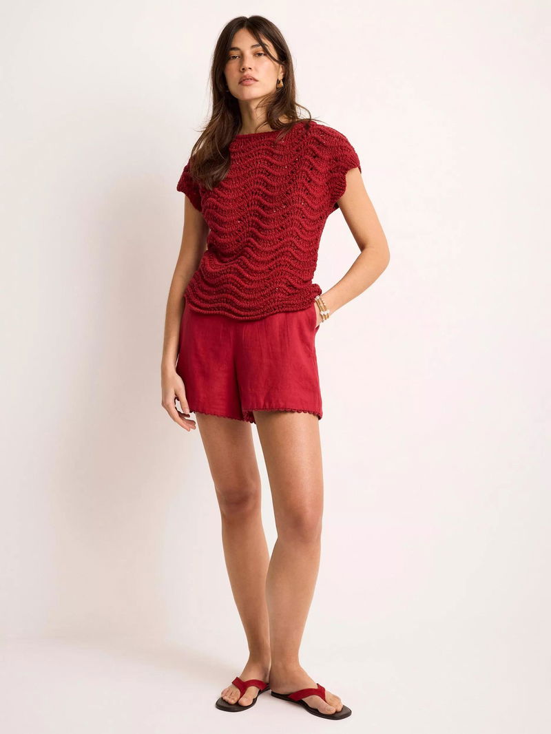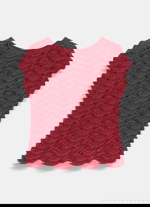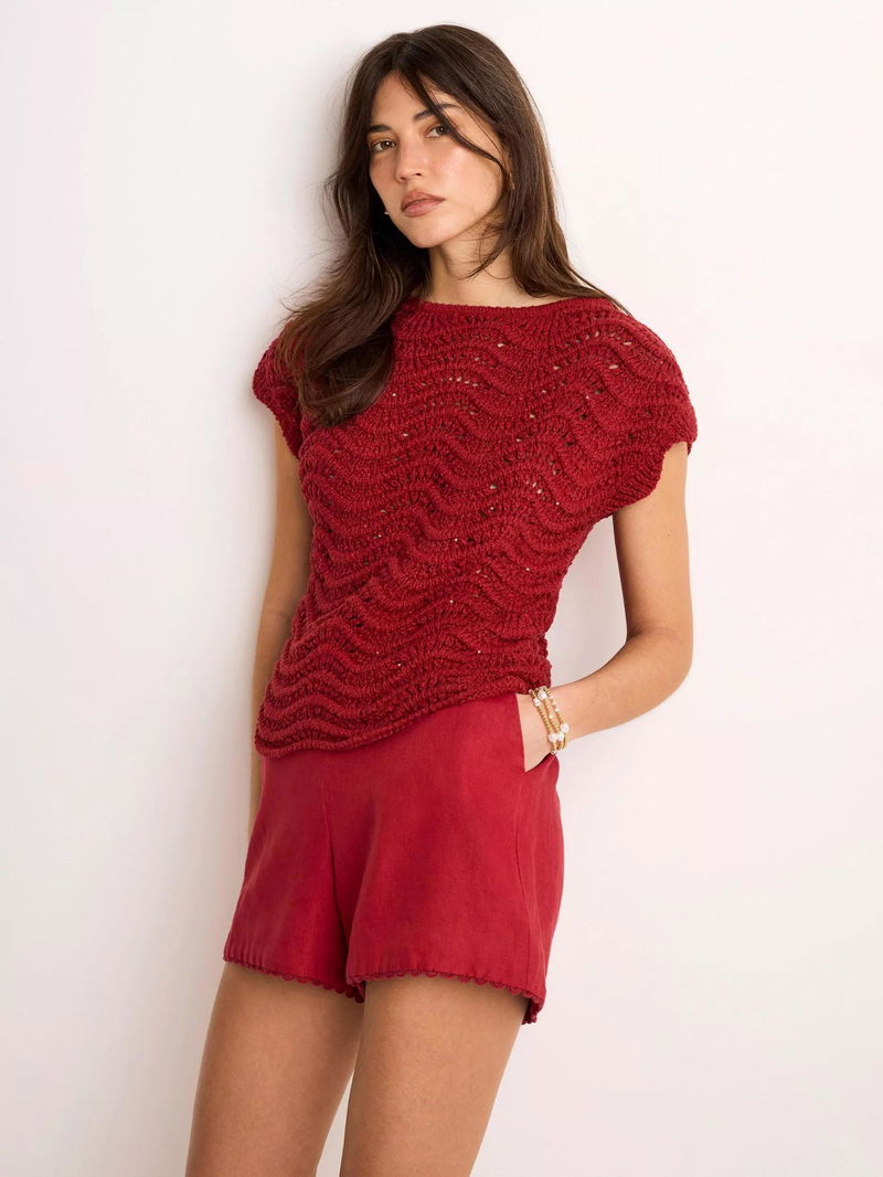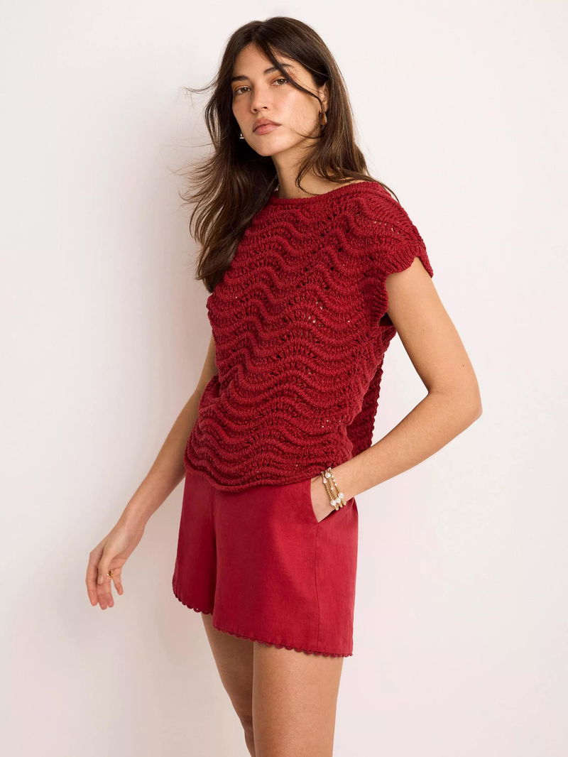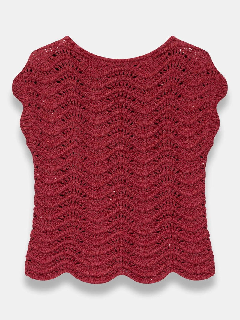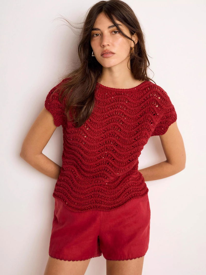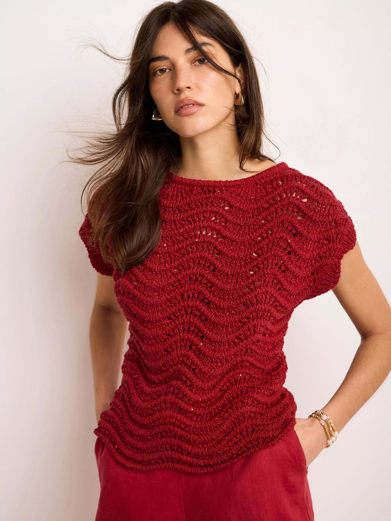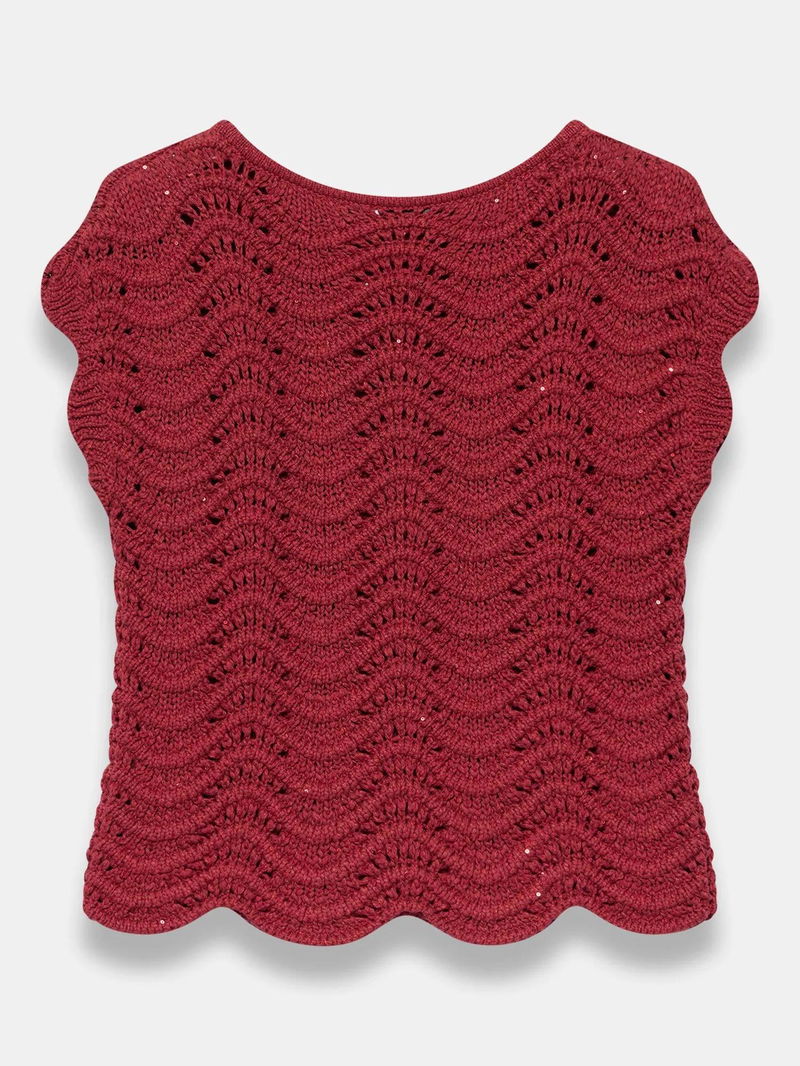 An open knit top featuring a crew neckline, cap sleeves, scallop hemline and sequin embellishment.