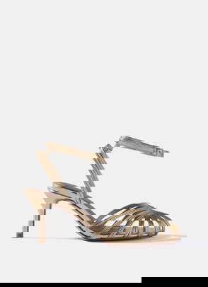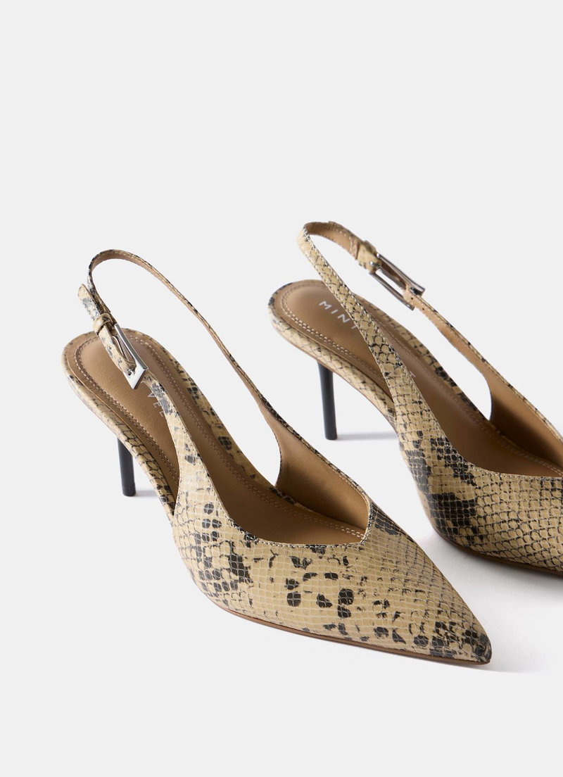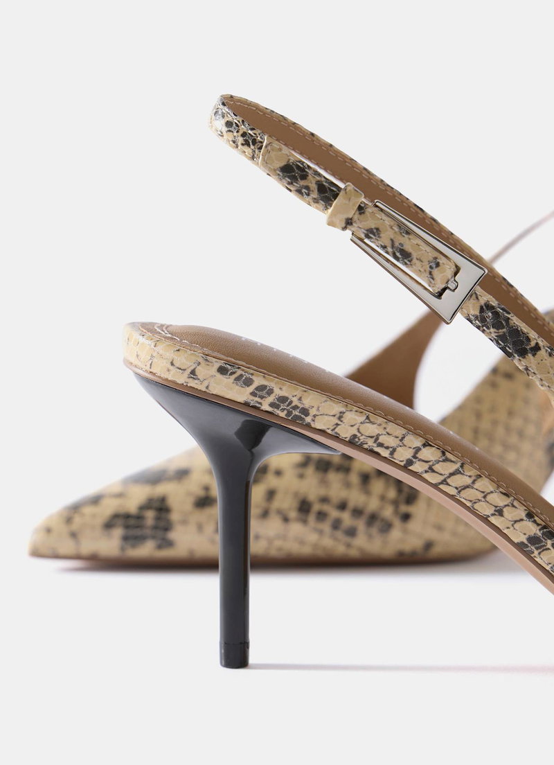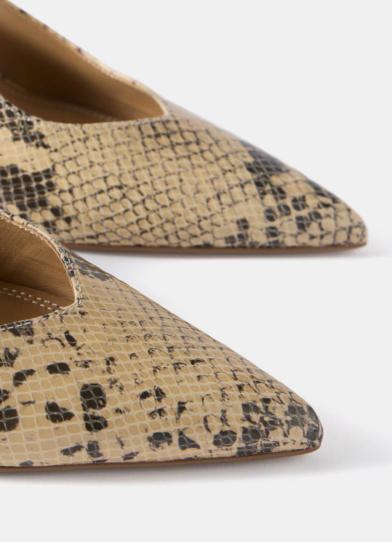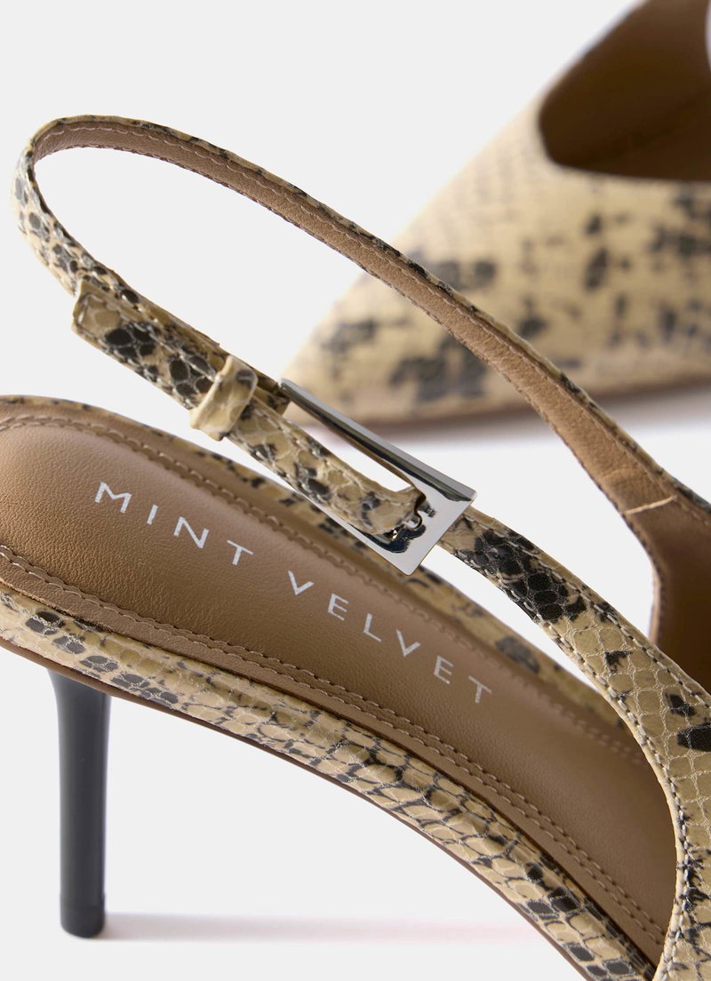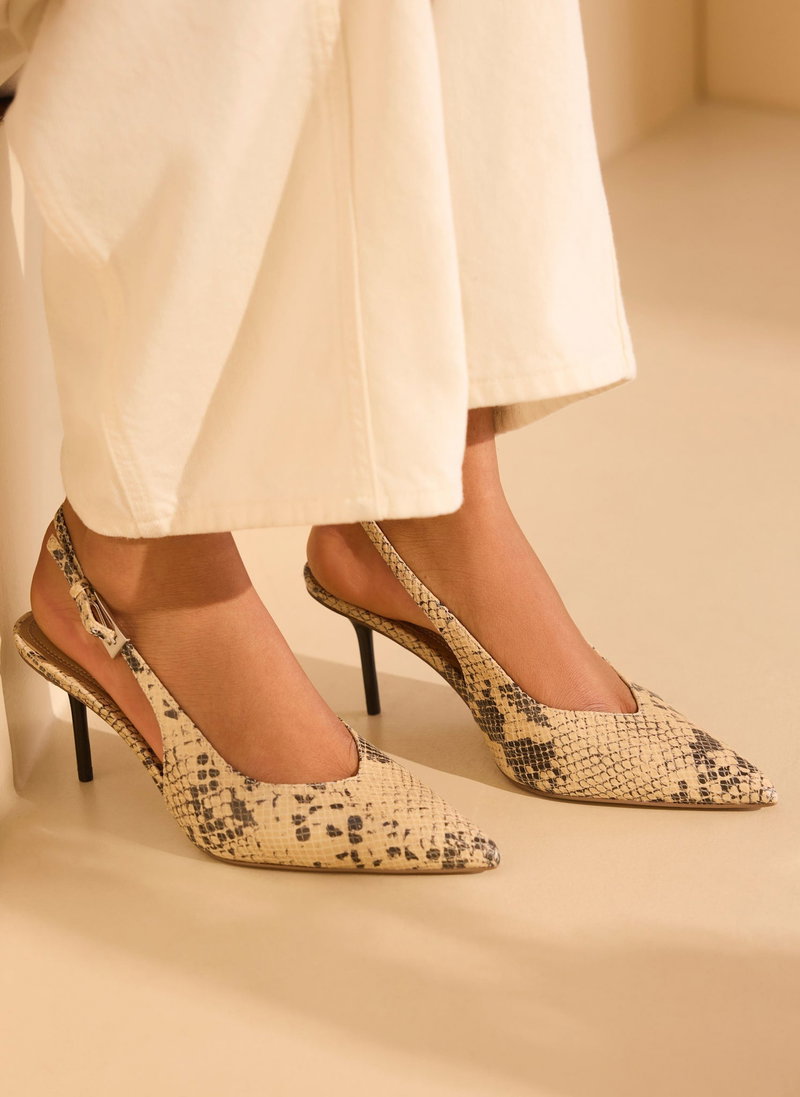 Neutral tone snake print shoes featuring a pointed toe, mid heel and sling back buckle fastening.