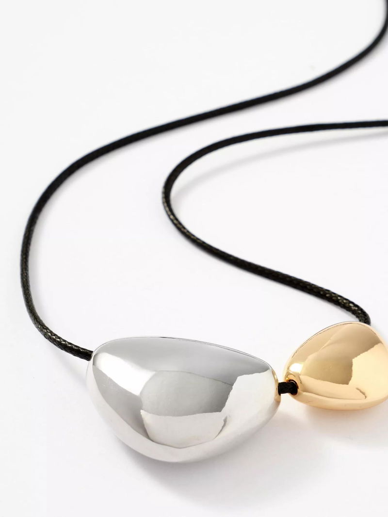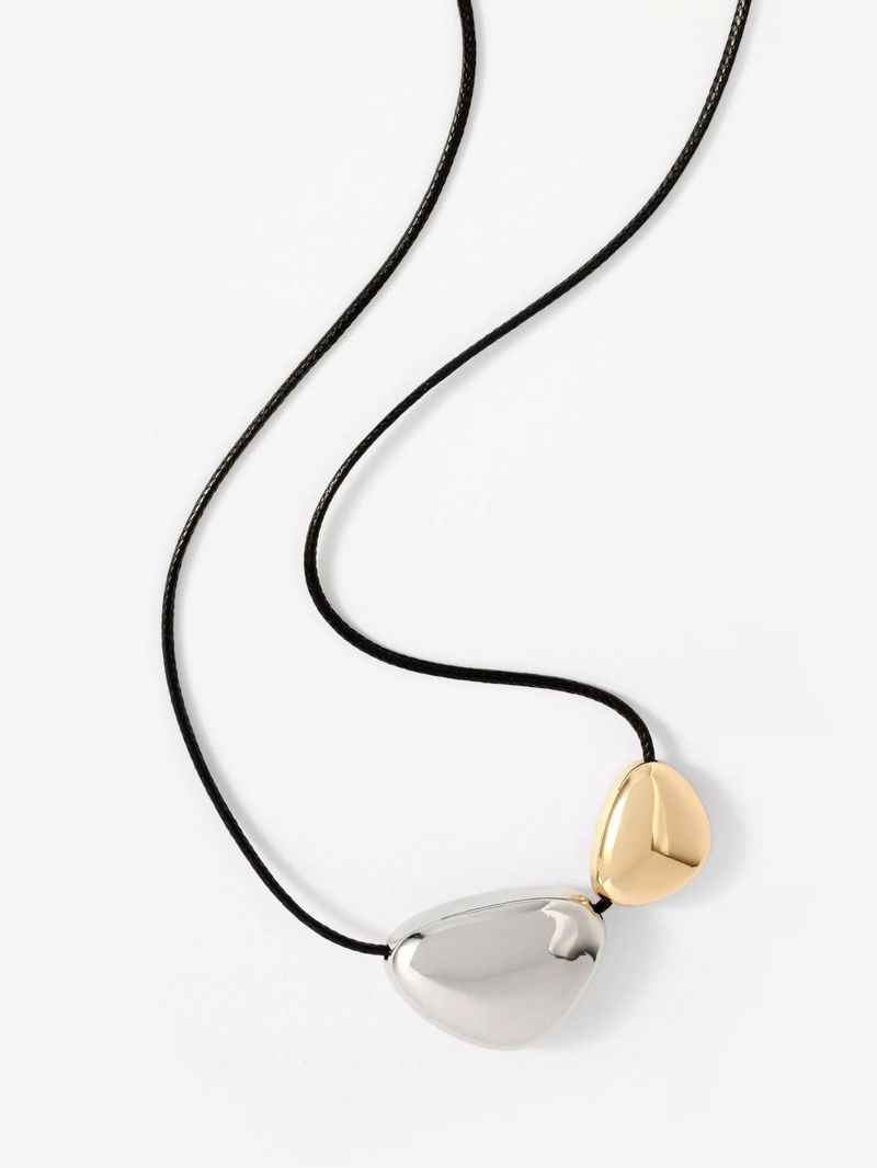 A sophisticated mixed-metal pendant necklace featuring gold and silver-toned rope detailing. This versatile piece includes an adjustable charm fastening.