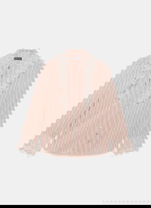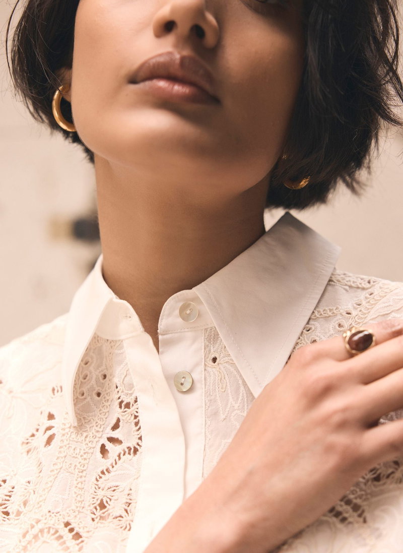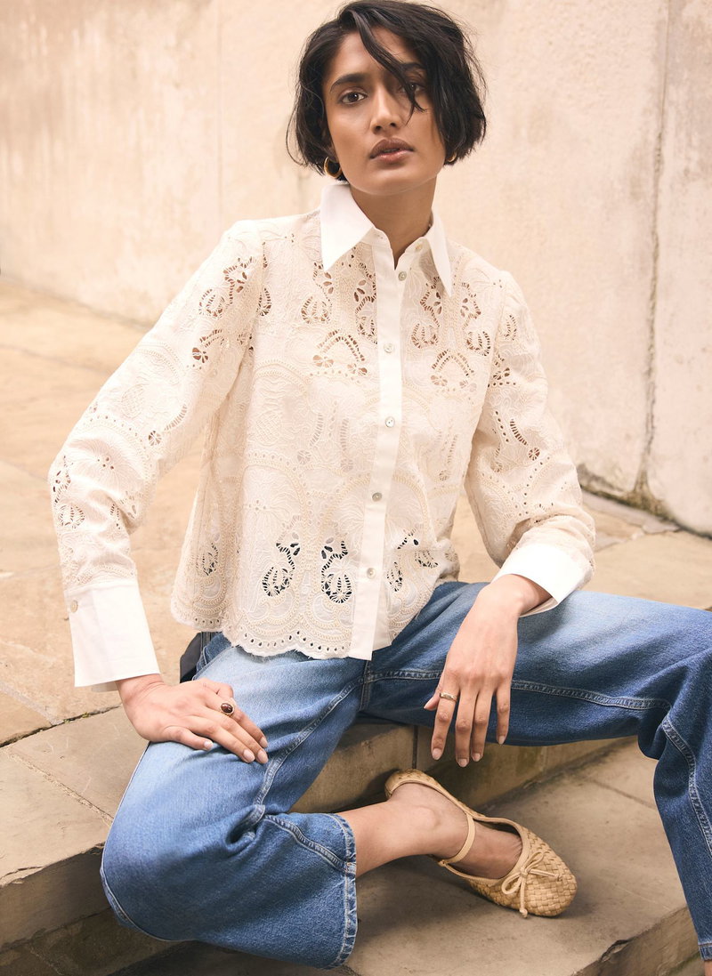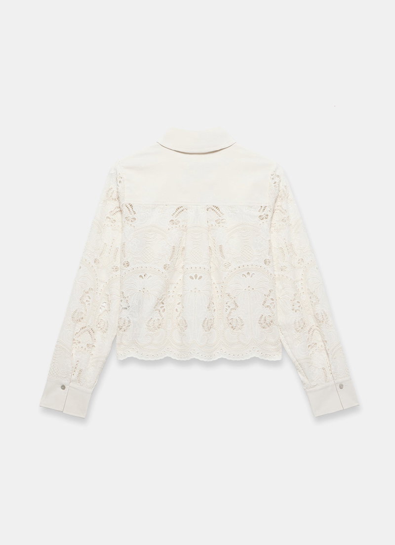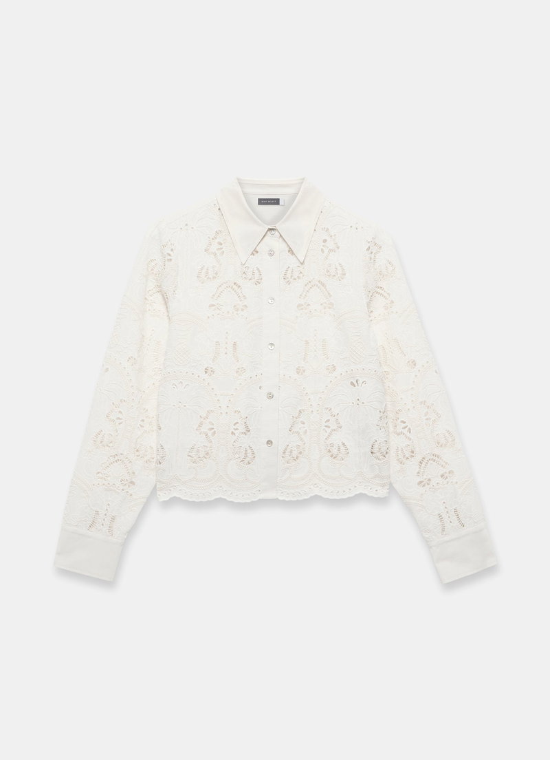 White broderie shirt in a cropped silhouette featuring a classic collar, long sleeves, buttoned cuffs with a scallop trim hemline and button fastening through the front.