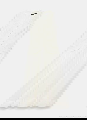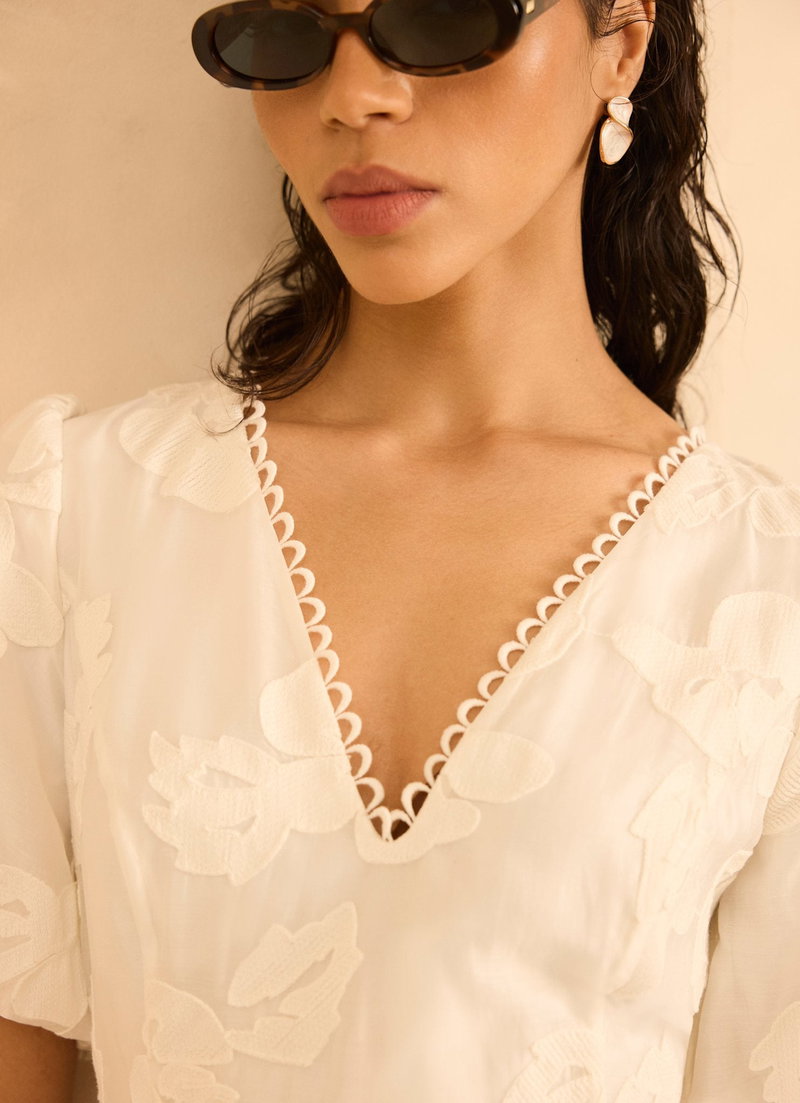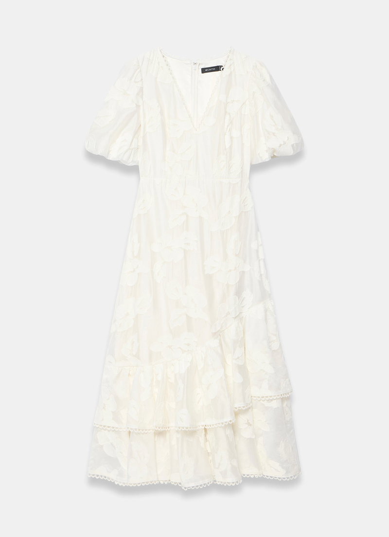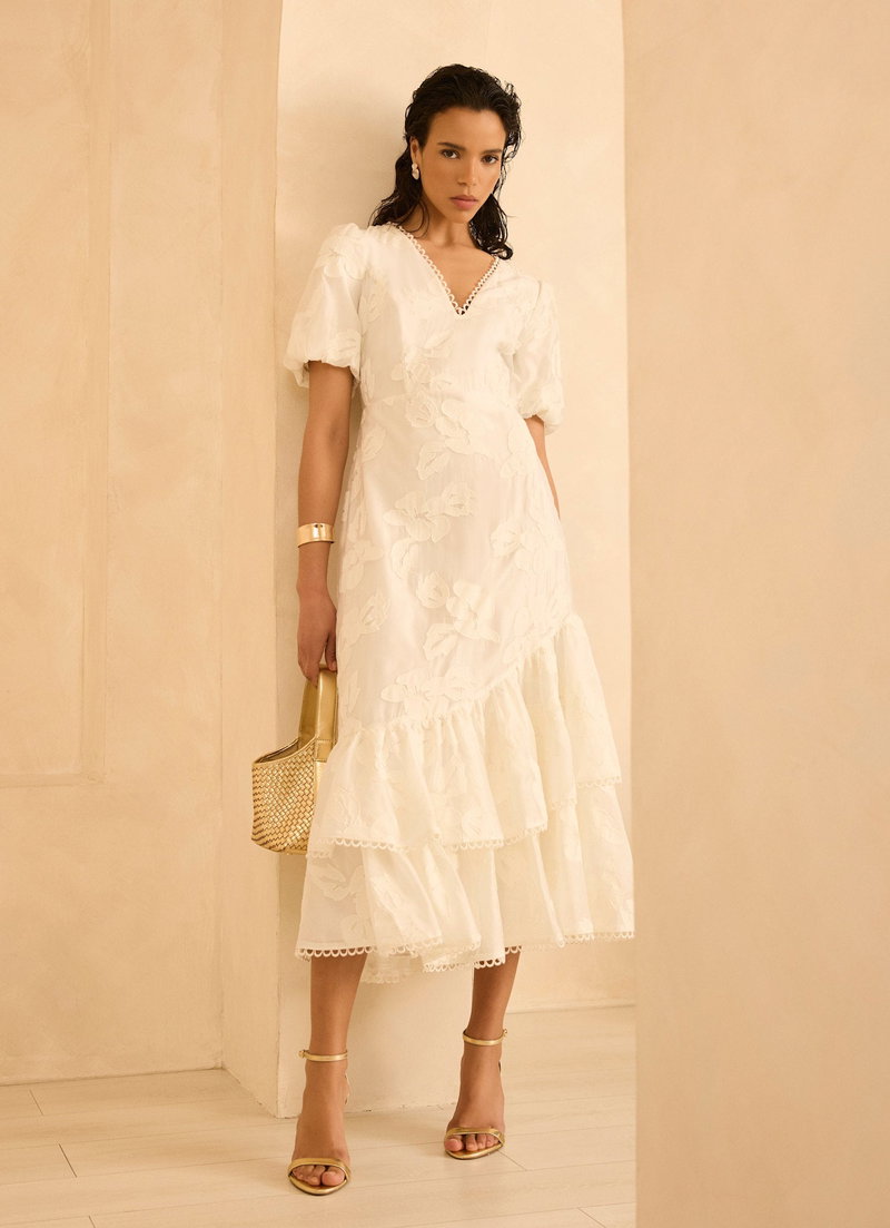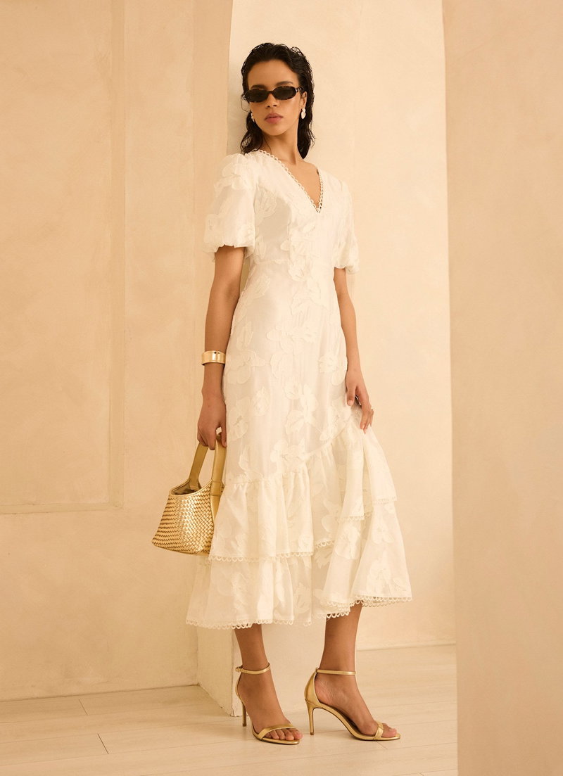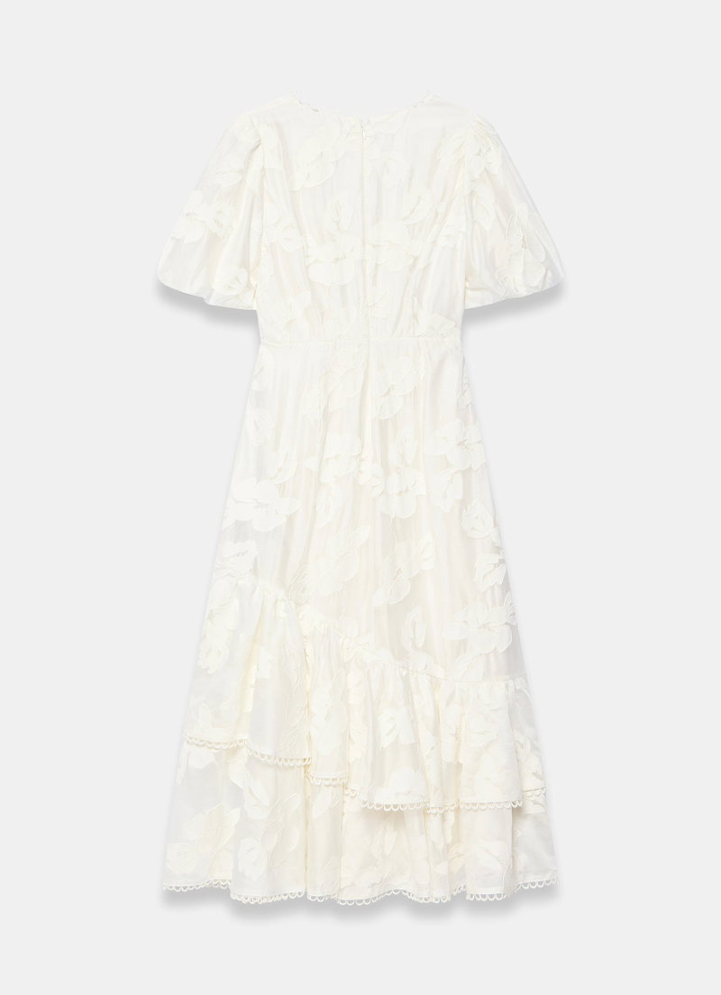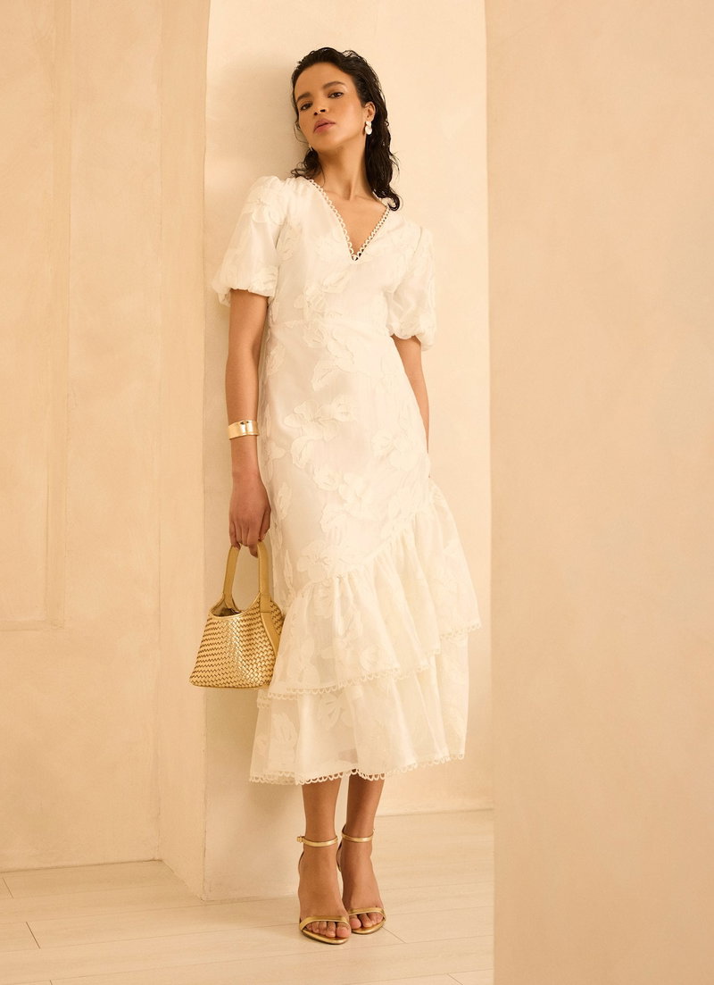White textured floral dress in a maxi silhouette featuring a V-neckline, short puff sleeves, scallop trim, asymmetric tiered hemline with a zip fastening through the back.