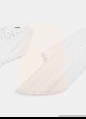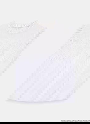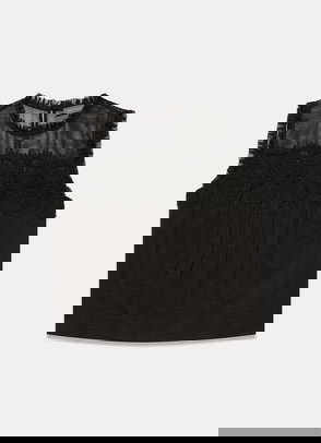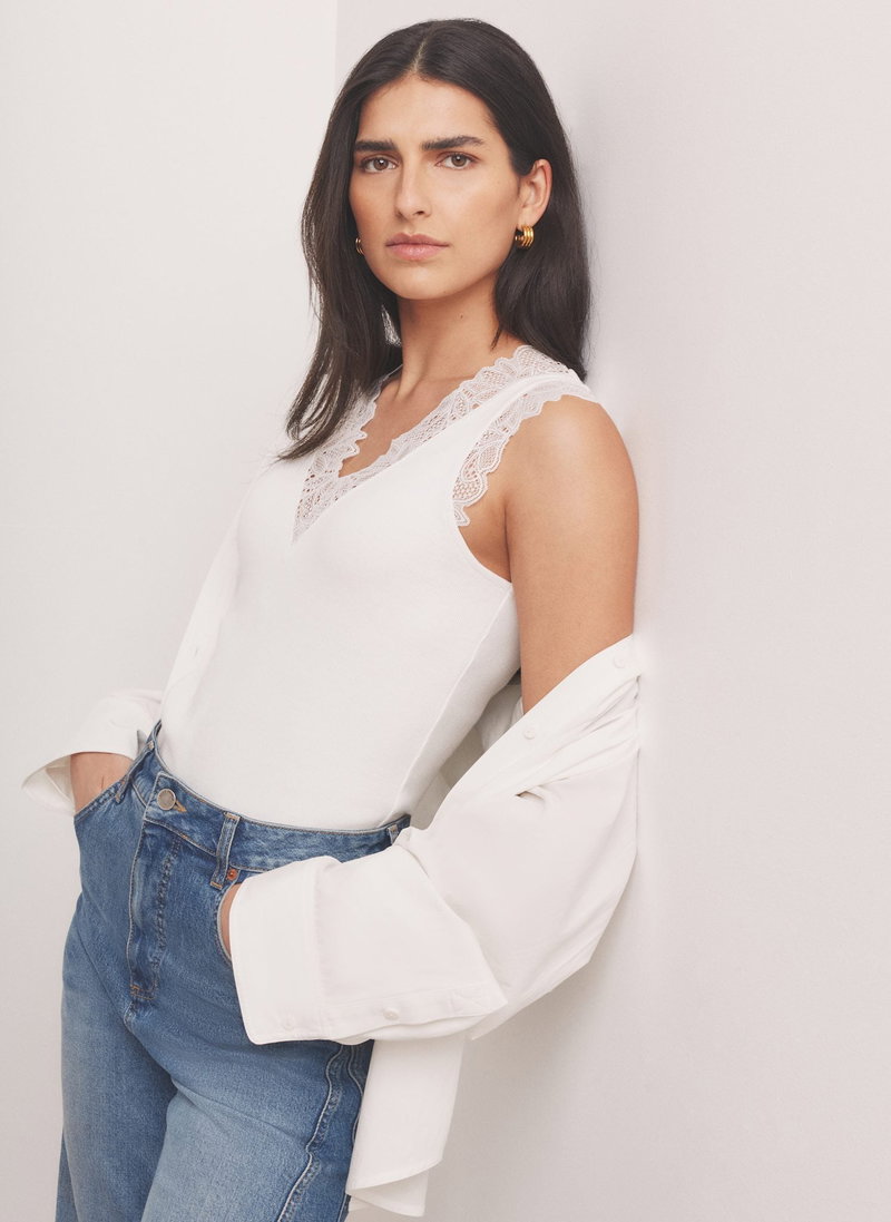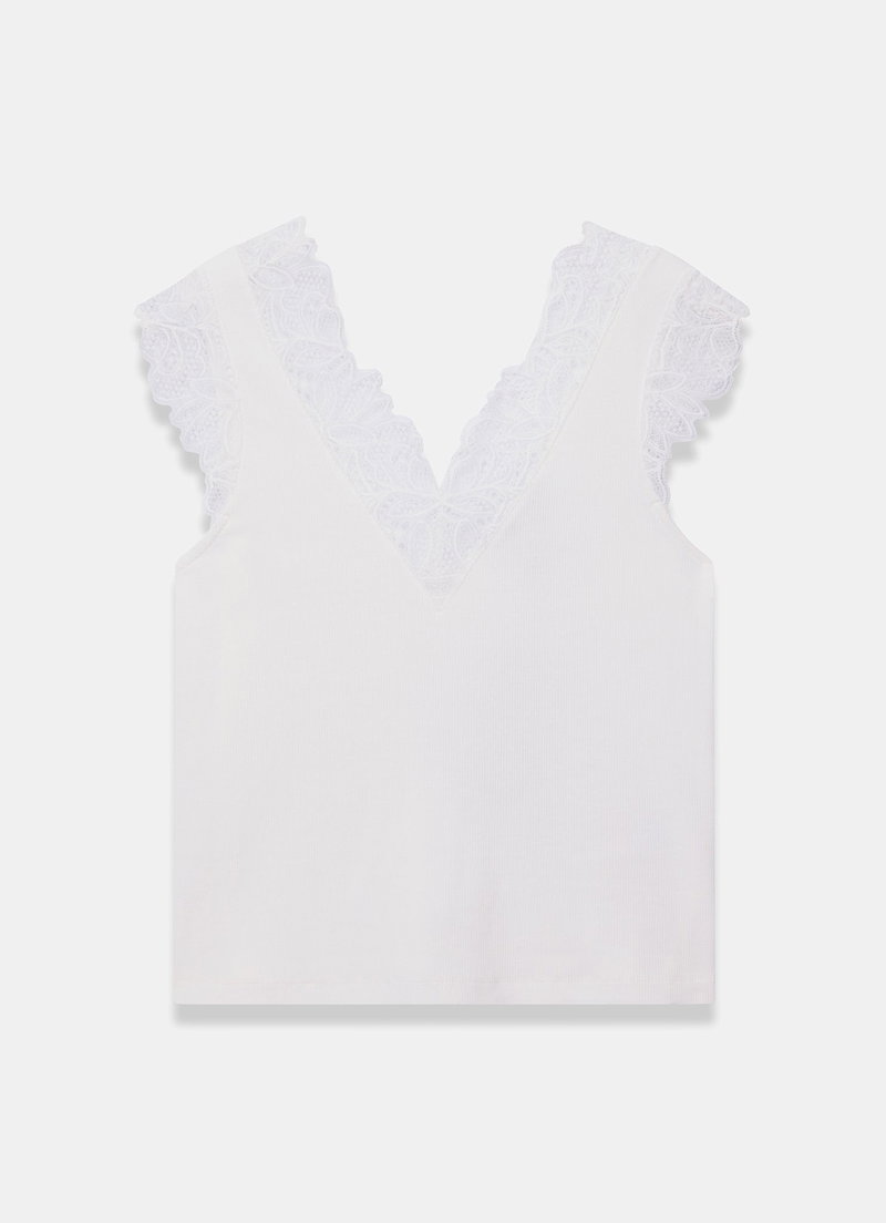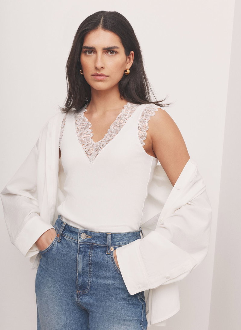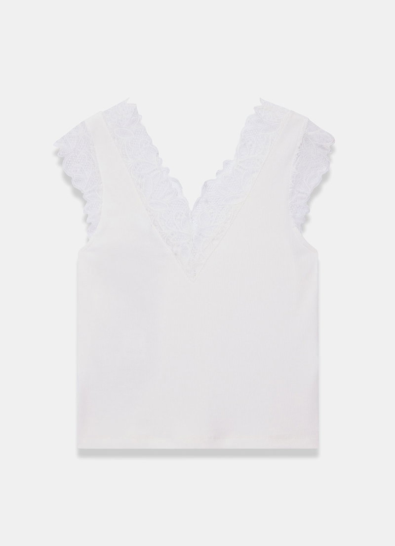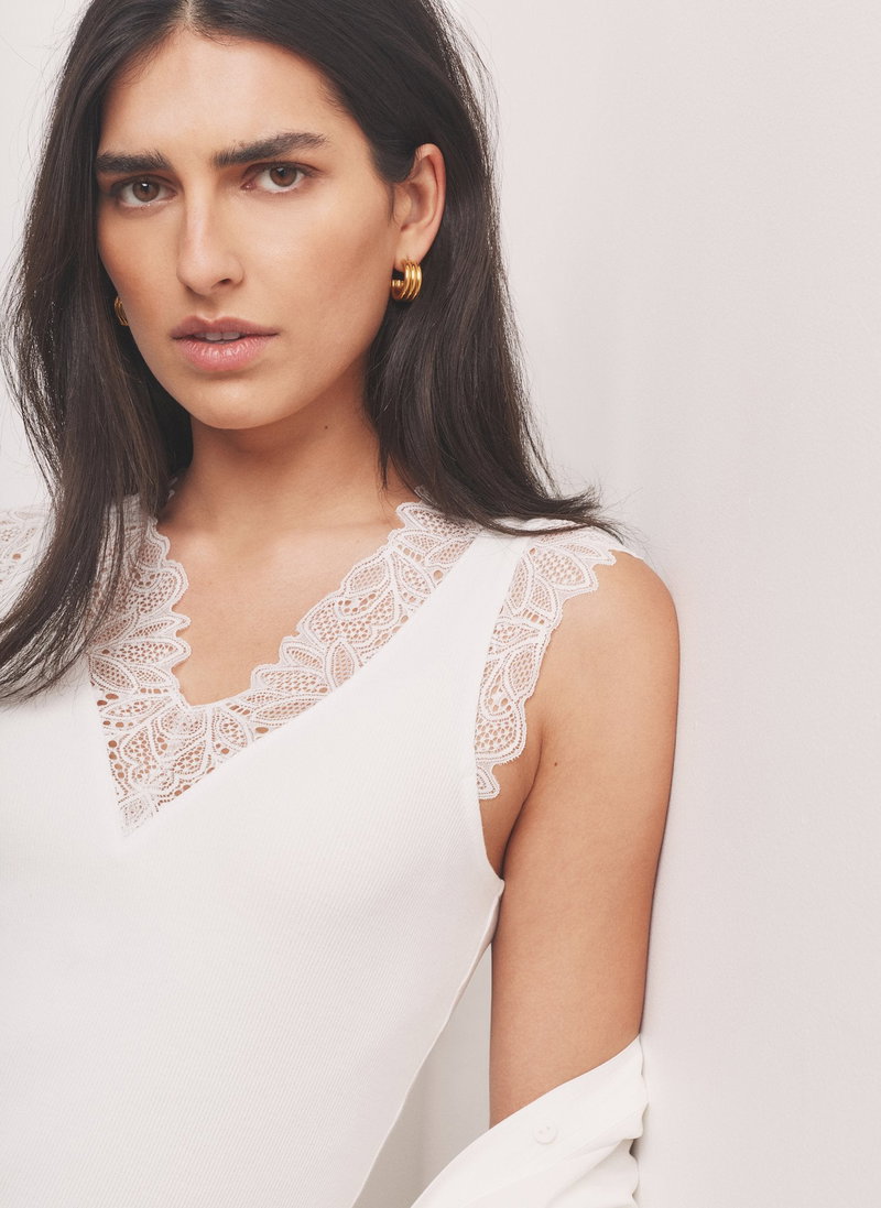White sleeveless top featuring a V-neckline and lace trim detailing.