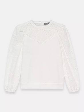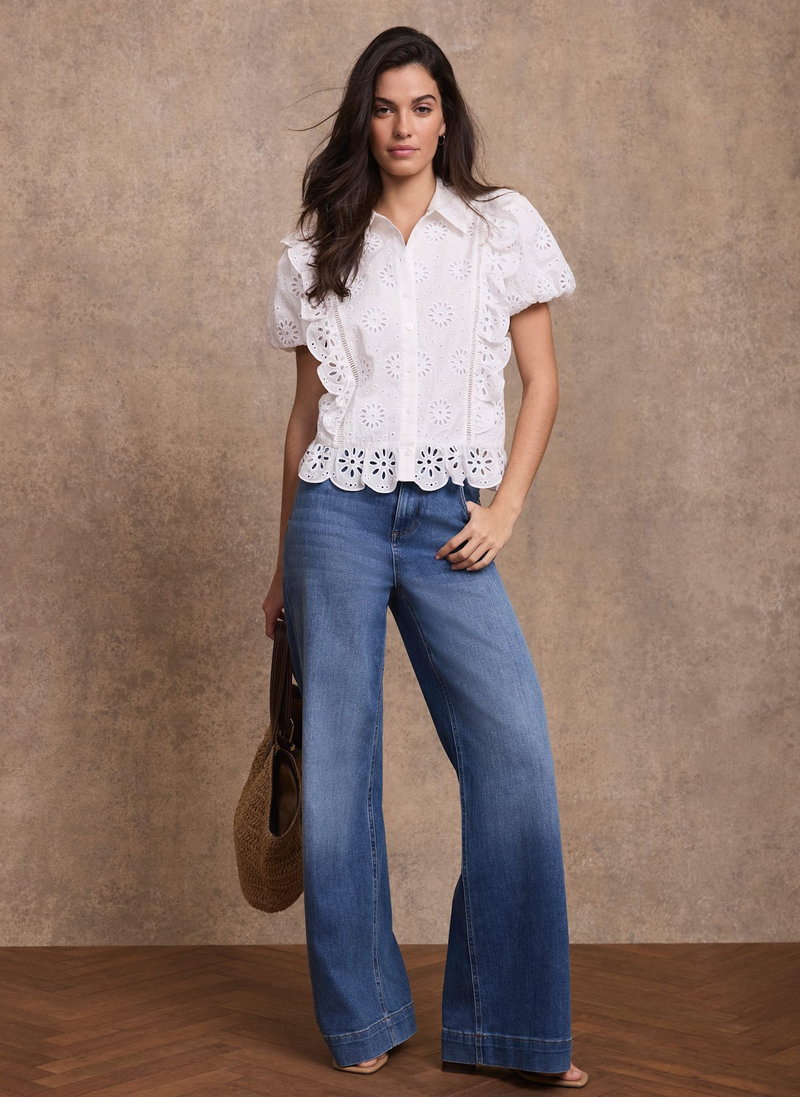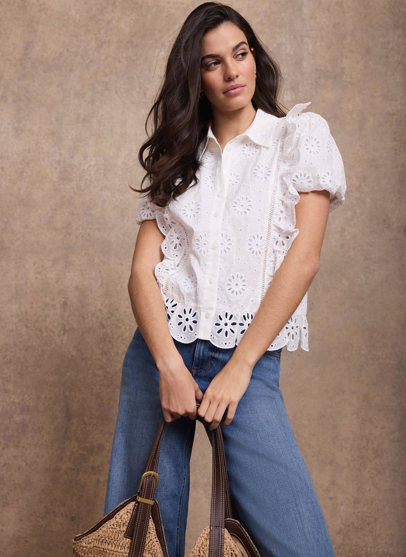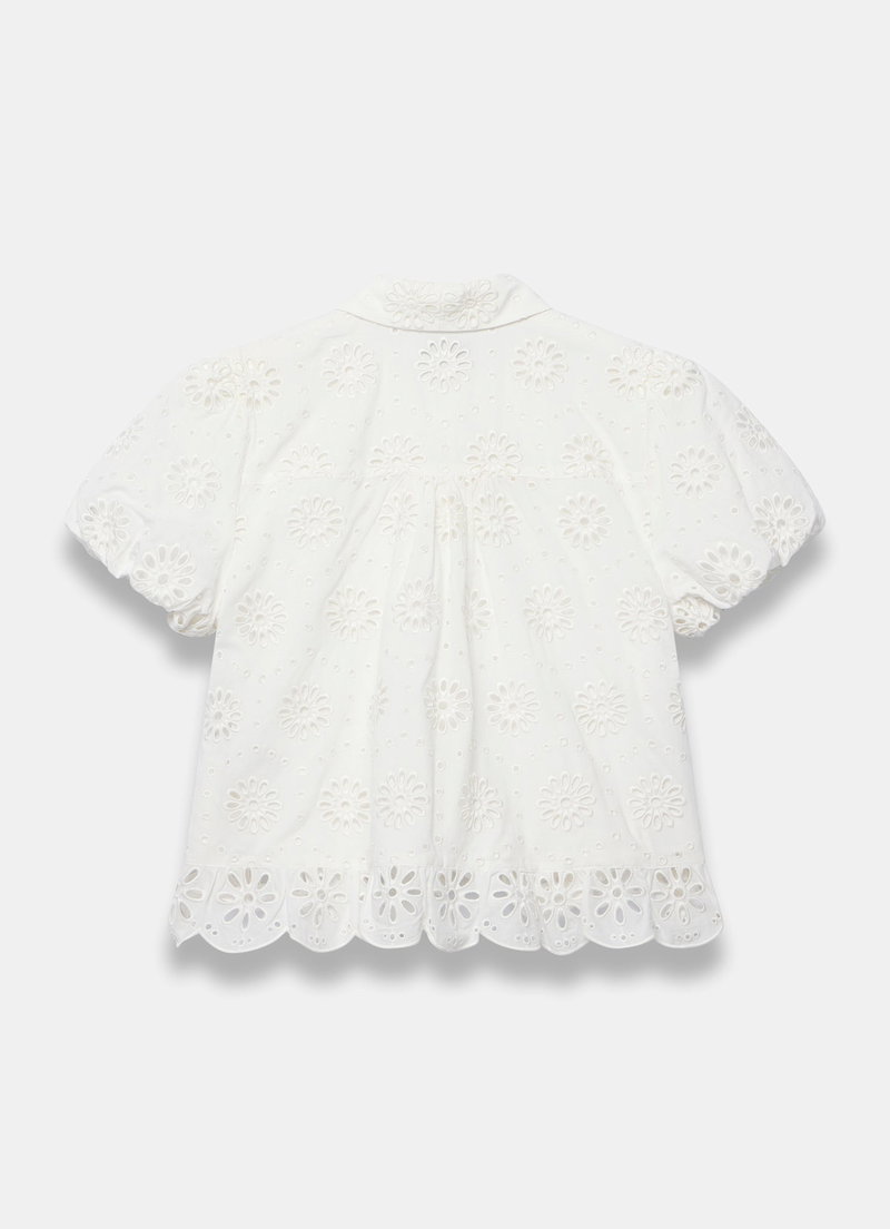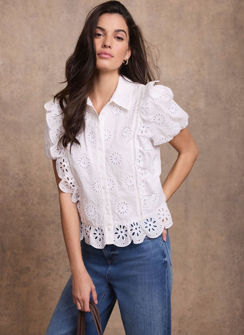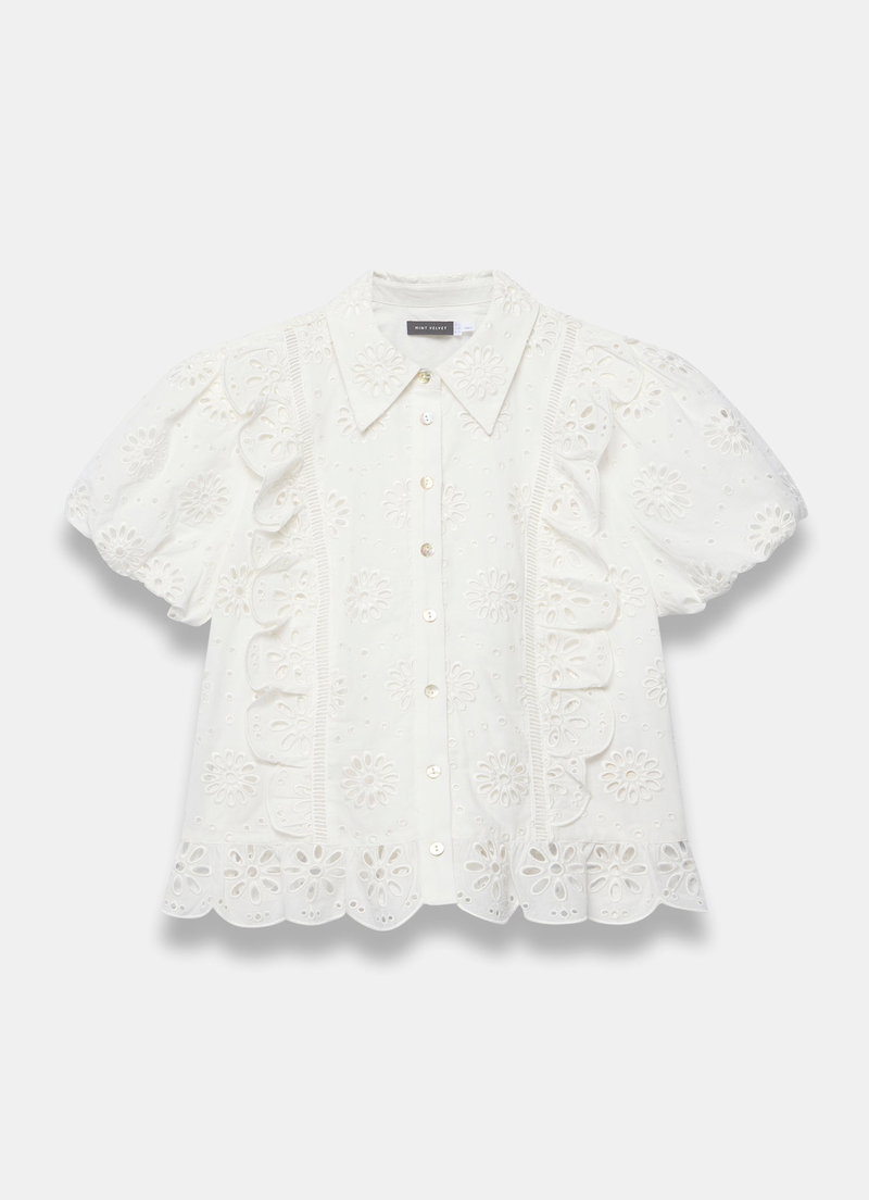 White broderie detail shirt featuring a classic collar, ruffle trim, short puff sleeves, scallop hemline with a button fastening through the front.