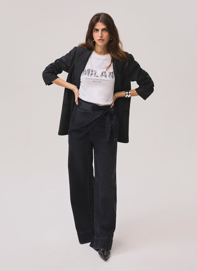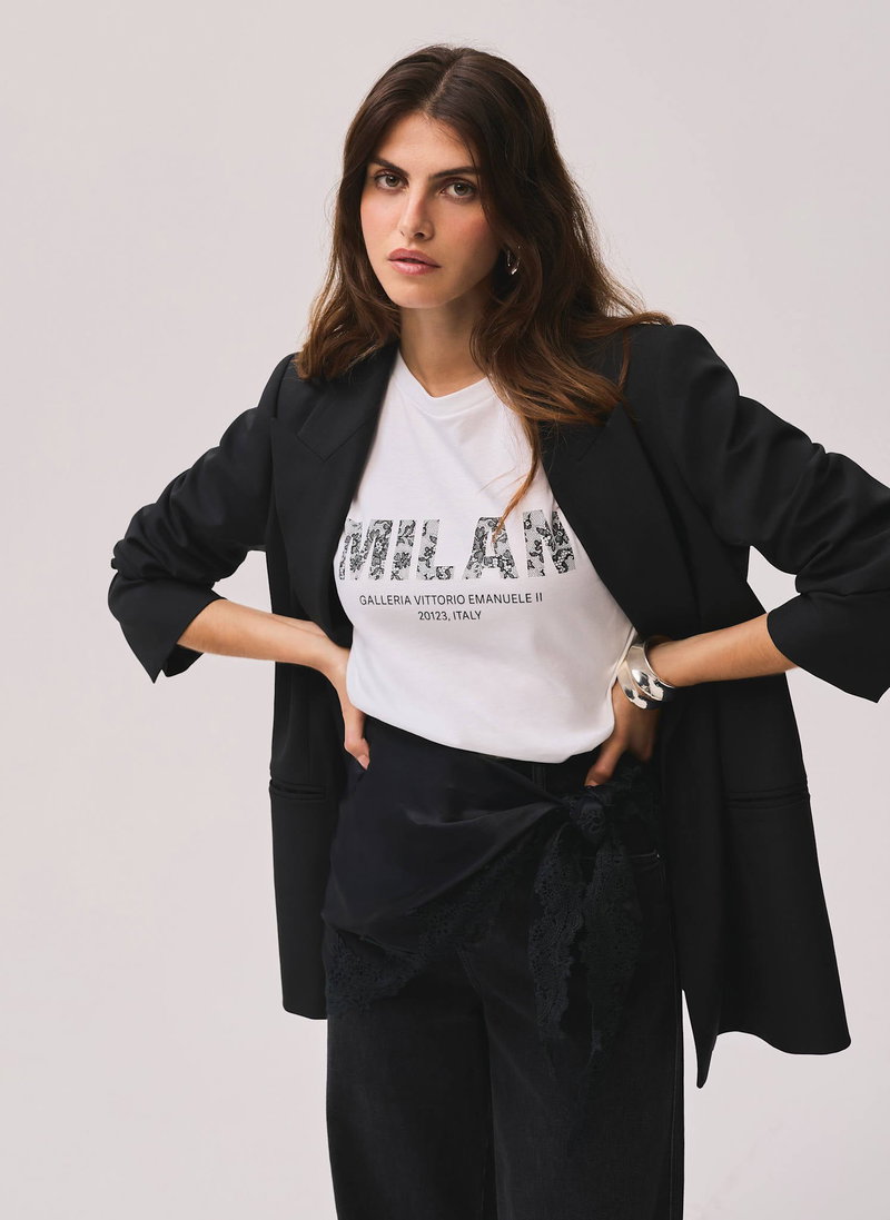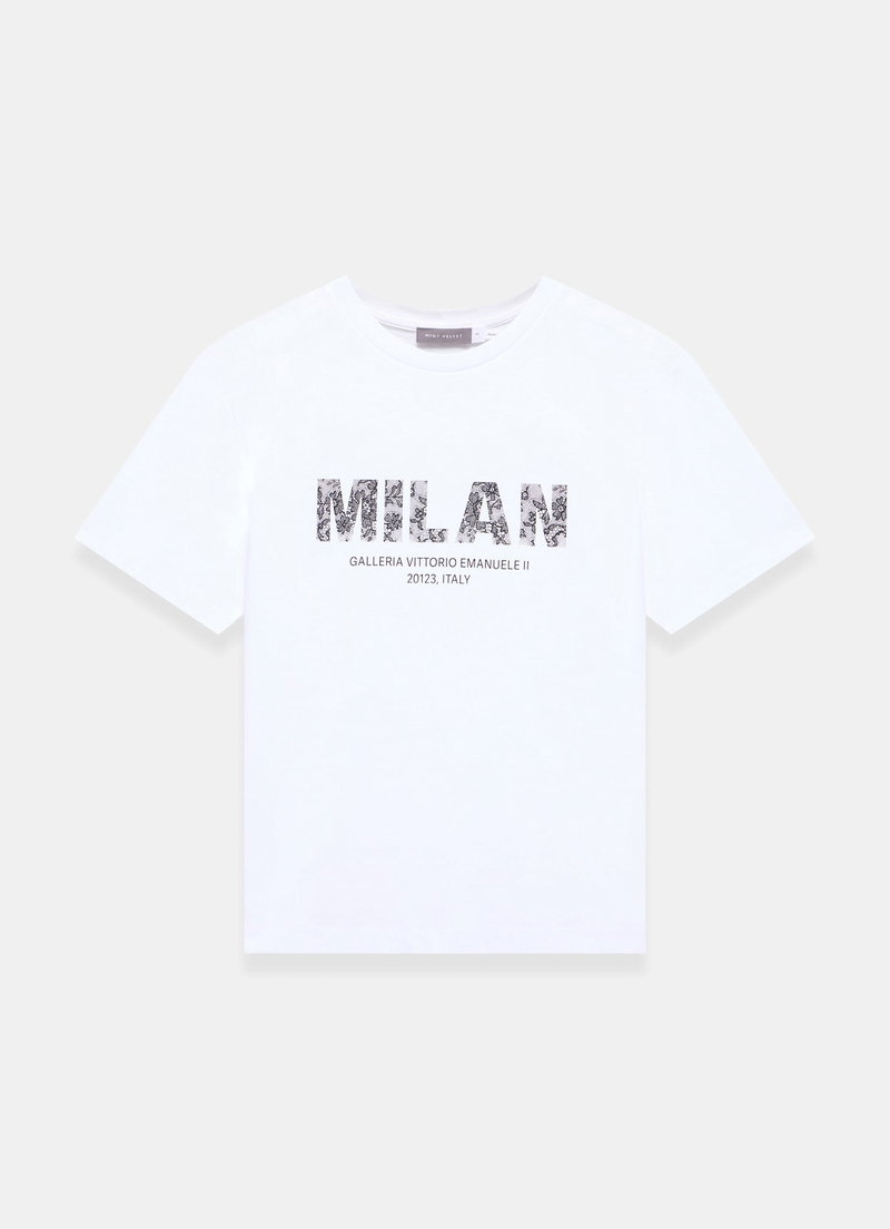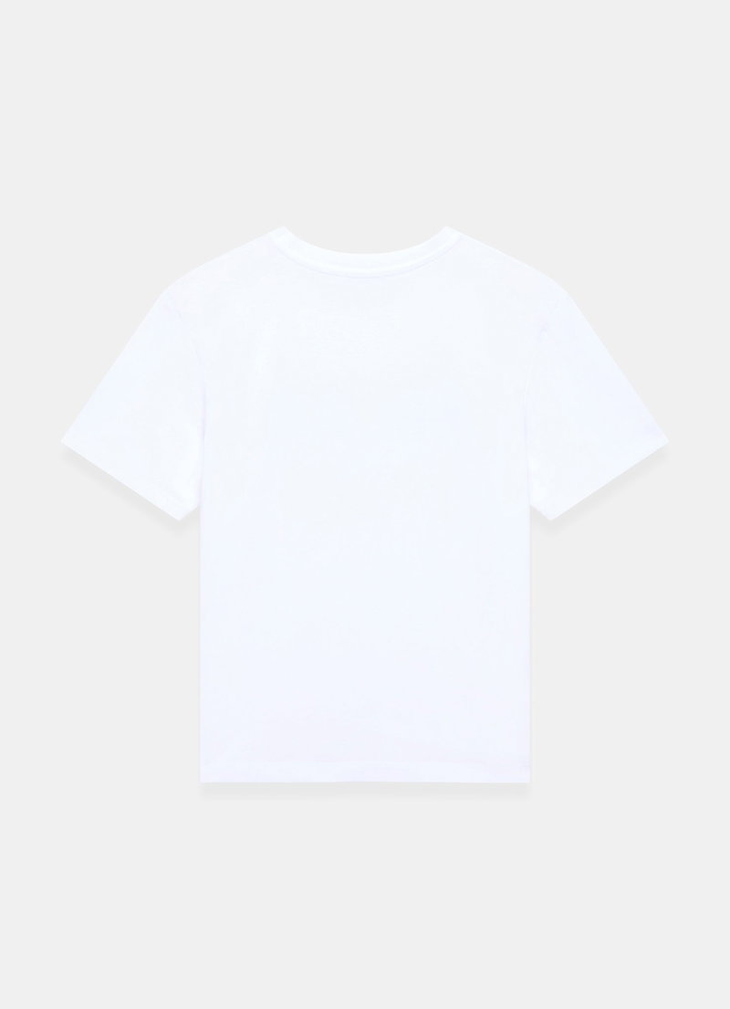 White cotton t-shirt featuring a crew neckline, short sleeves with a printed lace logo motif.