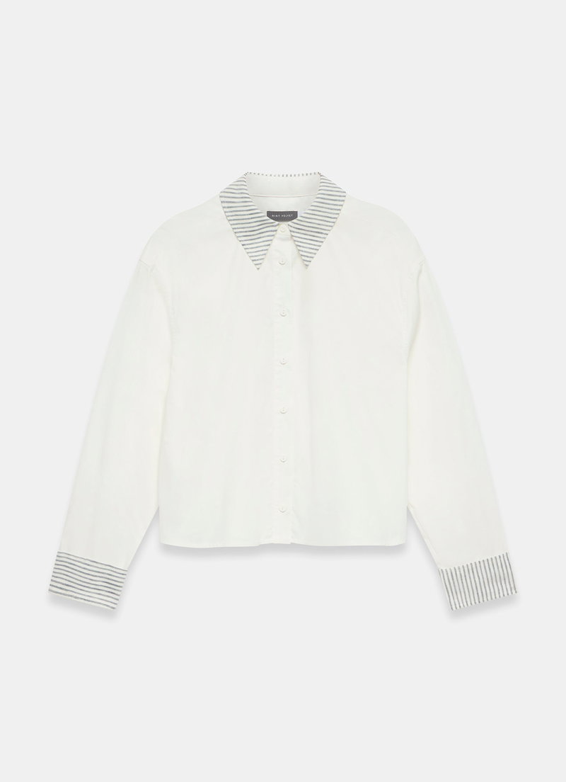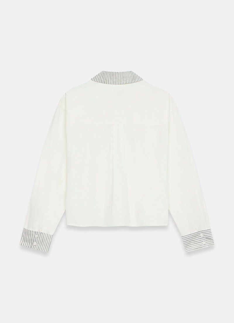 White shirt in a cropped silhouette featuring a striped classic collar, long sleeves, striped buttoned cuffs with a button fastening through the front.
