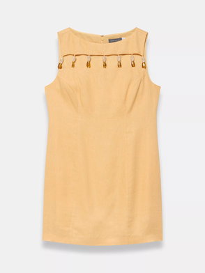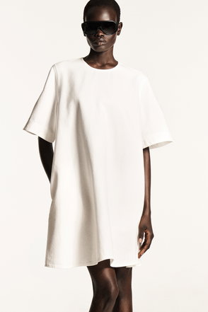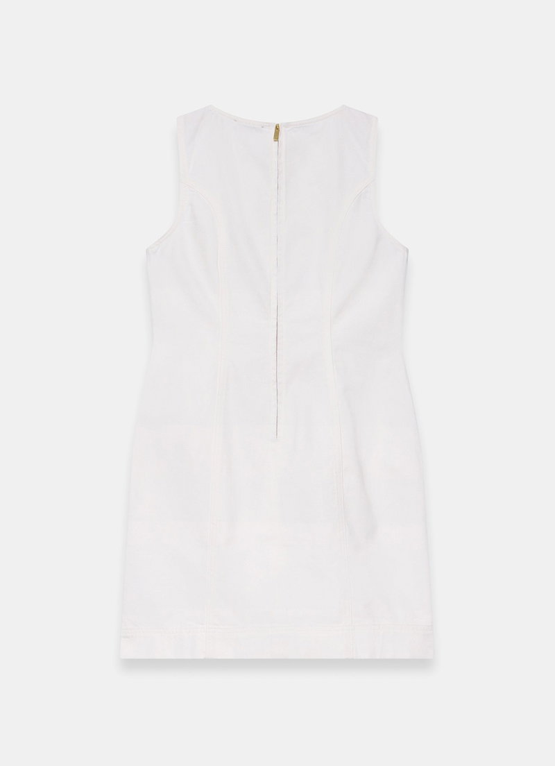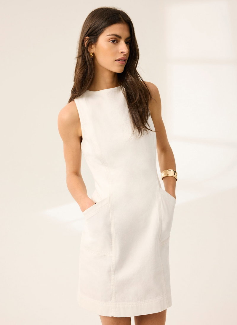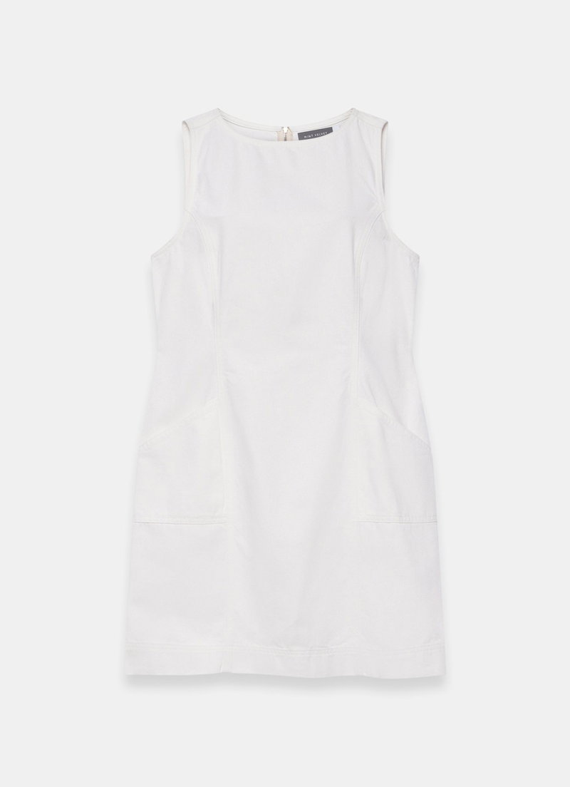 White sleeveless dress in a mini silhouette featuring a crew neckline and zip fastening through the back.