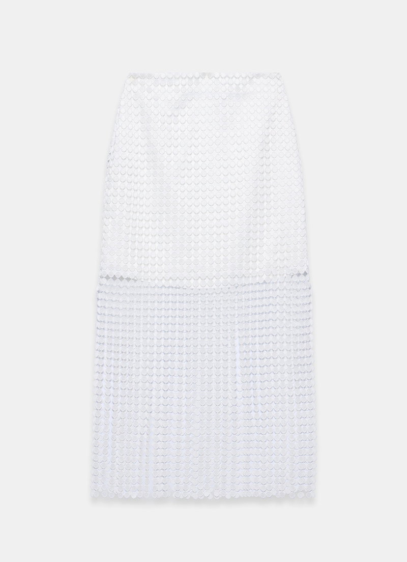 White disc design skirt in a midi silhouette featuring a fringed hemline and zip fastening through the side.
