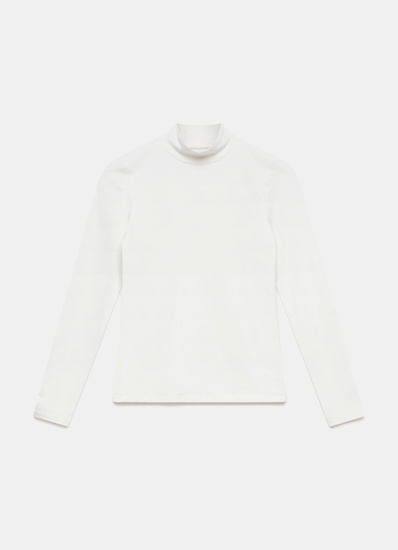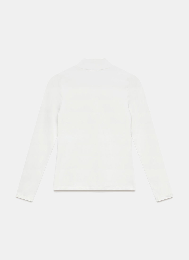 White top featuring a high neckline and long sleeves.
