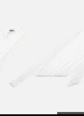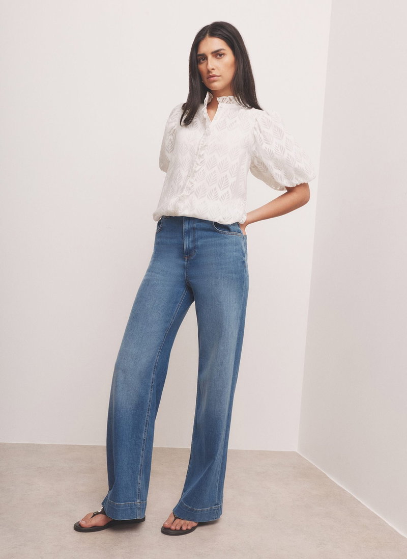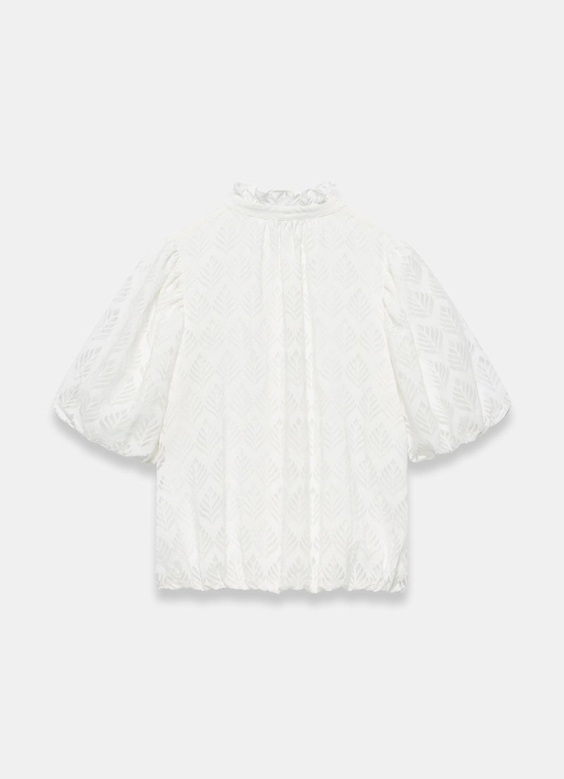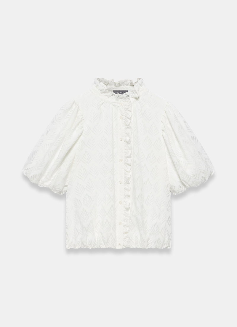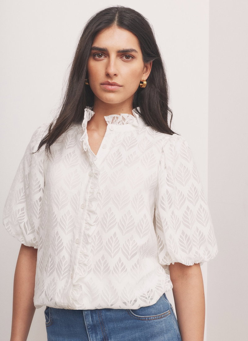 White jacquard blouse featuring a high neckline, short puff sleeves, ruffle trim, elasticated hemline with a button fastening through the front.