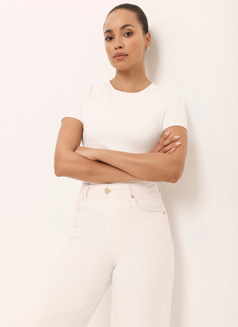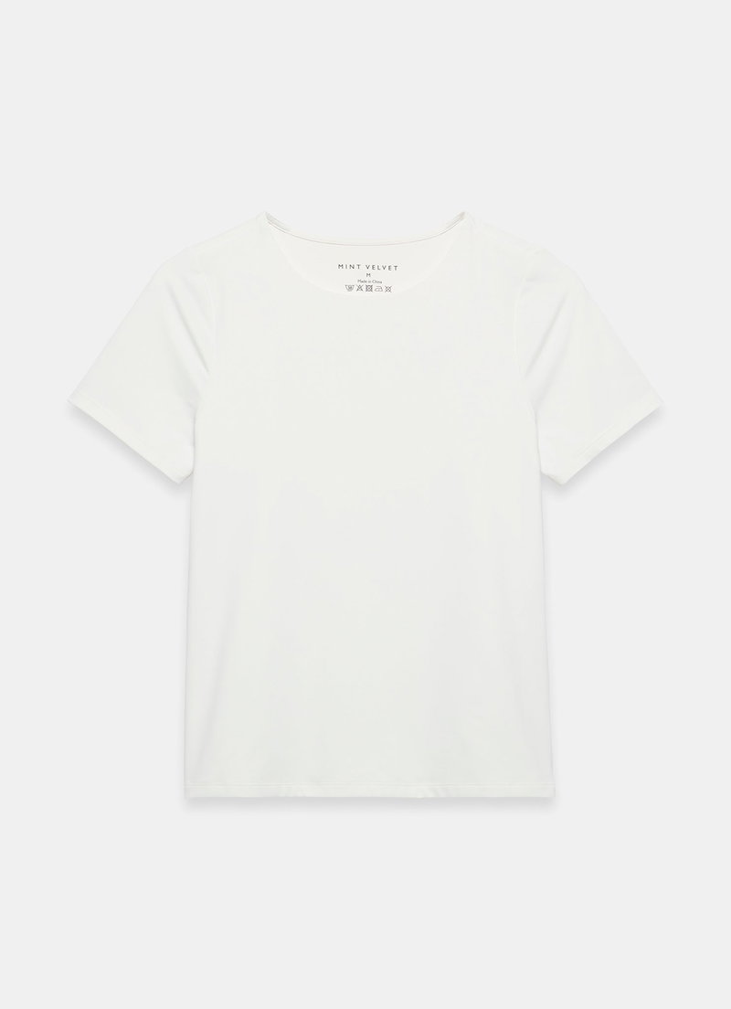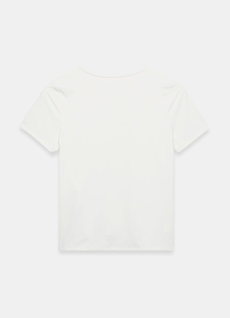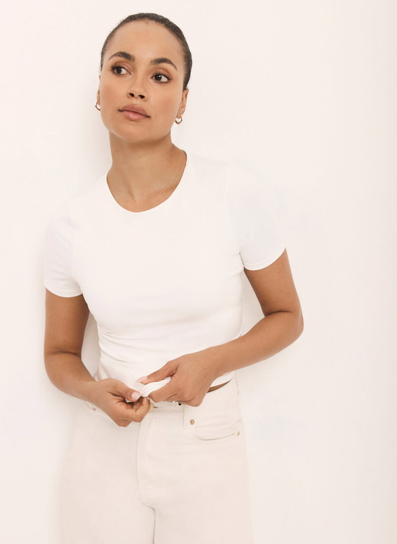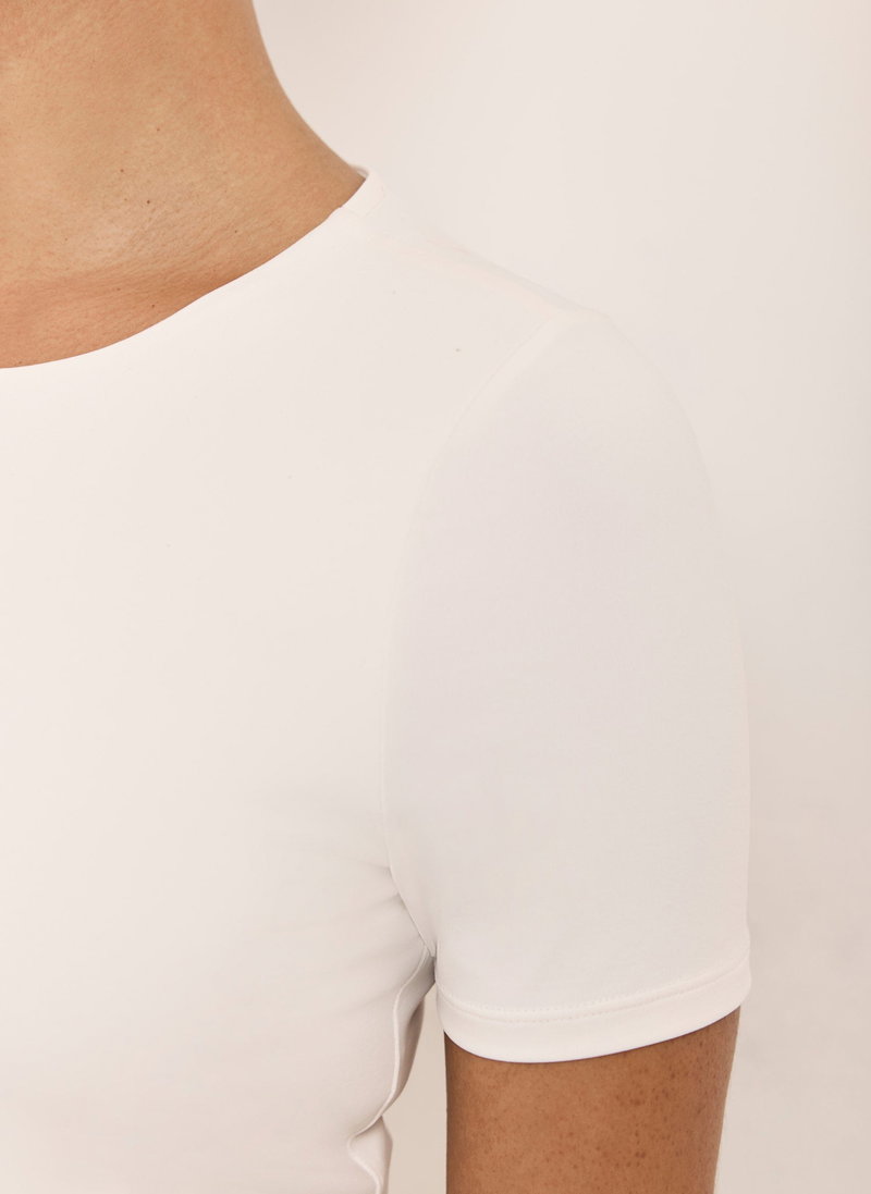 White top featuring a crew neckline and short sleeves.