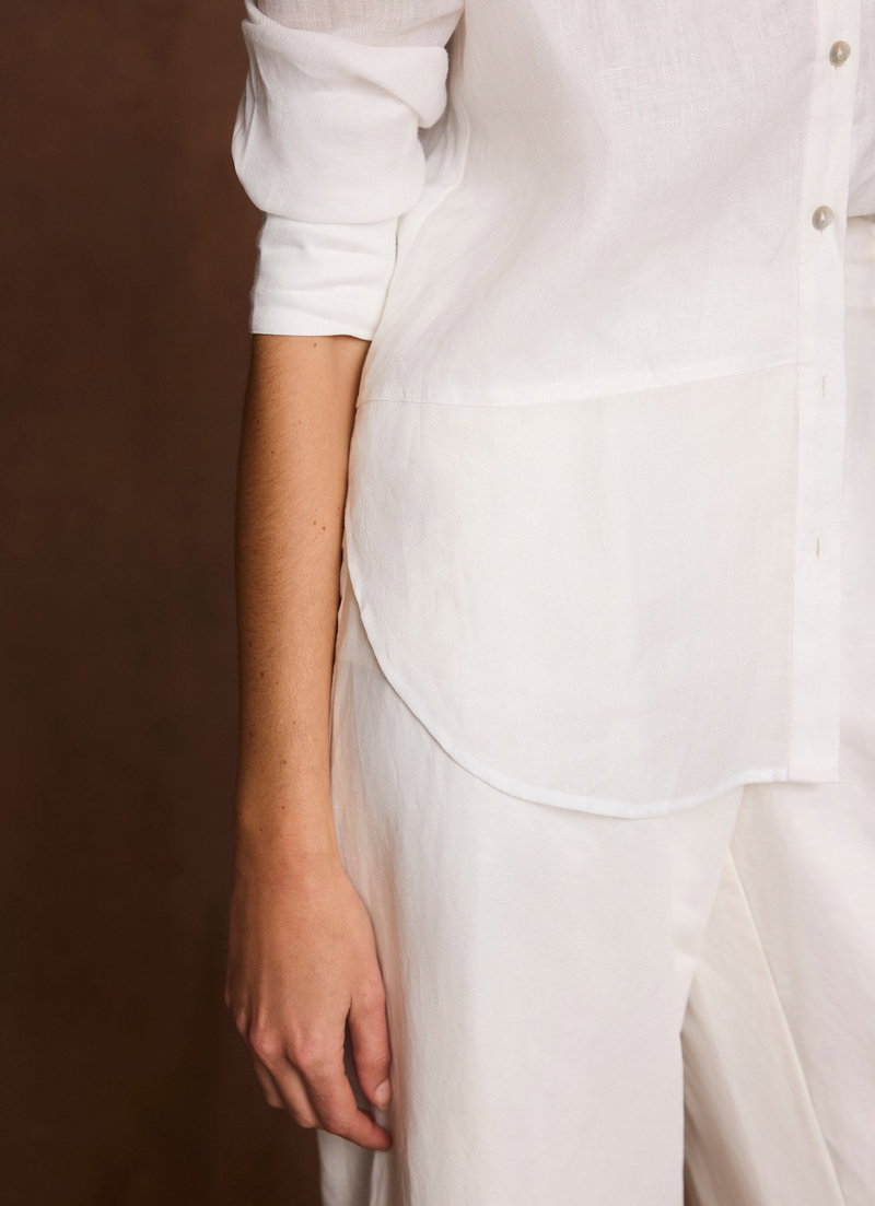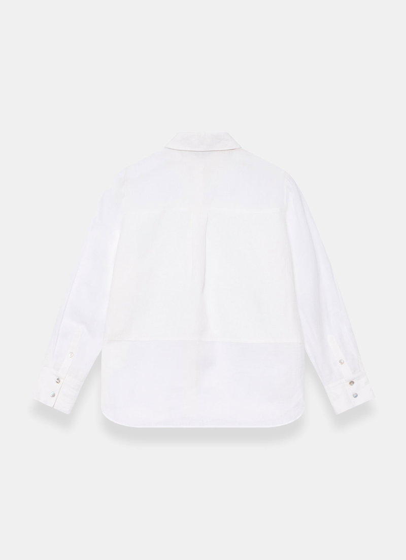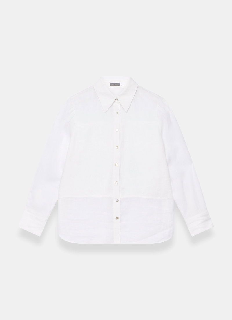 White sheer panel shirt featuring a classic collar, long sleeves, buttoned cuffs, curved hemline with a button fastening through the front.