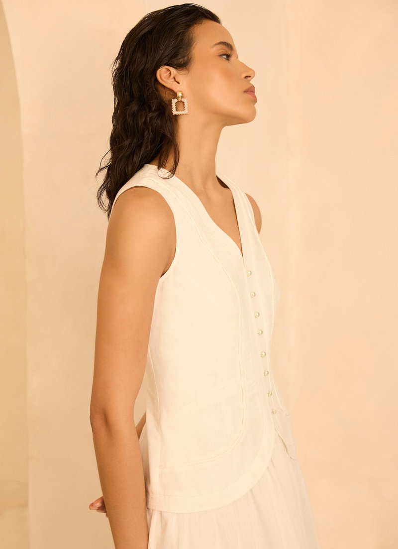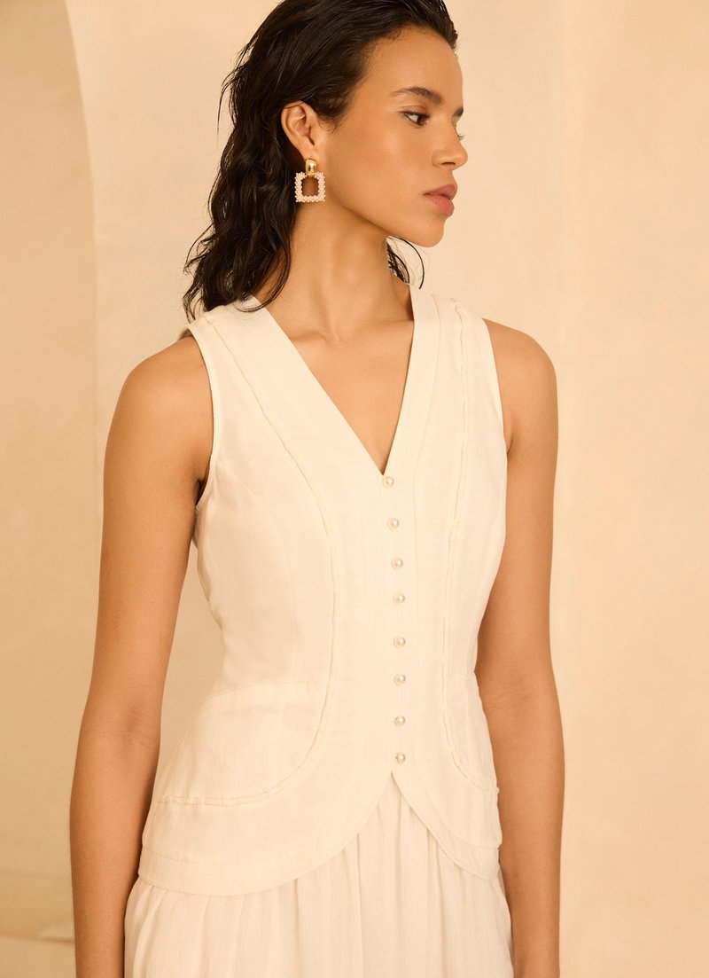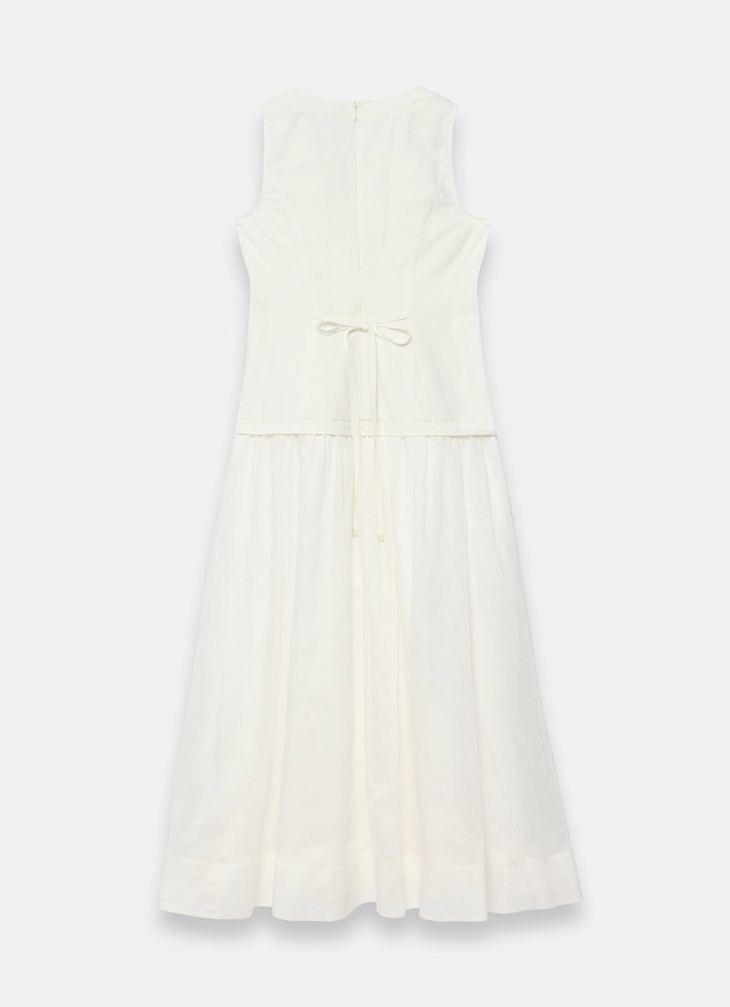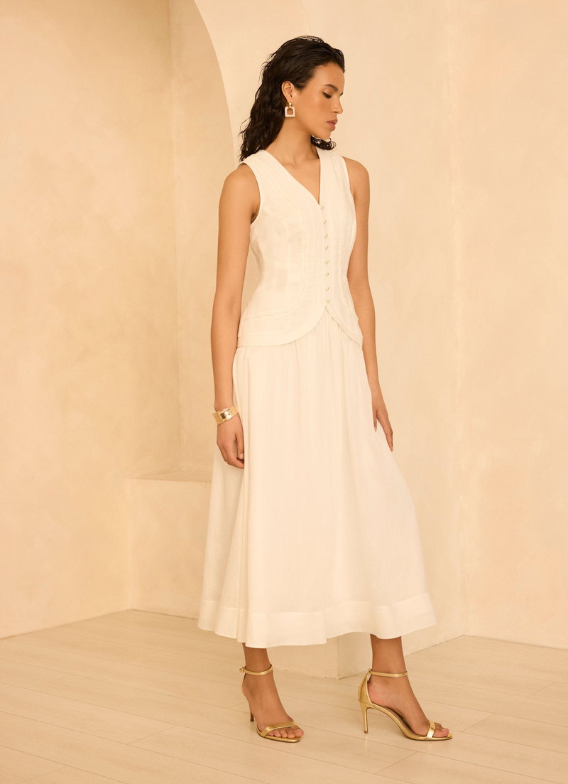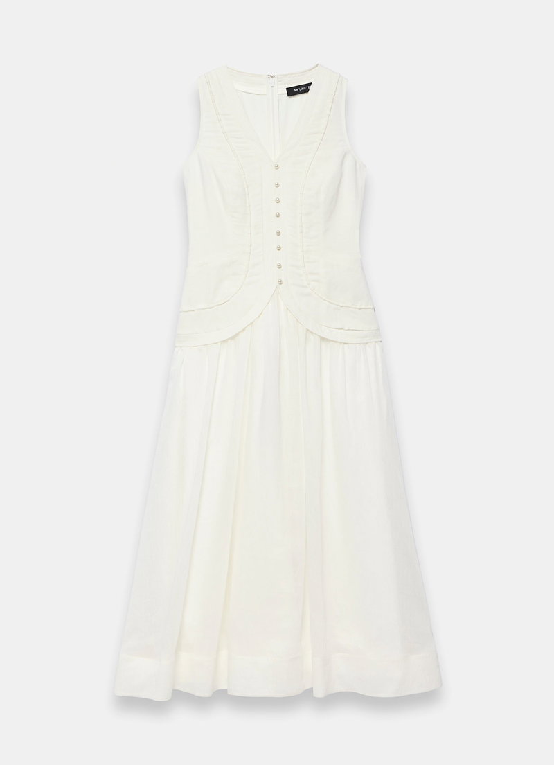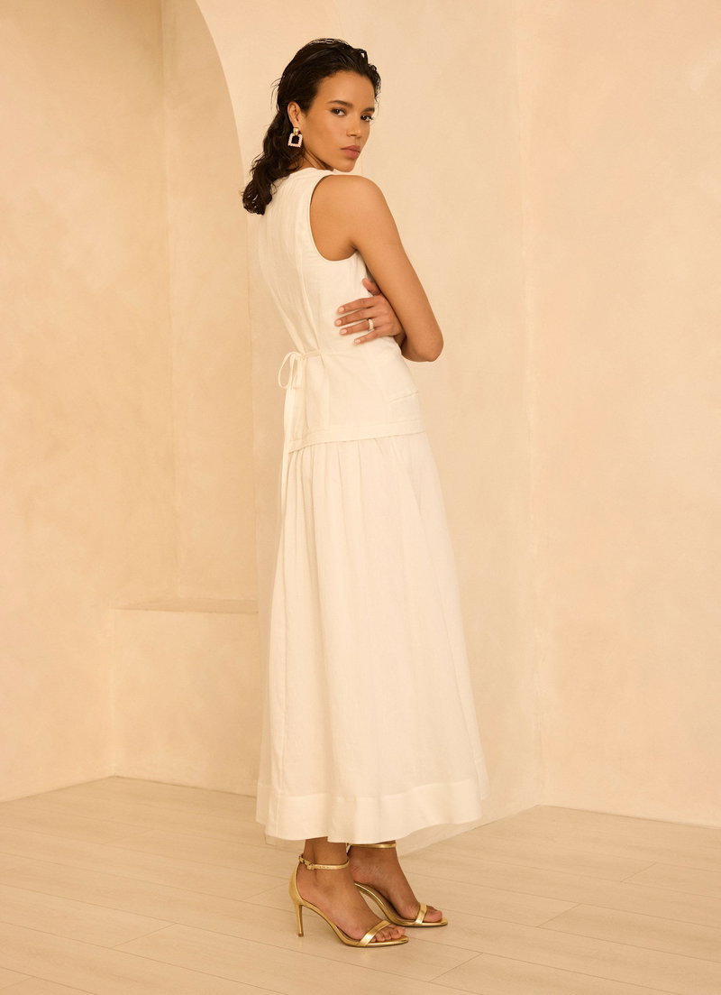 White sleeveless dress in a maxi silhouette featuring a V-neckline, waistcoat effect, piped detailing, tie back with a zip fastening through the back.