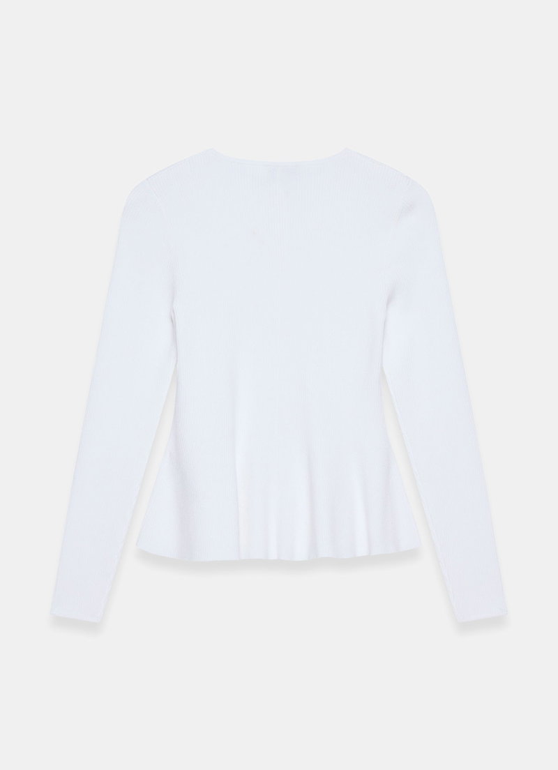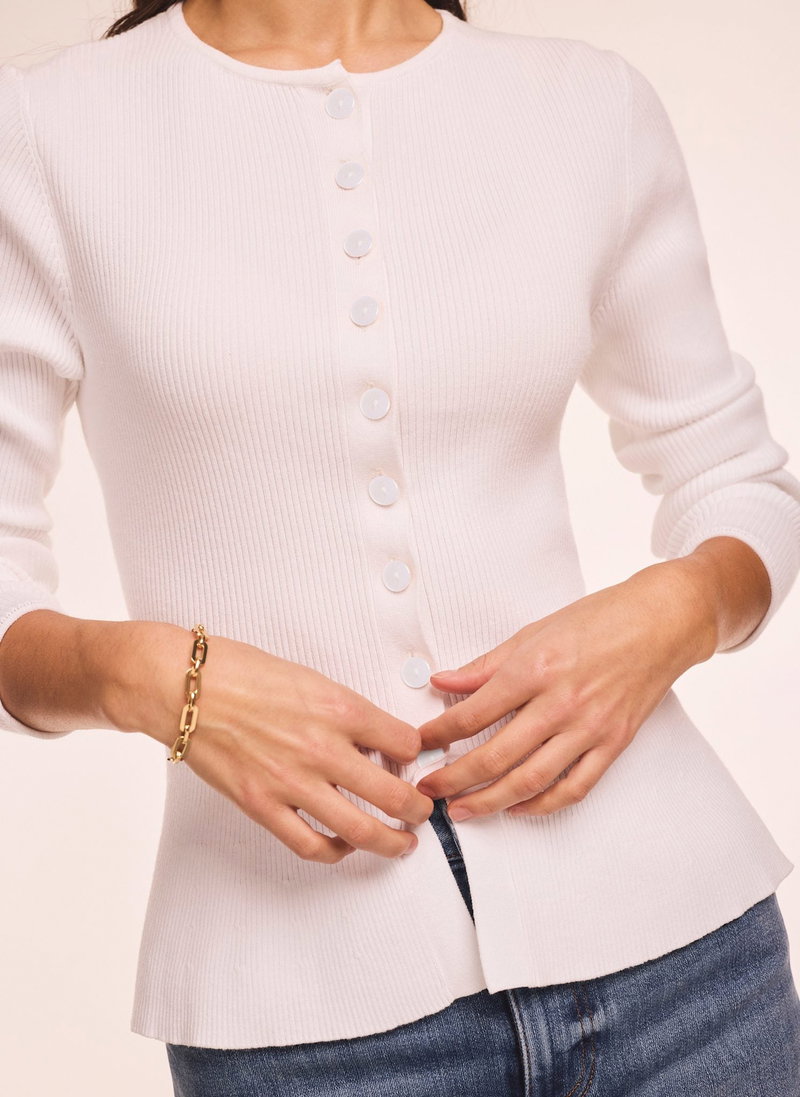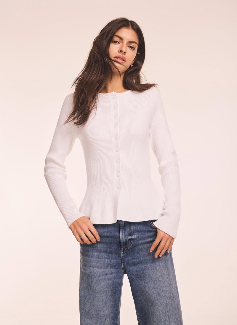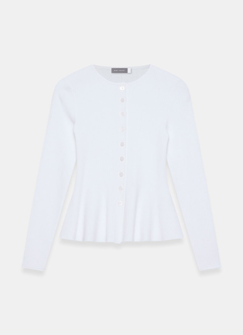 White cardigan featuring a crew neckline, long sleeves, peplum hemline with a button fastening through the front.