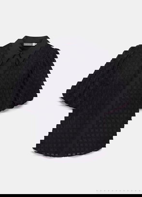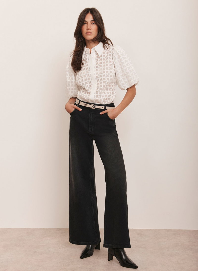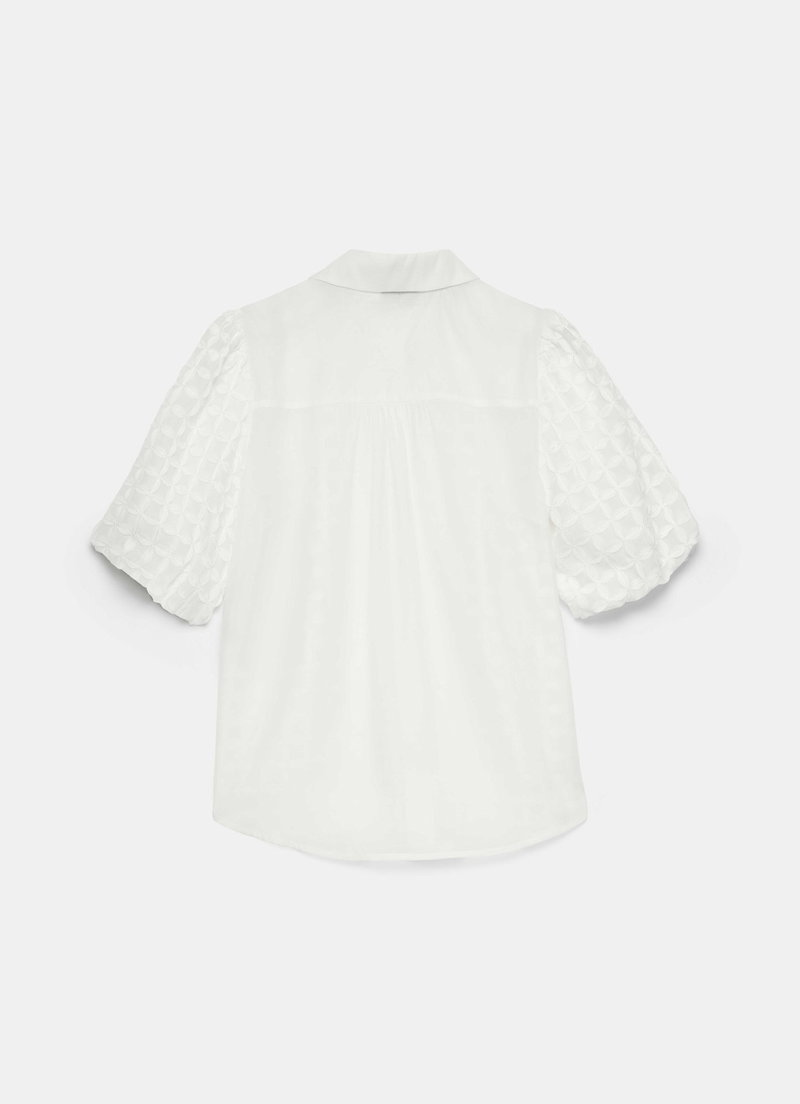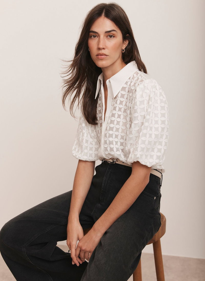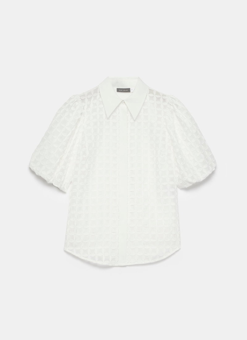 White petal appliqué shirt featuring a classic collar, short puff sleeves and a concealed button fastening through the front.