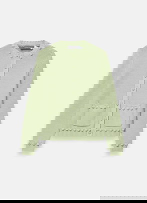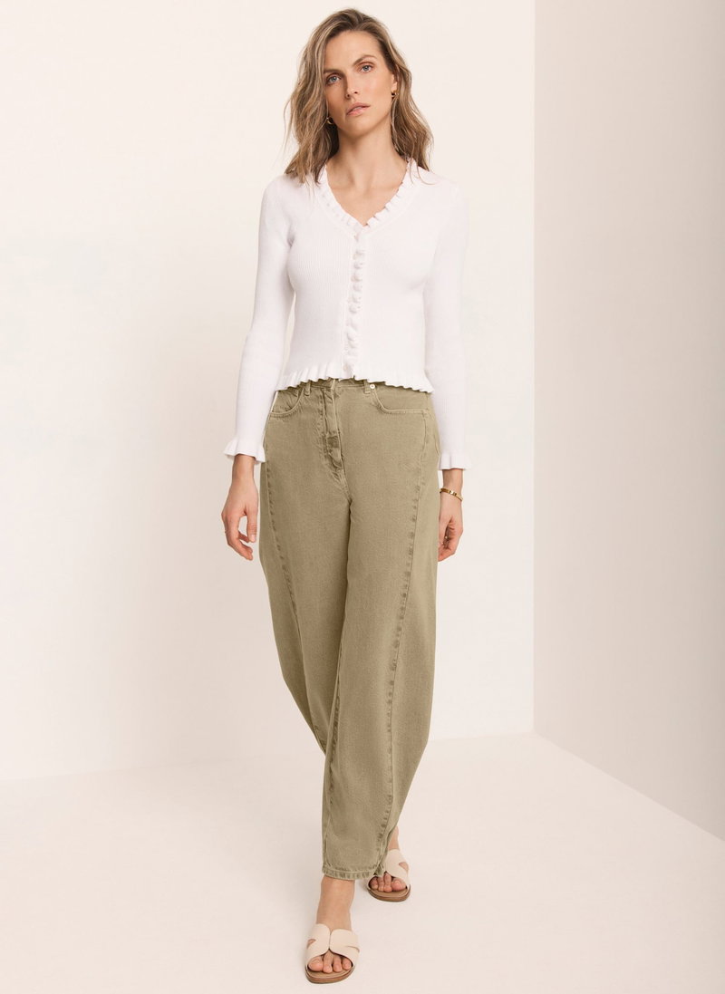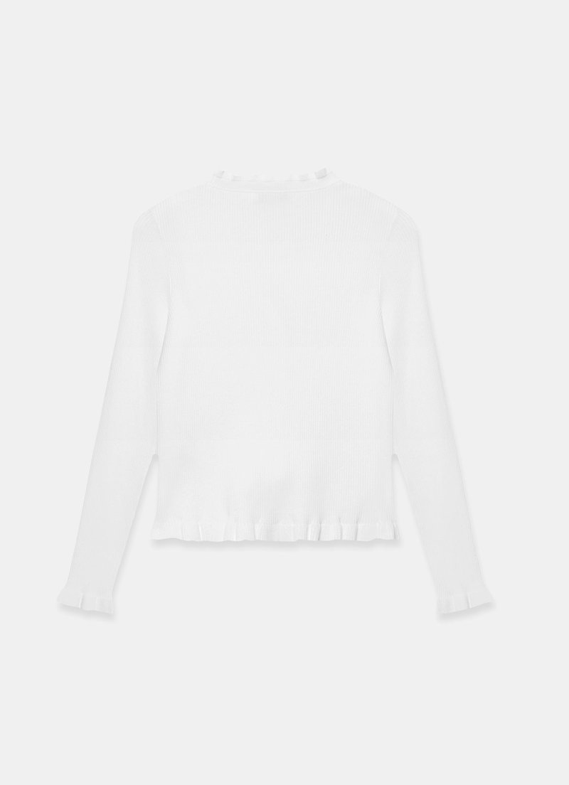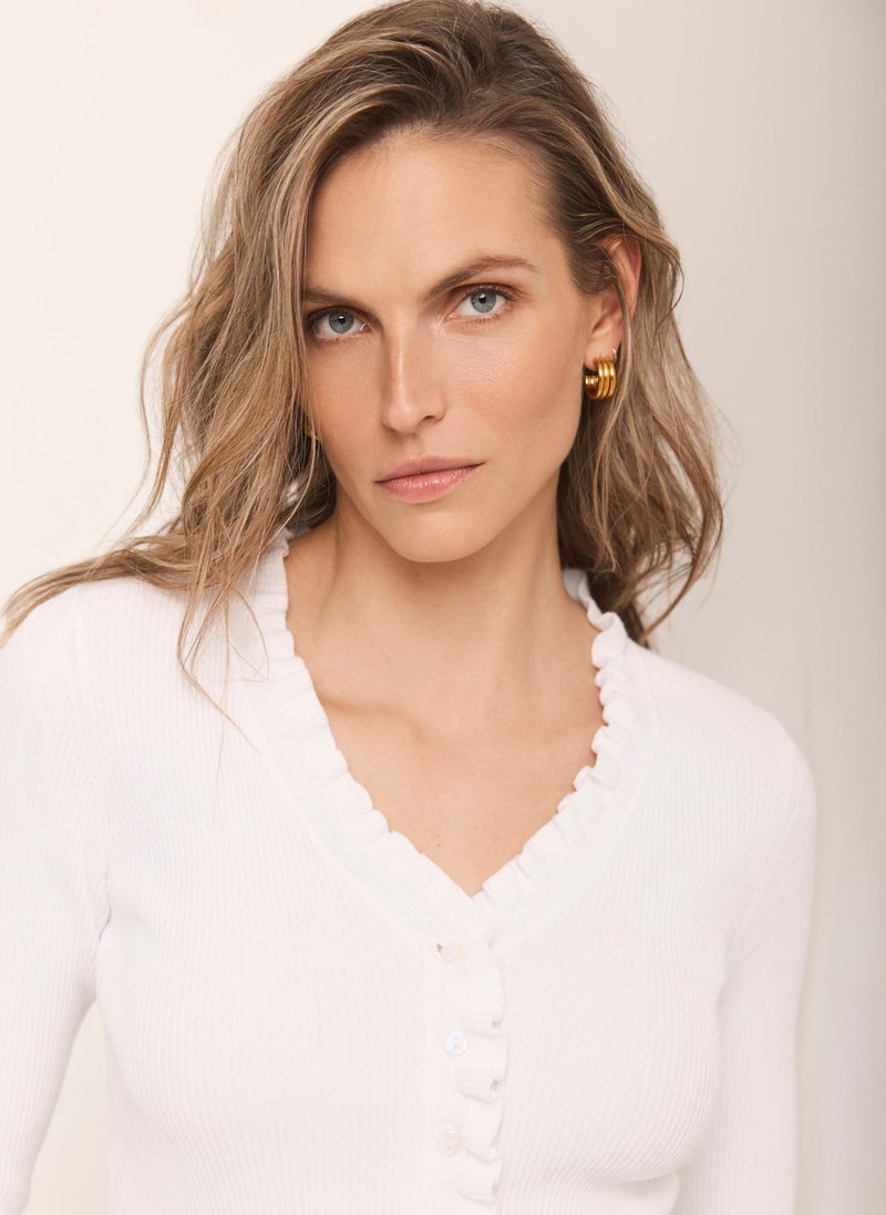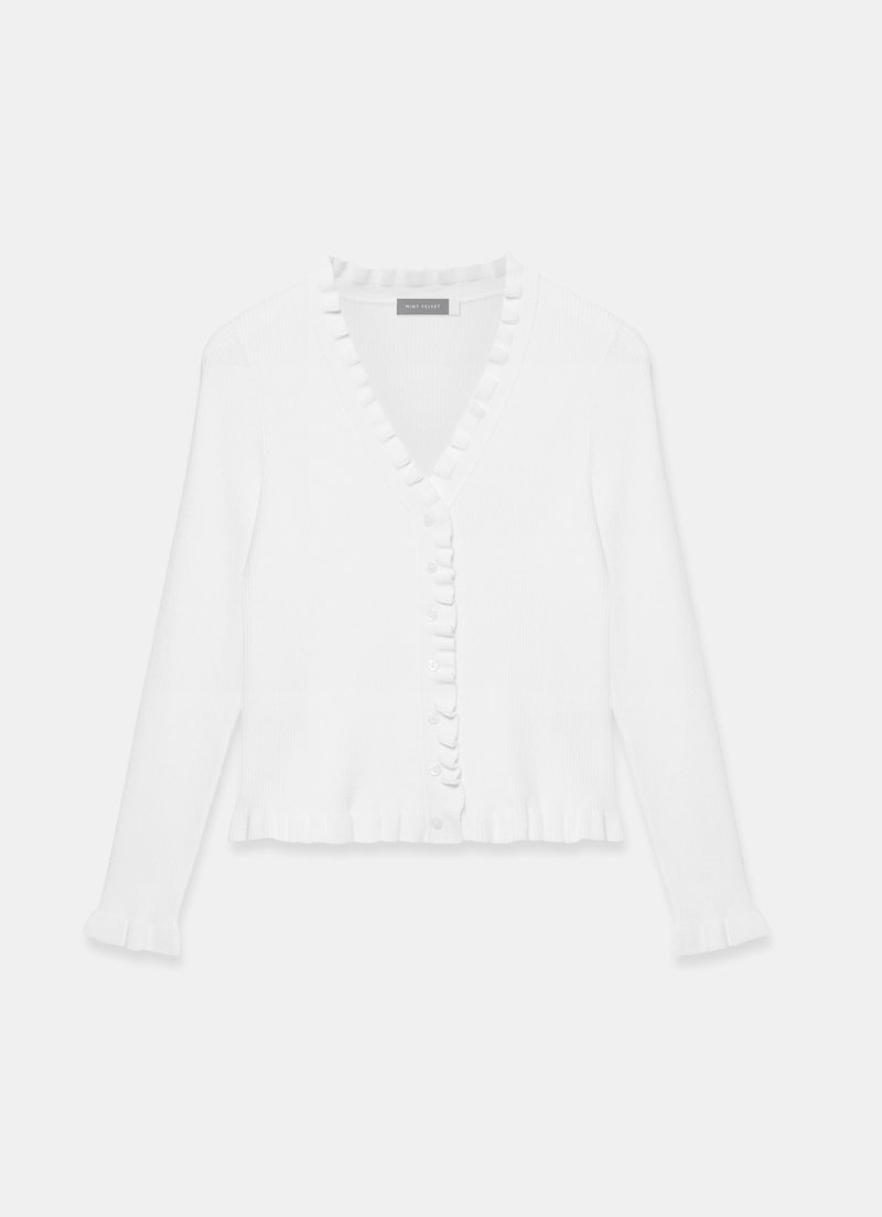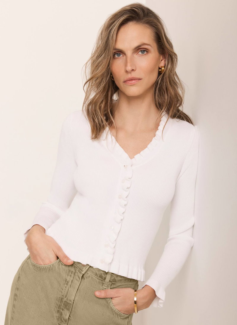 White cardigan featuring a V-neckline, long sleeves, ruffle trim with a button fastening through the front.