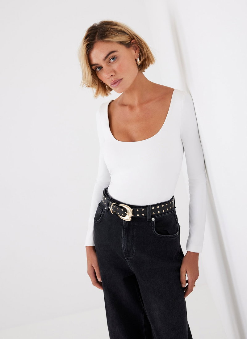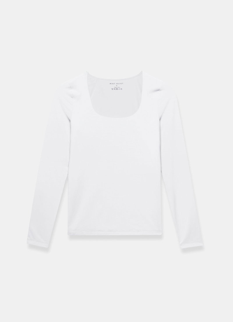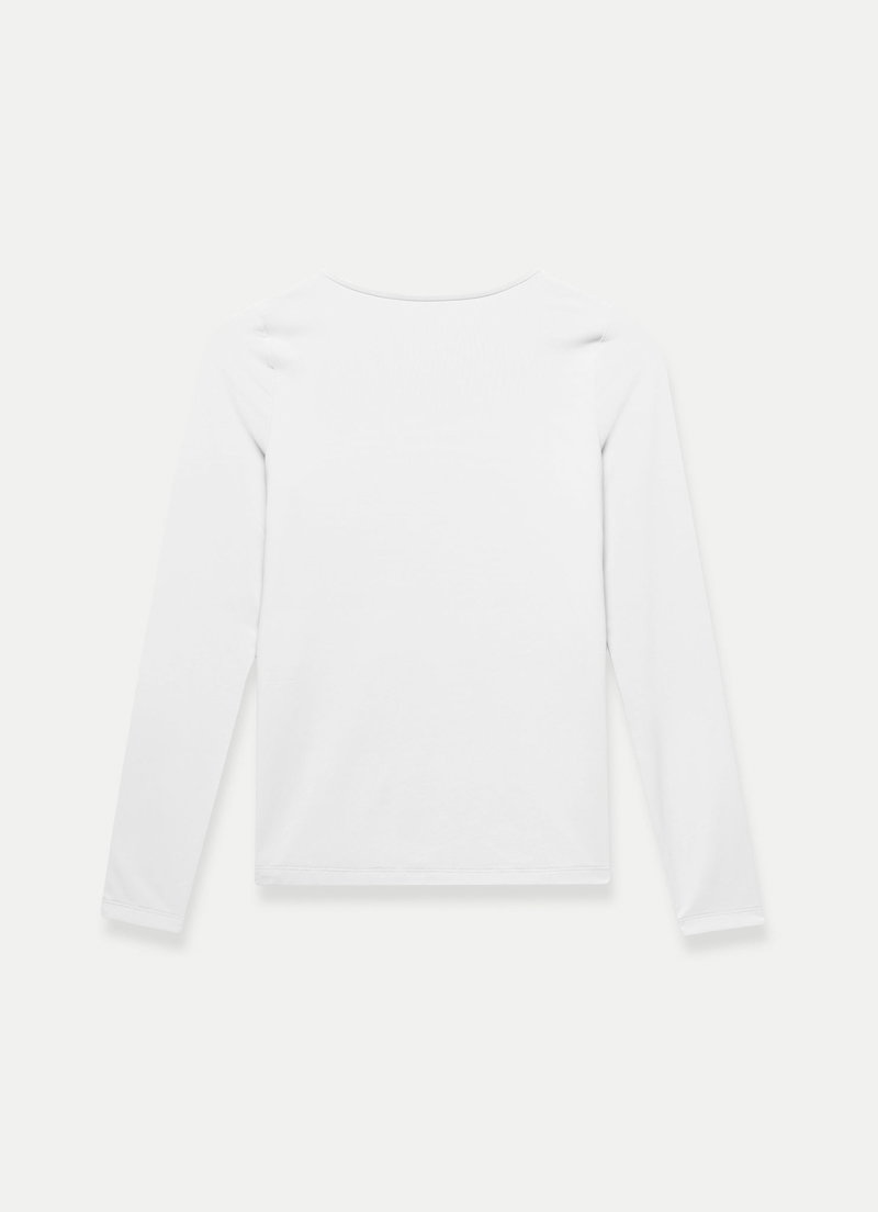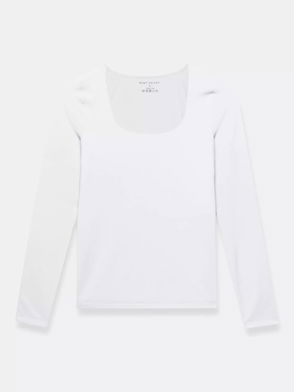 White top featuring a scoop neckline and long sleeves.