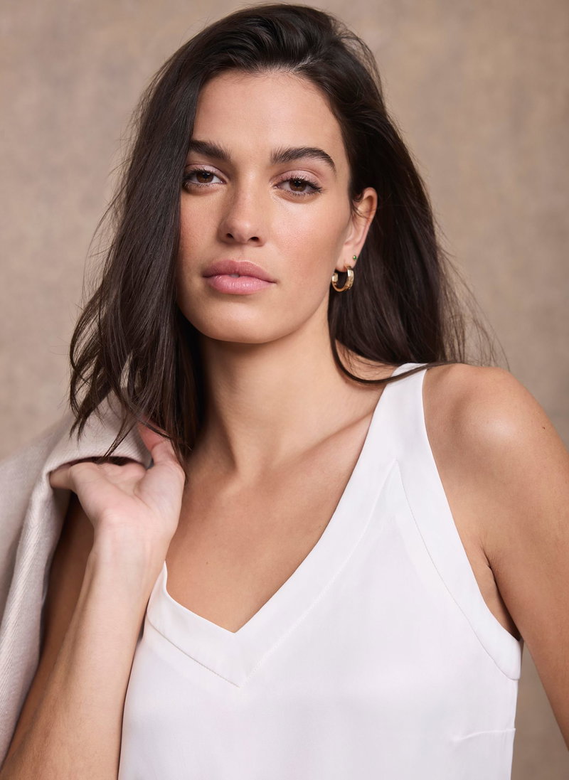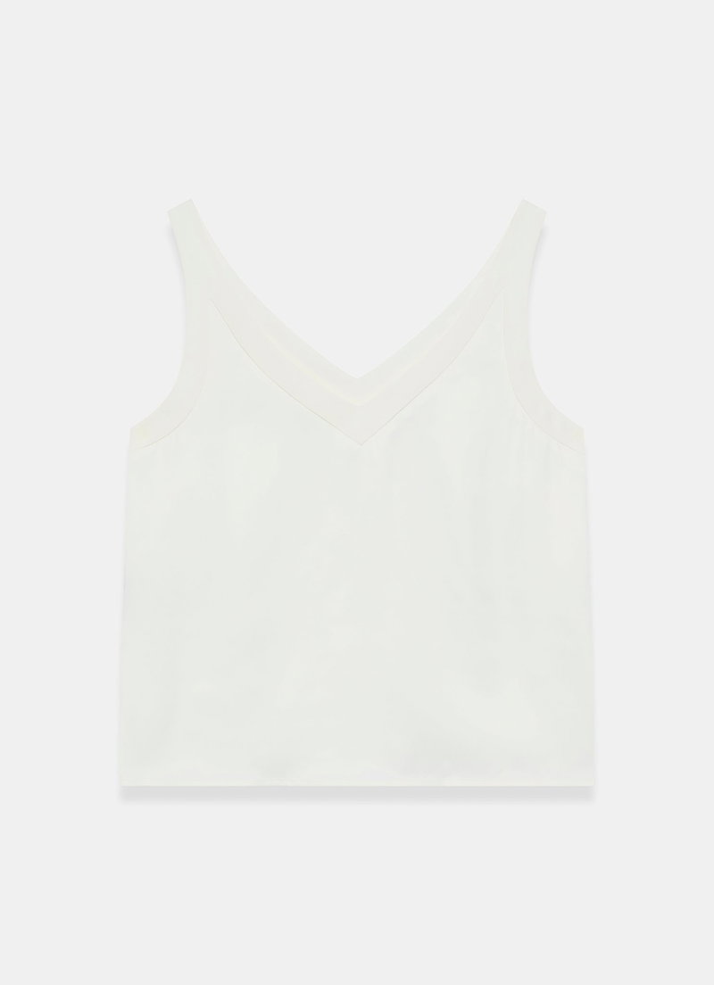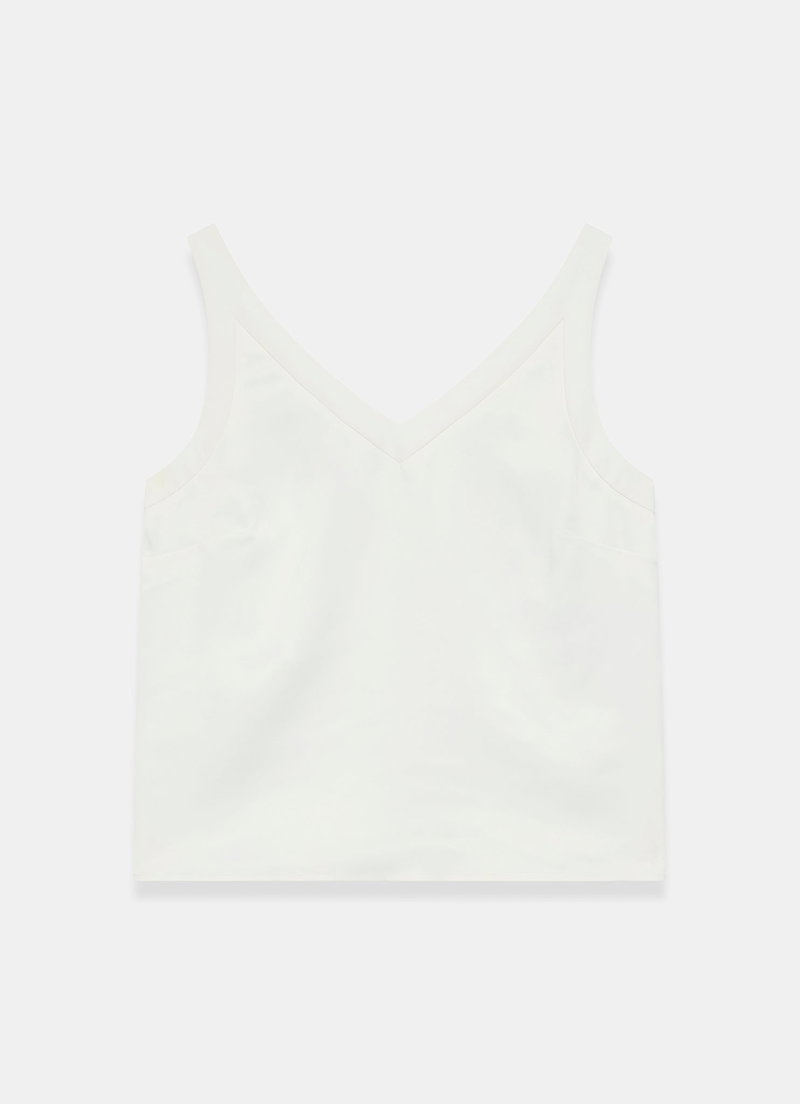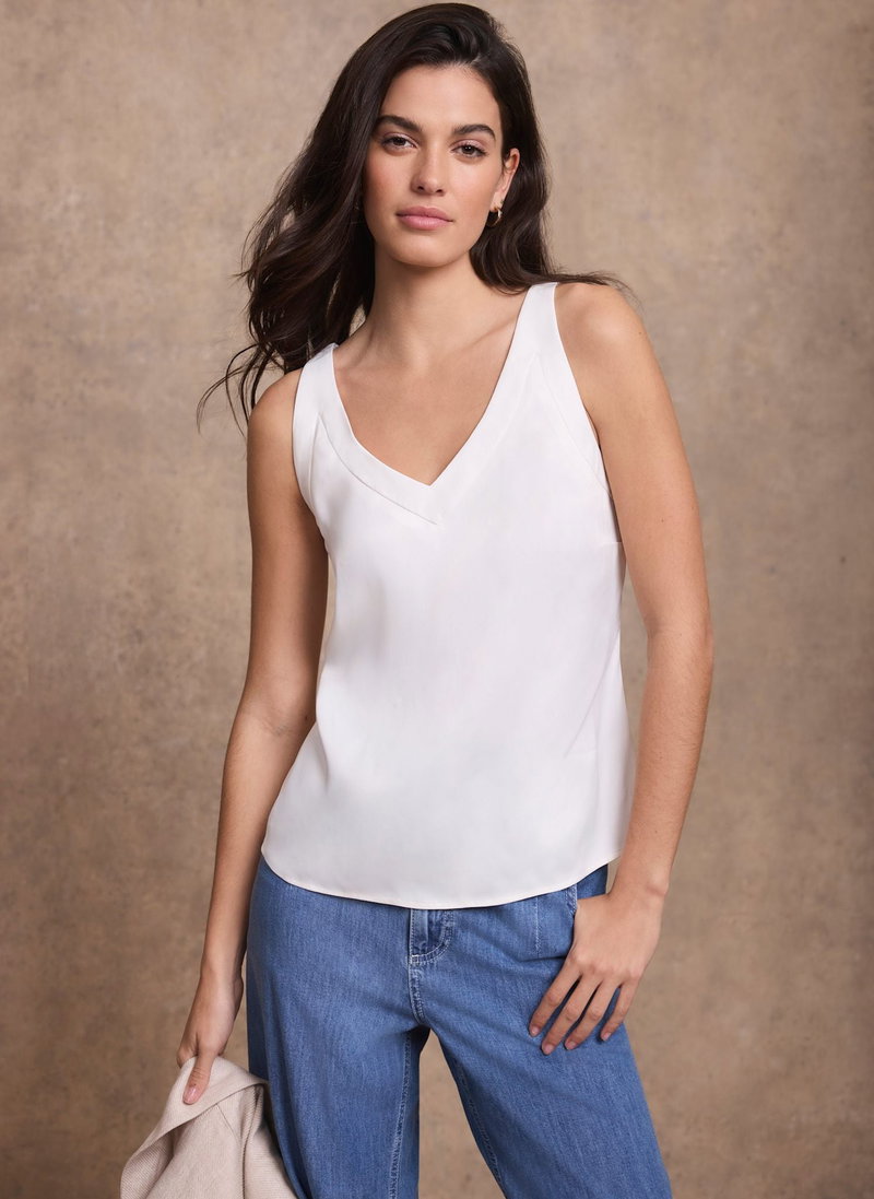 White sleeveless camisole top featuring V-neckline and trim detail.