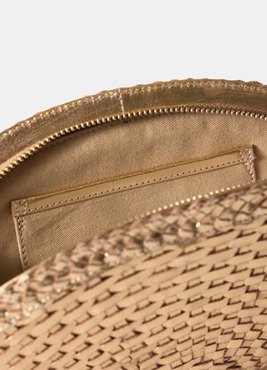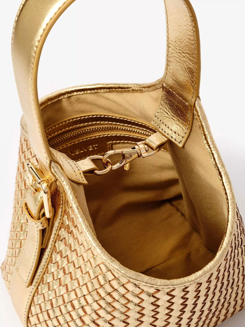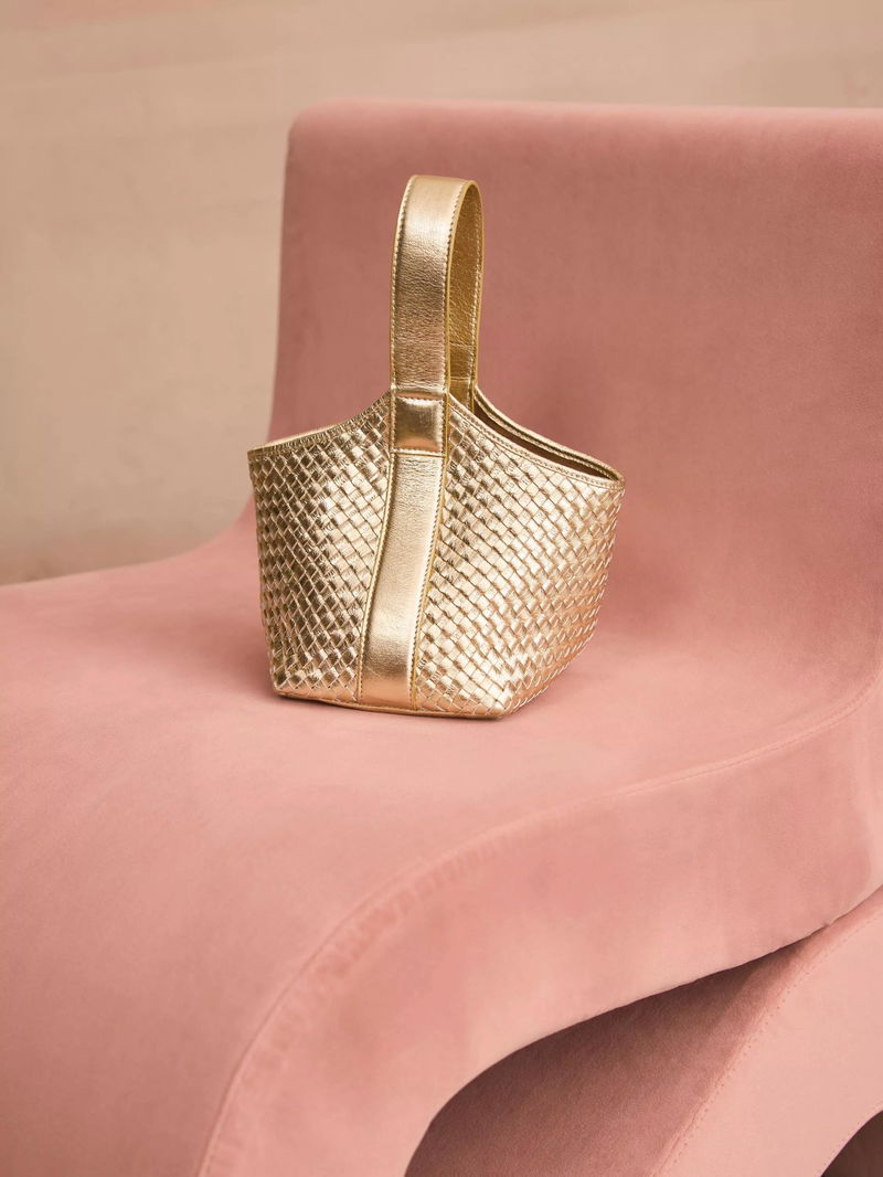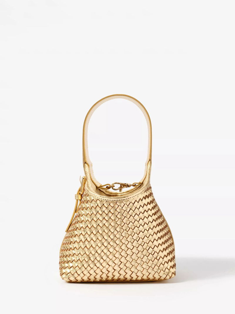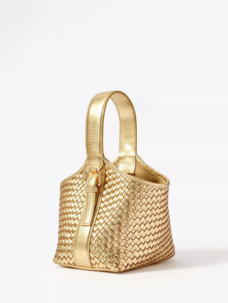 A woven leather bucket bag featuring a decorative metallic-tone buckle detail, internal slip pockets and zip pocket and an internal clip fastening to adjust the shape.