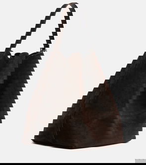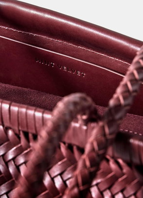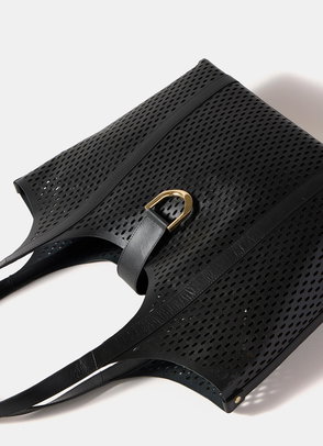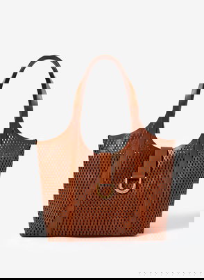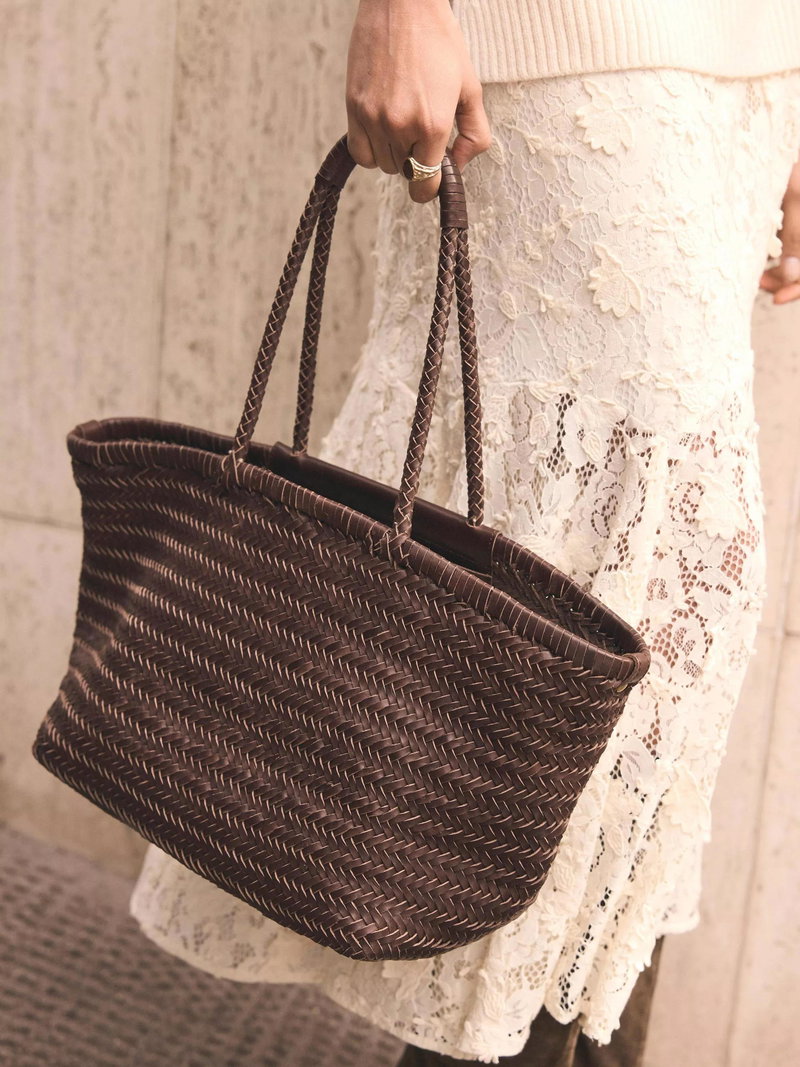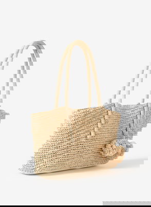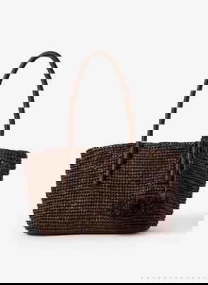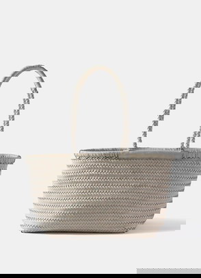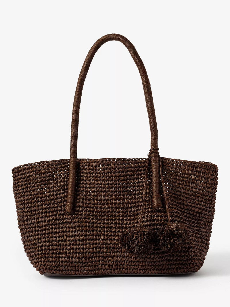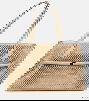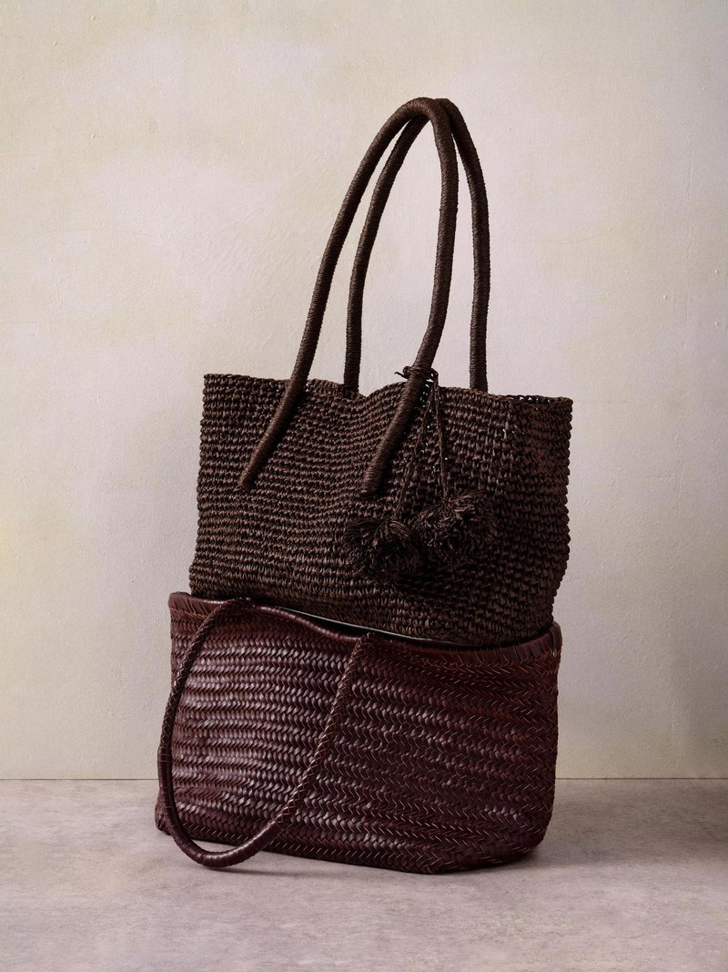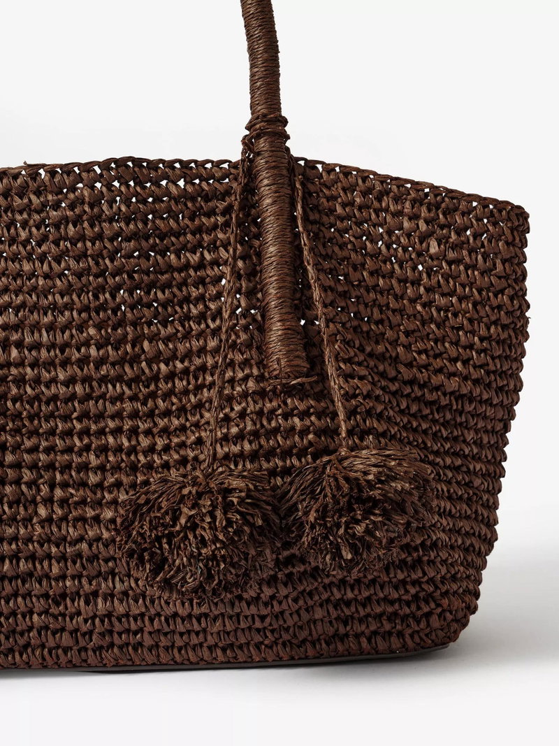 A woven tote bag featuring a removable charm and an internal zip cotton pouch attached by poppers with slip and zip pockets. -Paper