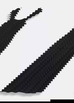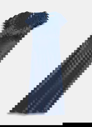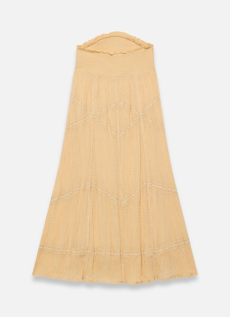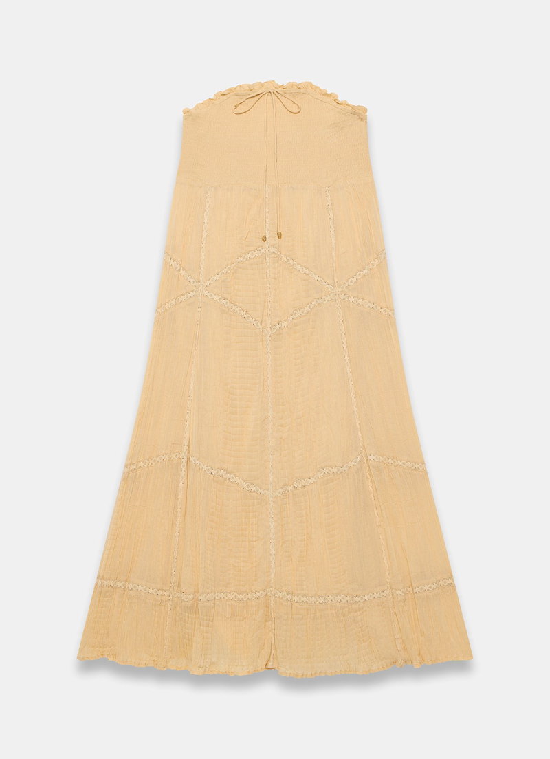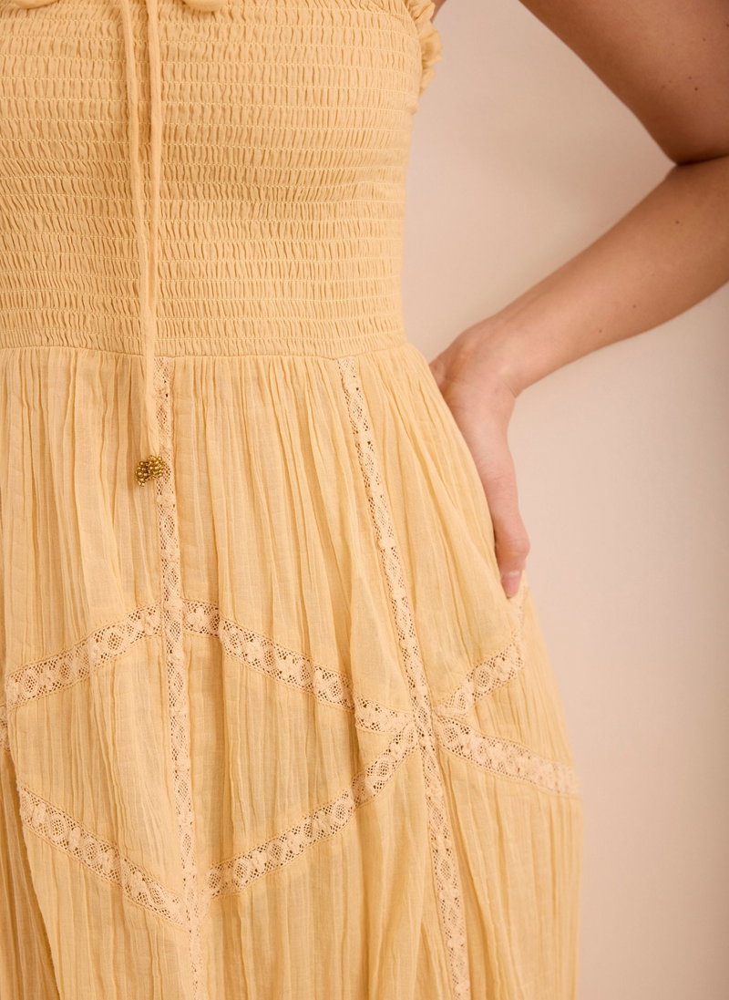 Yellow strapless dress in a midi silhouette featuring a ruffle trim bandeau neckline with a bow detailing, shirred bodice and lace trim inserts through the skirt.