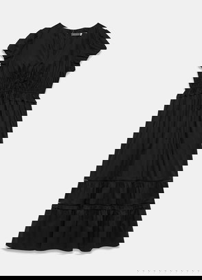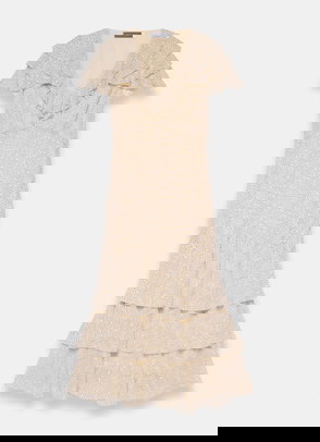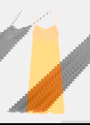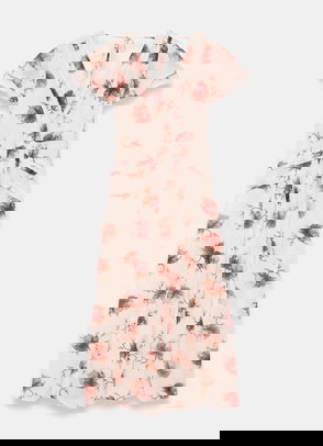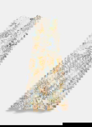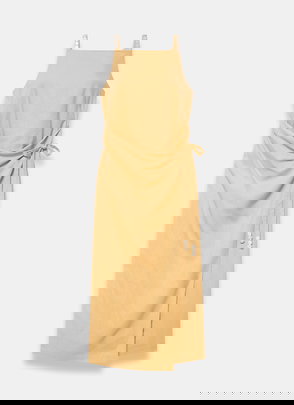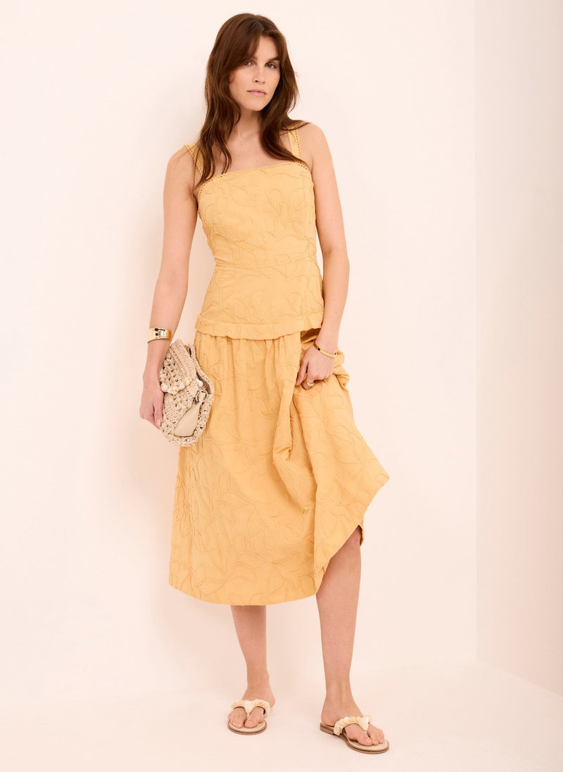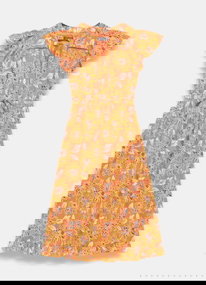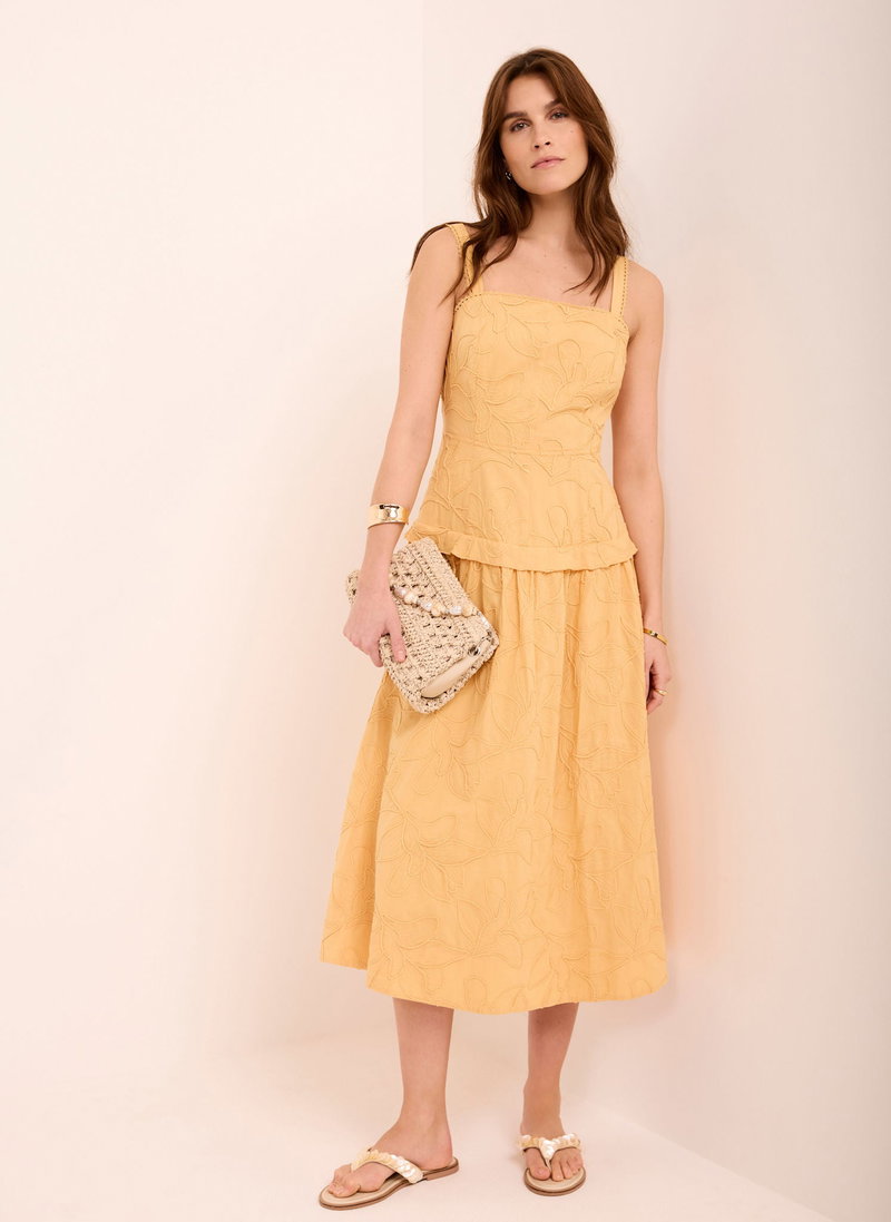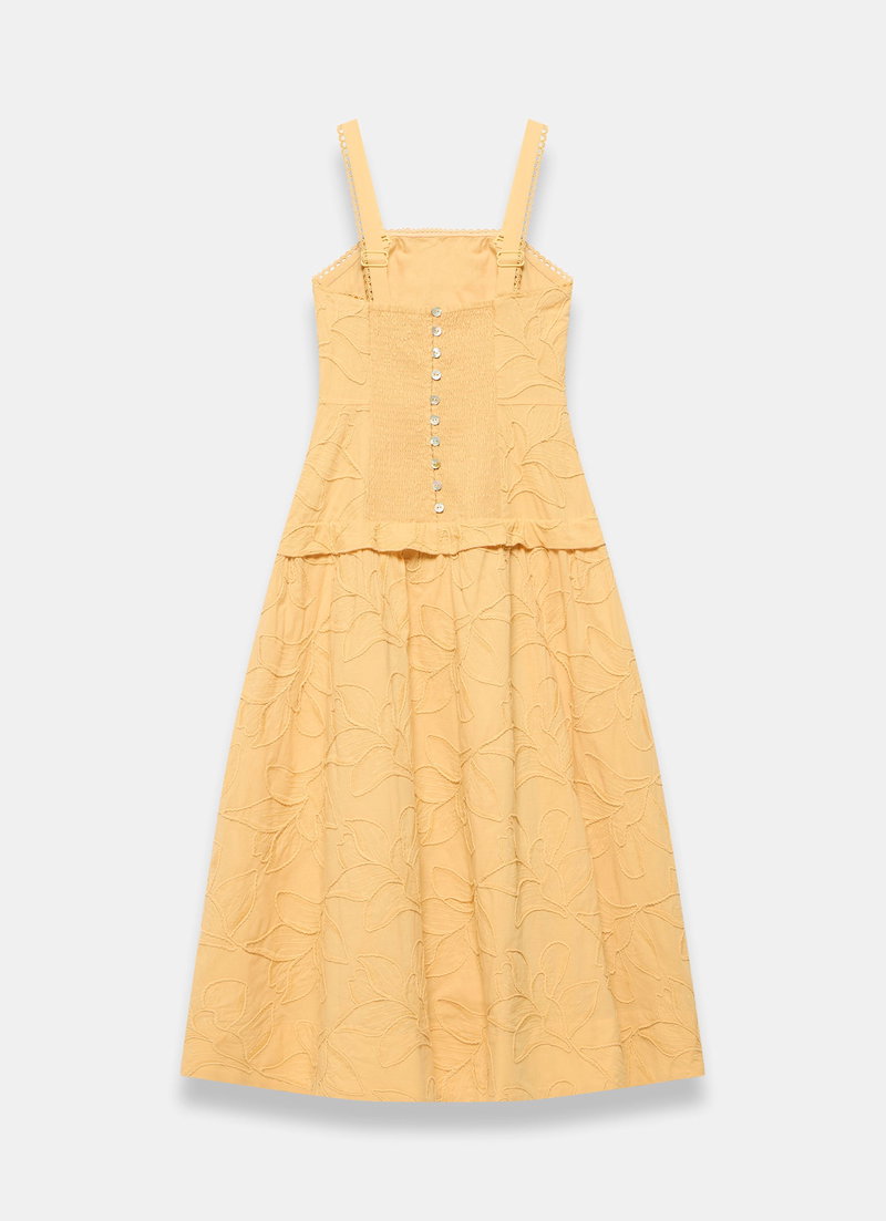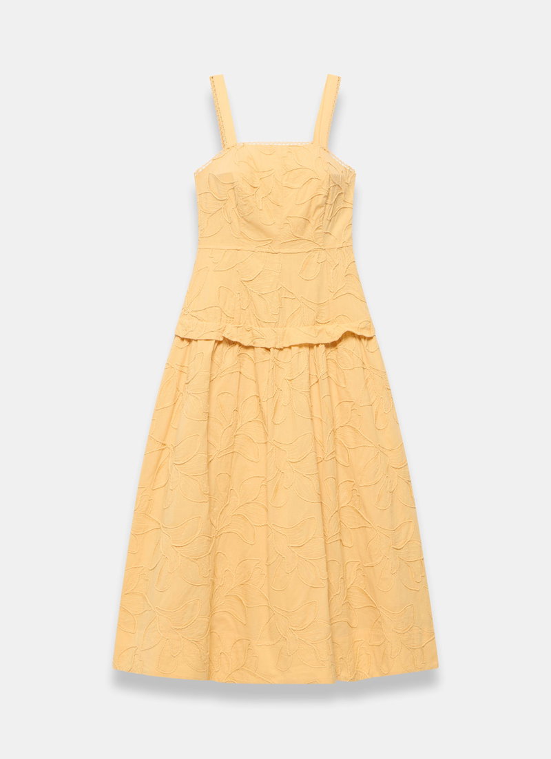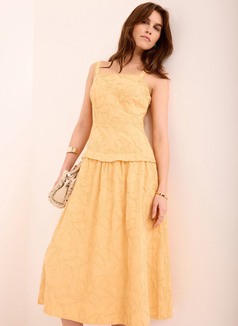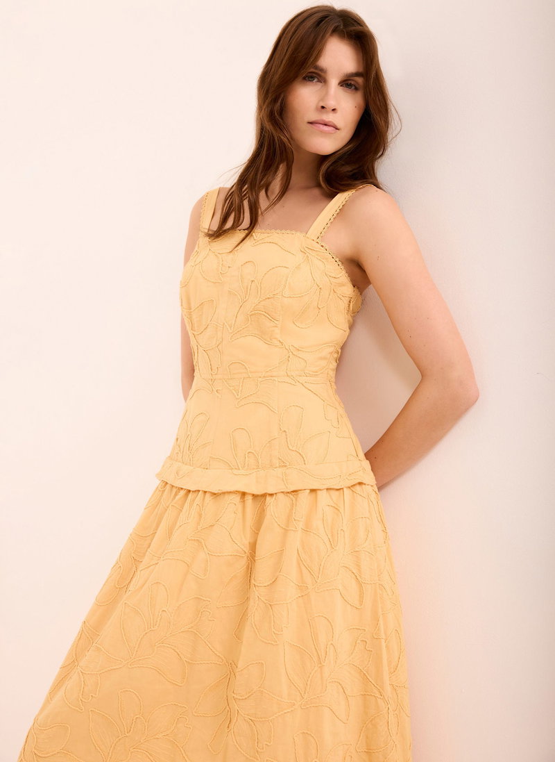 Yellow floral textured dress featuring a square neckline, thin adjustable straps, scallop trim, ruffle trim bodice, shirred back with a button fastening through the back.