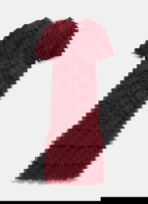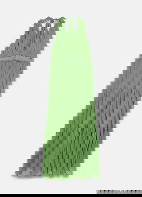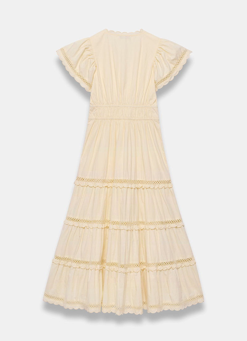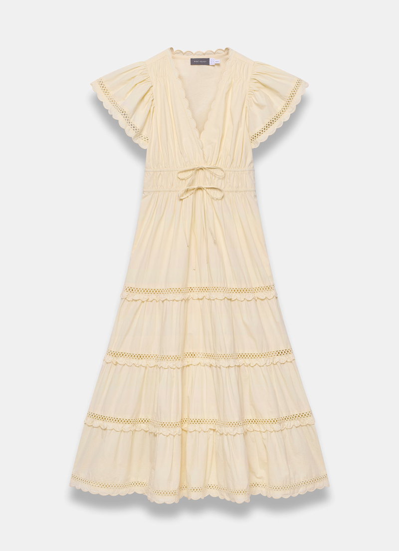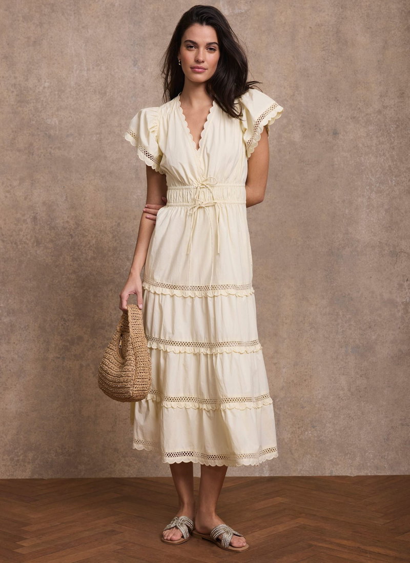 Yellow tone scallop trim dress in a maxi silhouette featuring a V-neckline, ruched design, cap sleeves, open stitch tiered detailing with tie fastenings through the waistline.