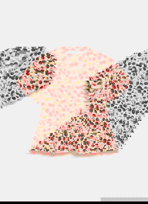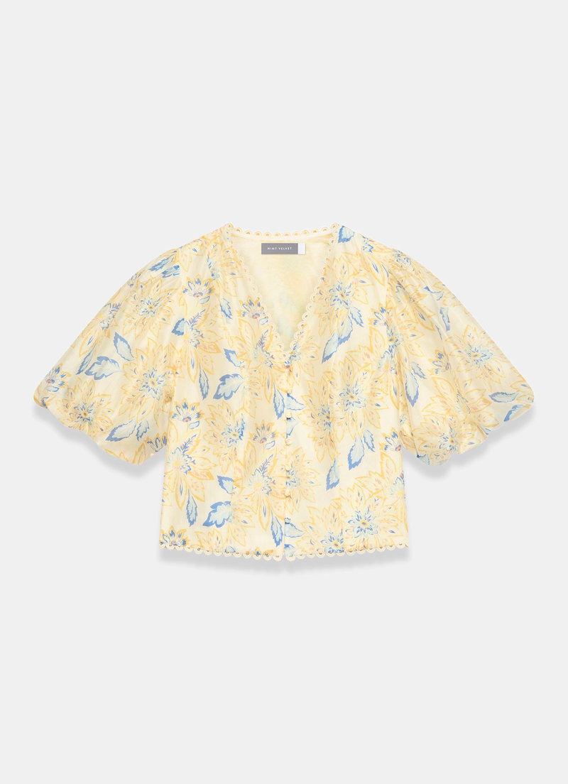 Yellow floral print blouse featuring a V-neckline, short puff sleeves, scallop trim with a button detail through the front.