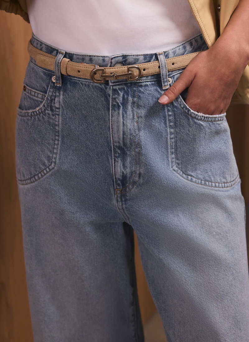 Suede belt featuring a silver-tone snaffle detail and belt loops.