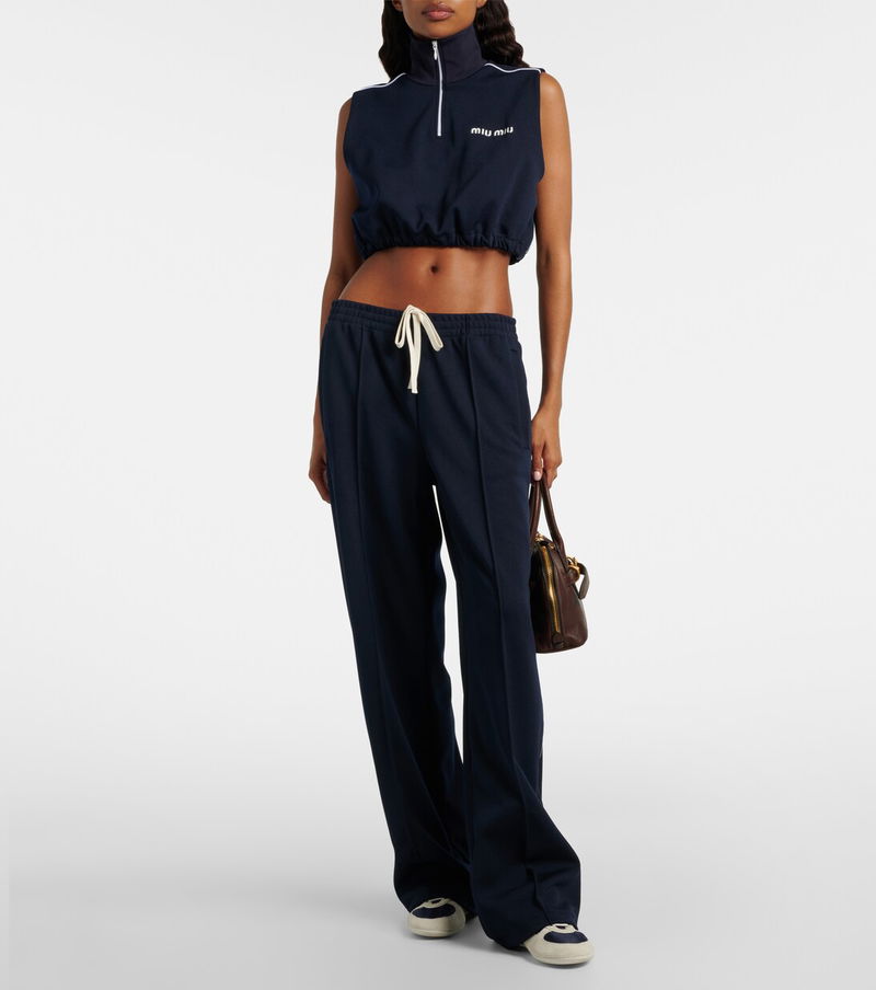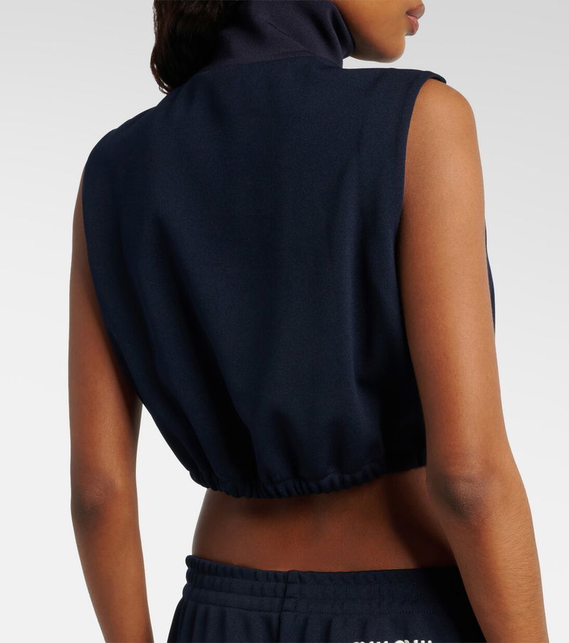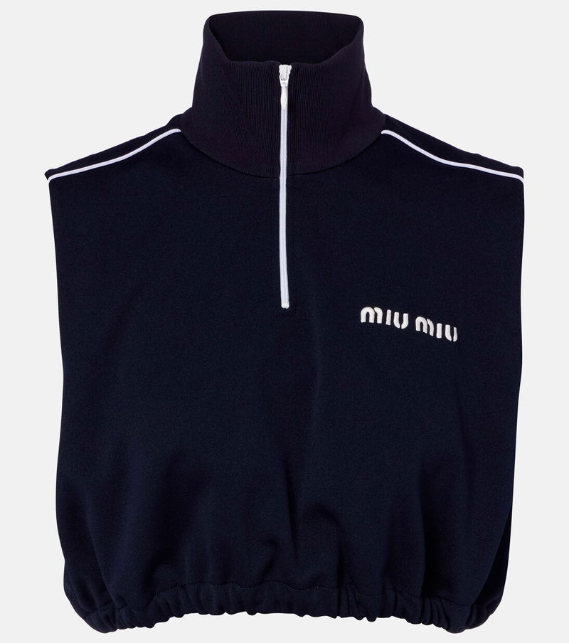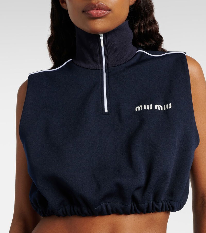 Miu Miu has taken the world by storm with its future-forward approach to design and expressions of personal identity. Crafted from jersey, this crop top boasts a half-zip silhouette with an elasticated hem, mock neckline, and logo embroidery on the chest.