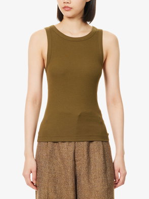Uninhibited and deliberately subversive: these are the hallmarks of Miuccia Prada’s Miu Miu. This top is ribbed-knit in a soft cotton blend, featuring a sleeveless, open-back silhouette and an all-over green-and-yellow striped print.