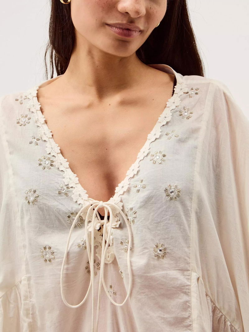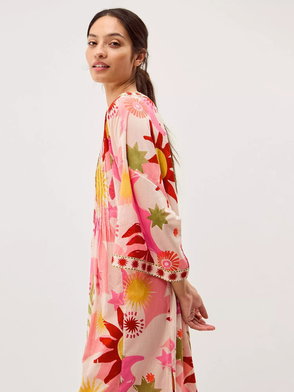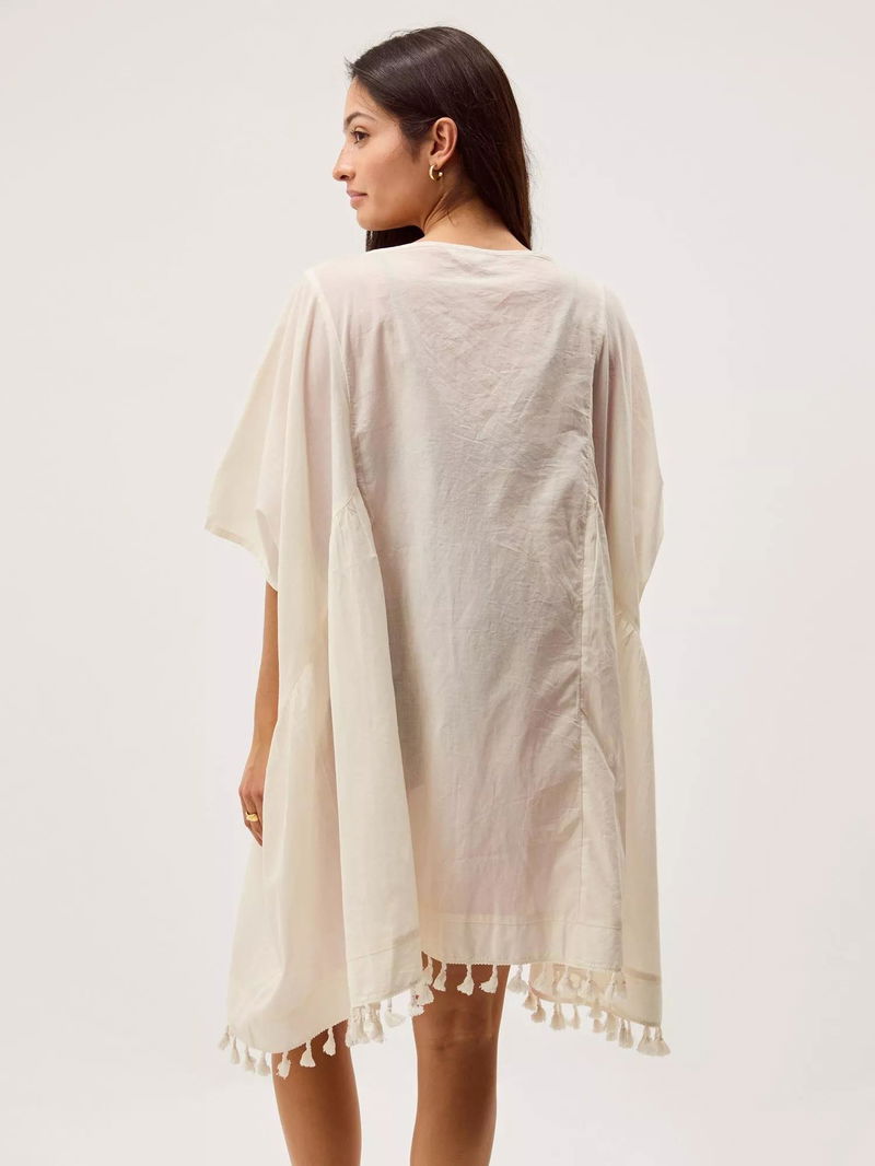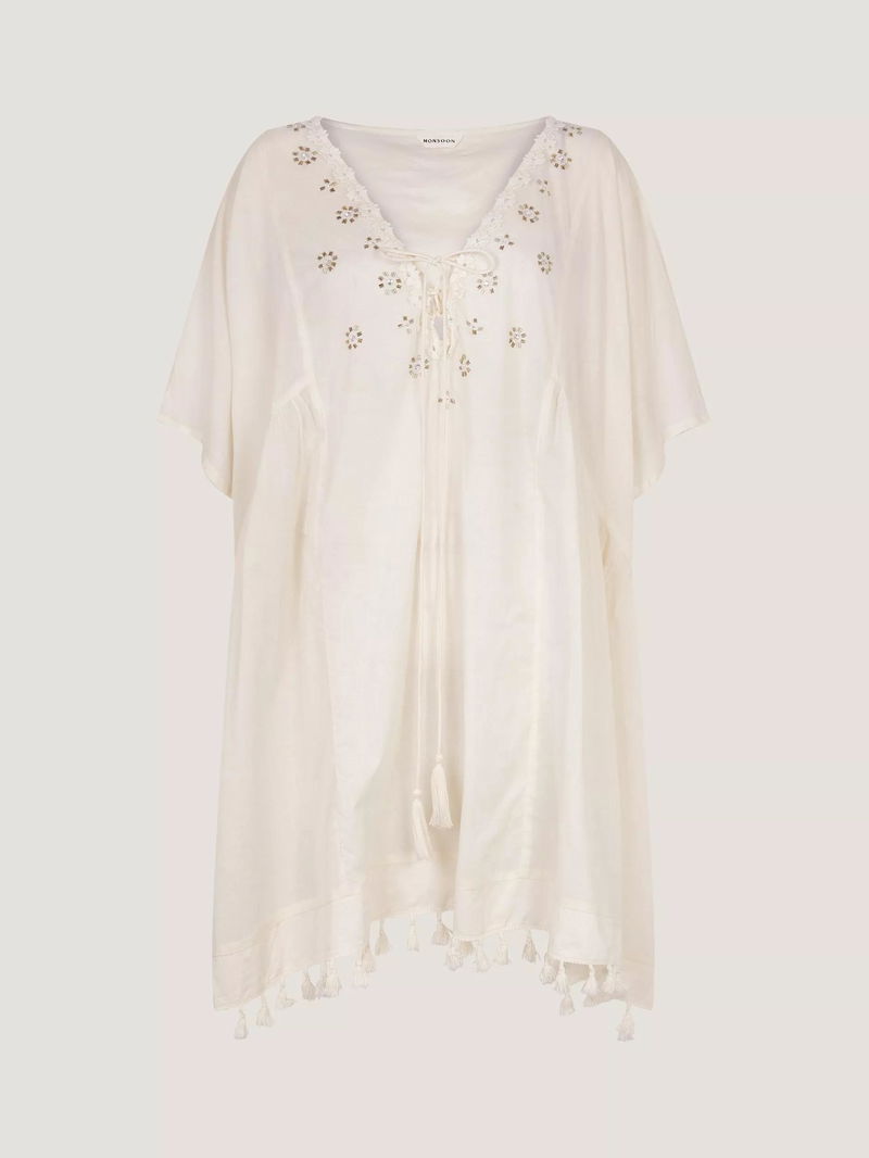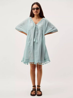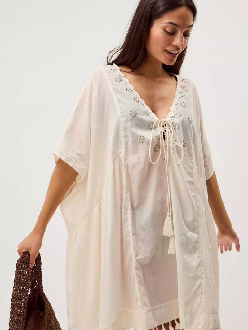 Like air con you can wear. Being best dressed, even at the pool, is within reach whilst flaunting this mini kaftan. Designed with applique flowers and sequin embellishments around the V-neckline, it features an extra-long tassel tie and relaxed sleeves, so you comfortably lie on the sun lounger. Finished with mini tassels along the short hem, all your friends will want a try, too.