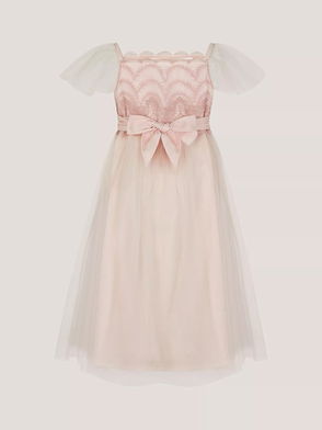 Bring on party season. Designed in glitzy tulle, this dress features angelic sleeves, white embroidered flowers and a frilly under-hem for a floaty finish. Fastens at the back with a button.