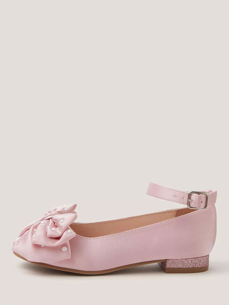 Kids' Pearl Bow Satin Flat Shoes, Pink