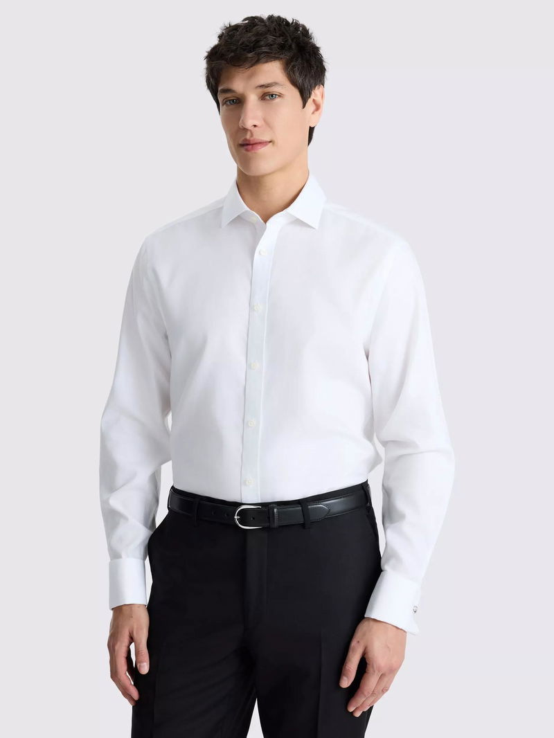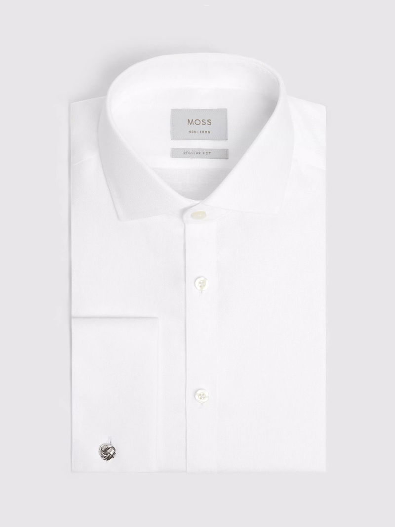 With a non-iron finish that'll have it looking pristine straight from the hanger, this regular-fit white shirt is a piece that'll work hard for your investment. The soft cotton has a classic Oxford weave, while double cuffs allow room for personalisation with your choice of links.