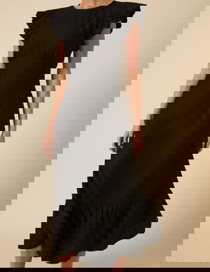 This black midi dress is cut from floral devoré velvet with a luxe feel. It has a soft milkmaid neckline with a keyhole tie, adjustable straps for the perfect fit and falls to a slim silhouette.