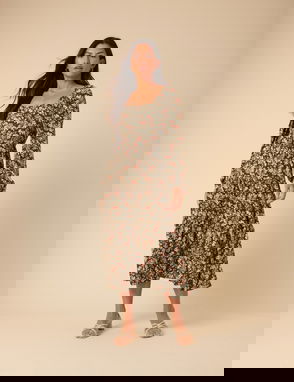 This black midi dress features yellow florals and a threaded scoop neckline trimmed with white lace. The empire waist shapes the slim-fit bodice before falling to a relaxed skirt. It's finished with a tie-back detail.