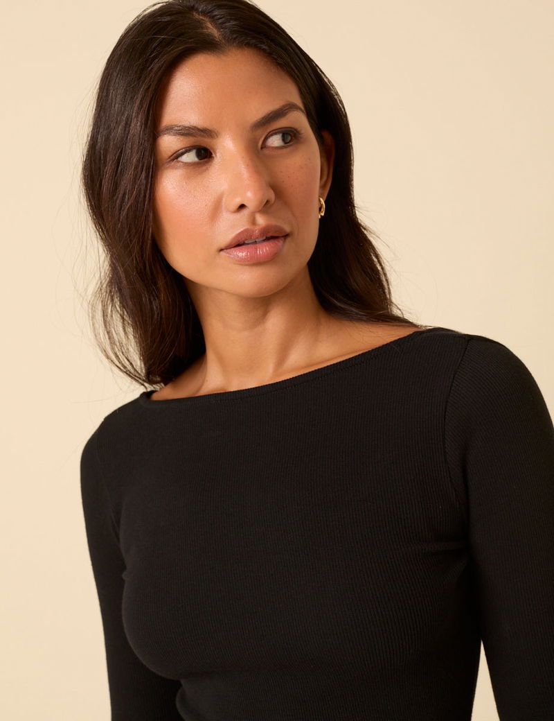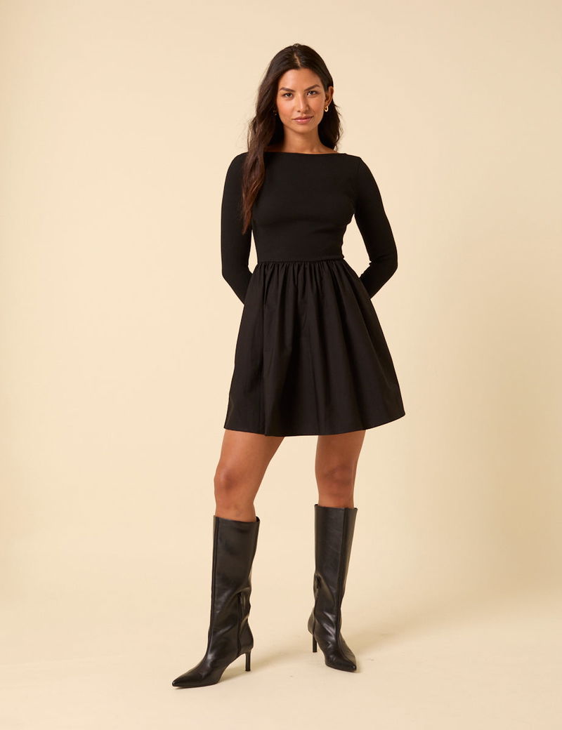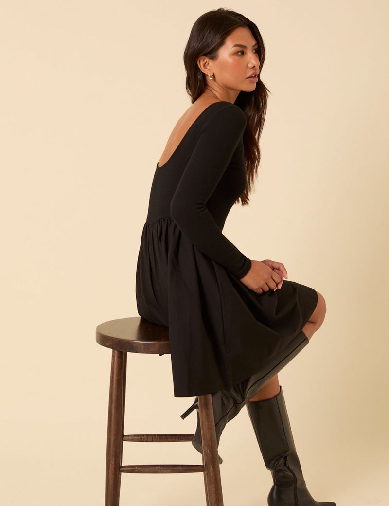 This black mini dress features a boat neckline, long sleeves and a scoop back. The soft and fitted jersey bodice falls to an A-line cotton skirt.