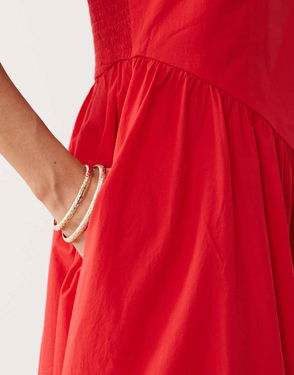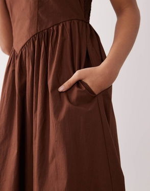 Crafted from soft pure cotton, this chocolate brown midi dress features a square neckline and seams through the fitted bodice, shaped by the shirred back. The drop waist falls to a relaxed skirt with side pockets.