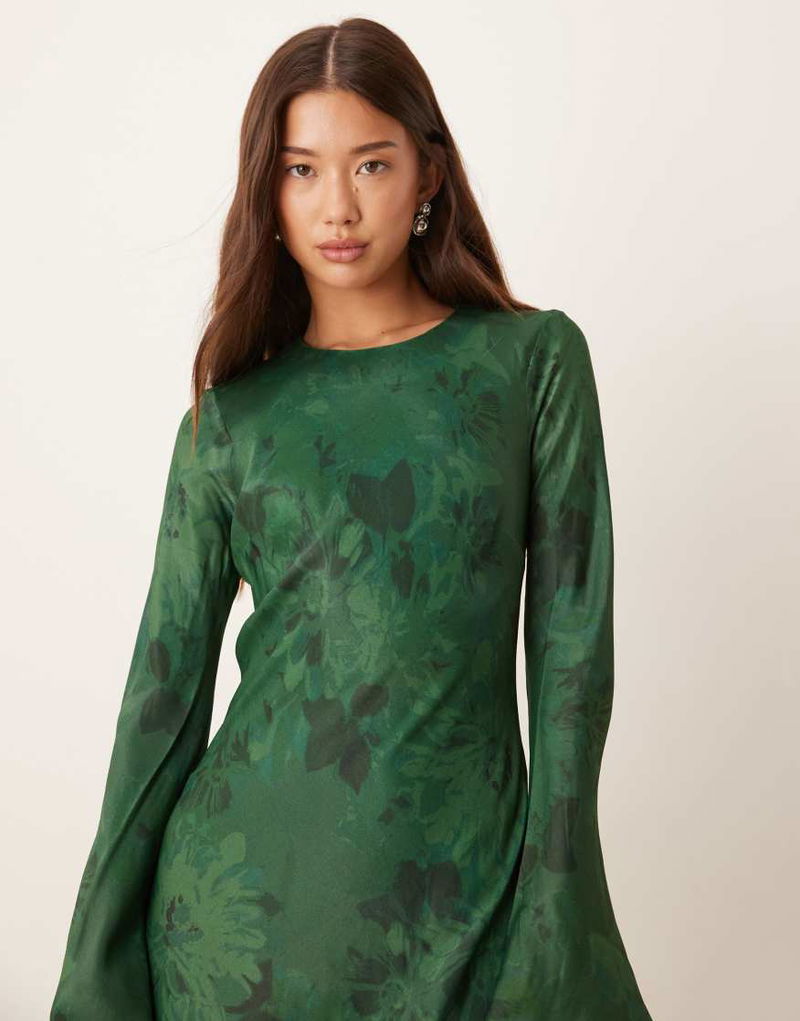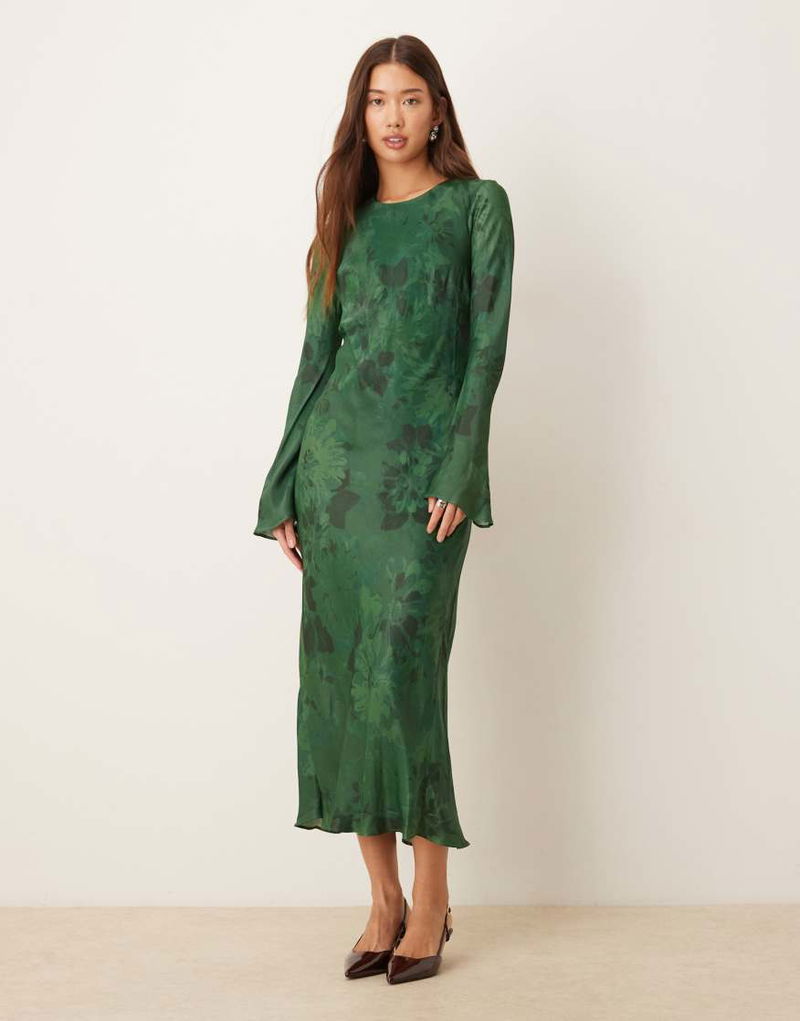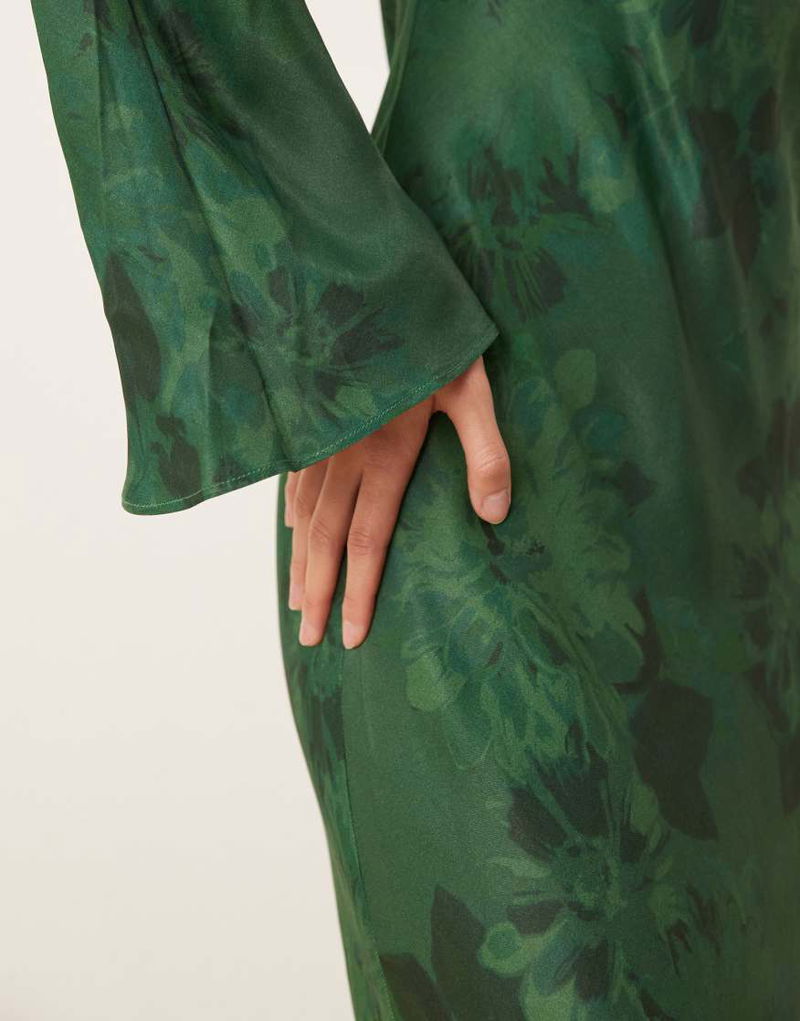 Clarissa Jacquard Floral Bell Sleeve Midi Dress In Dark Green
