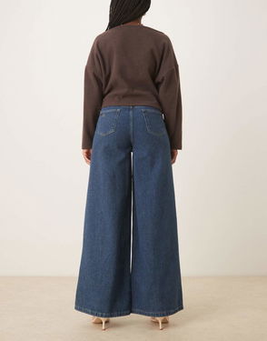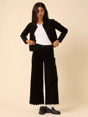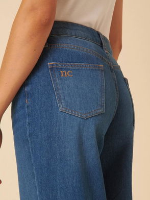 Floral design Wide leg High rise Belt loops Five pockets Raw-cut hem.