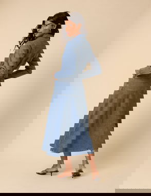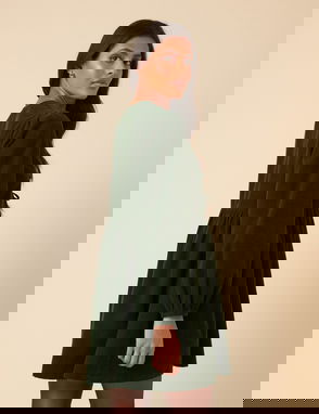 In mid-wash blue, this denim mini dress features a round neckline with a tie front and long balloon sleeves. It falls to a relaxed silhouette with side pockets.