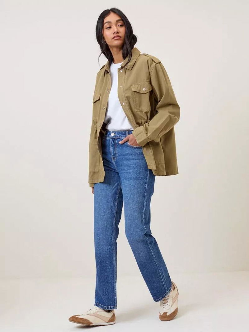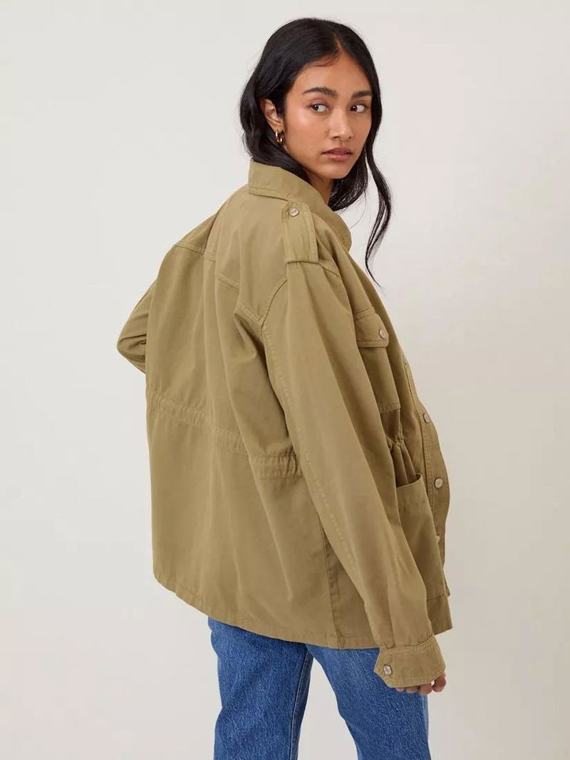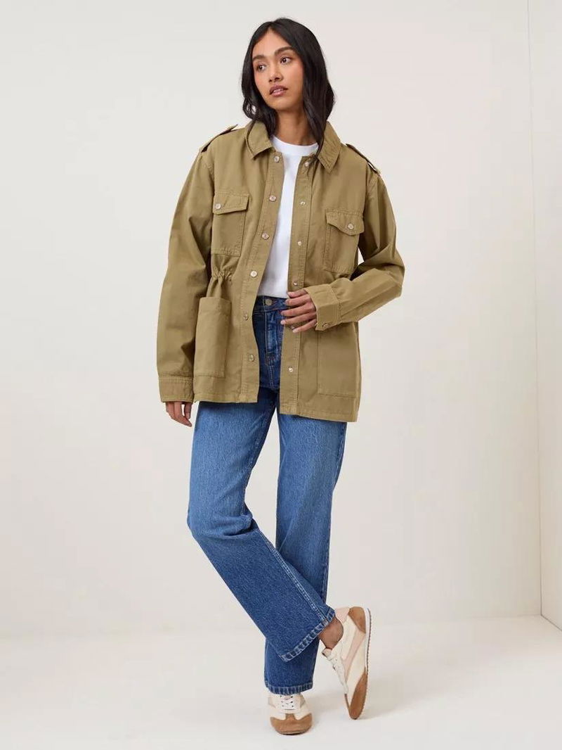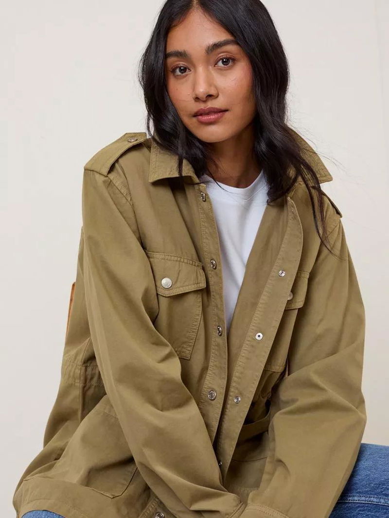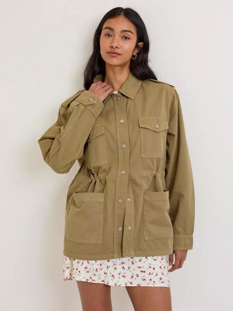 Crafted from soft cotton twill, this utility jacket features a collar, epaulettes, cargo pockets and silver-toned popper buttons. Designed with an elasticated waist and internal drawstring tie to cinch the waist, size up for a relaxed fit.