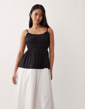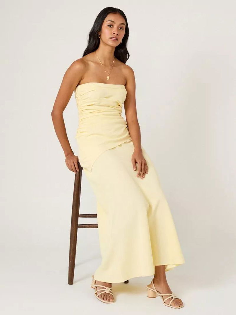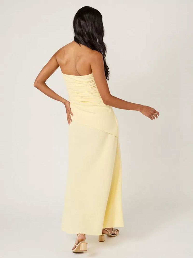 An asymmetrical cut with side ruching shapes the bodice before it falls to a relaxed skirt.