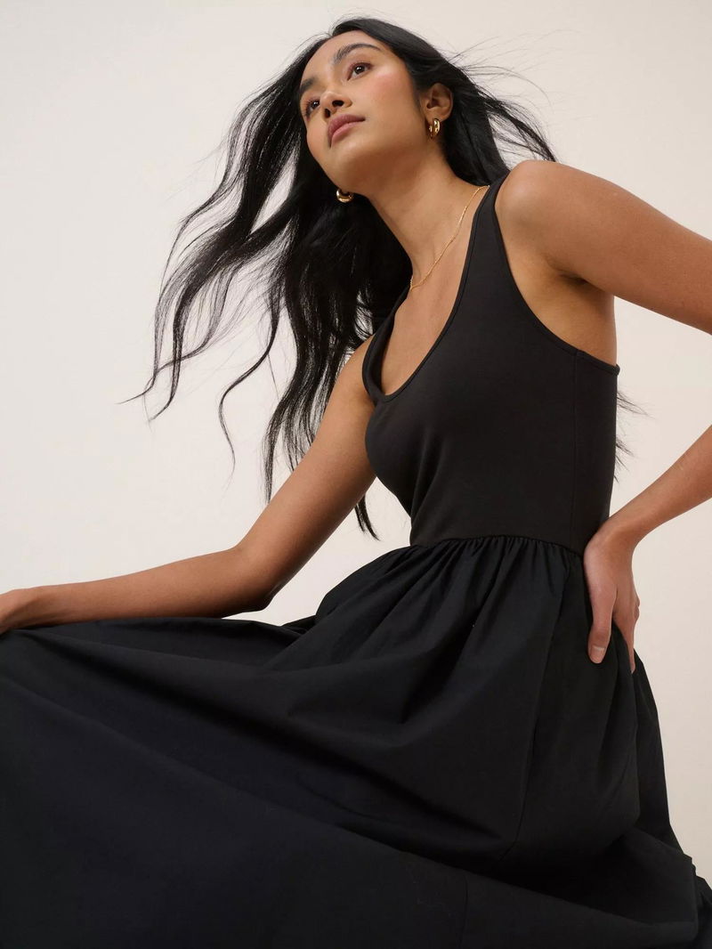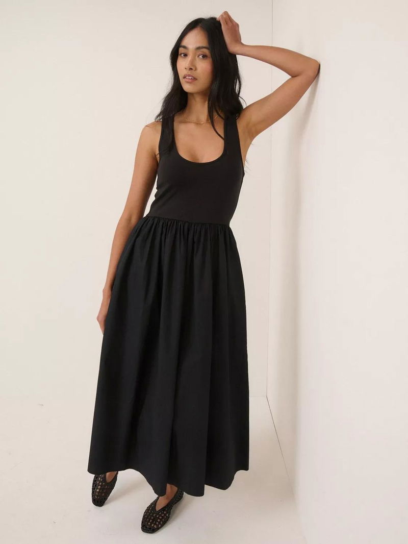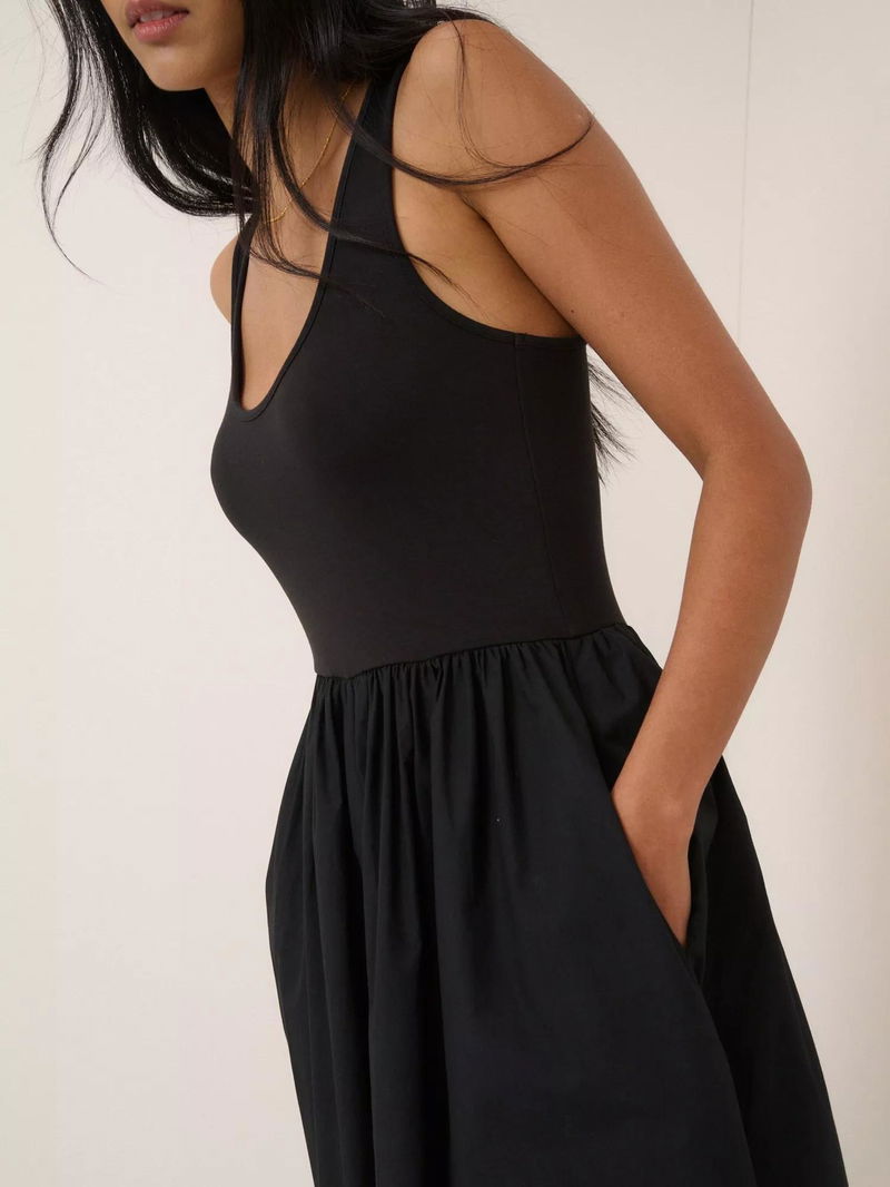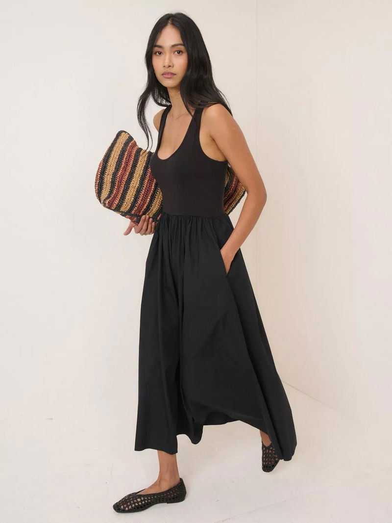 This midi dress features a fitted jersey bodice with a scoop neckline and racer-style back. It falls to a cotton skirt in a full, relaxed silhouette.