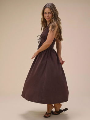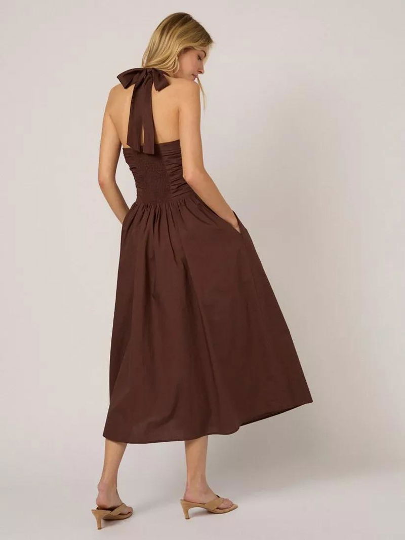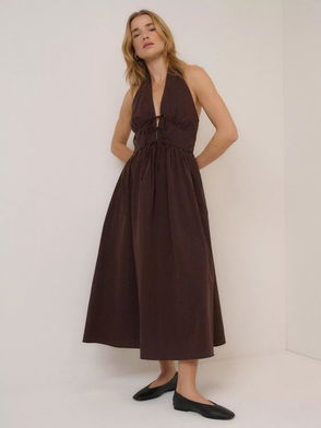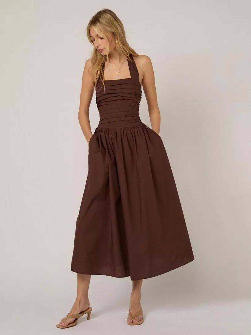 This midi dress features a tie-fastening halterneck and a pleated bodice. The shirred back and dropped waist add shape before it falls to a relaxed skirt.