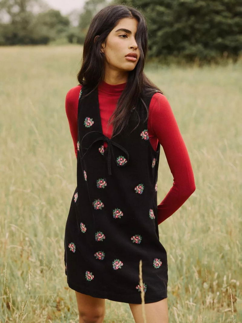 Nila Embroidered Floral Cotton Cord Pinafore Mini Dress, Black/Multi